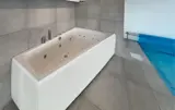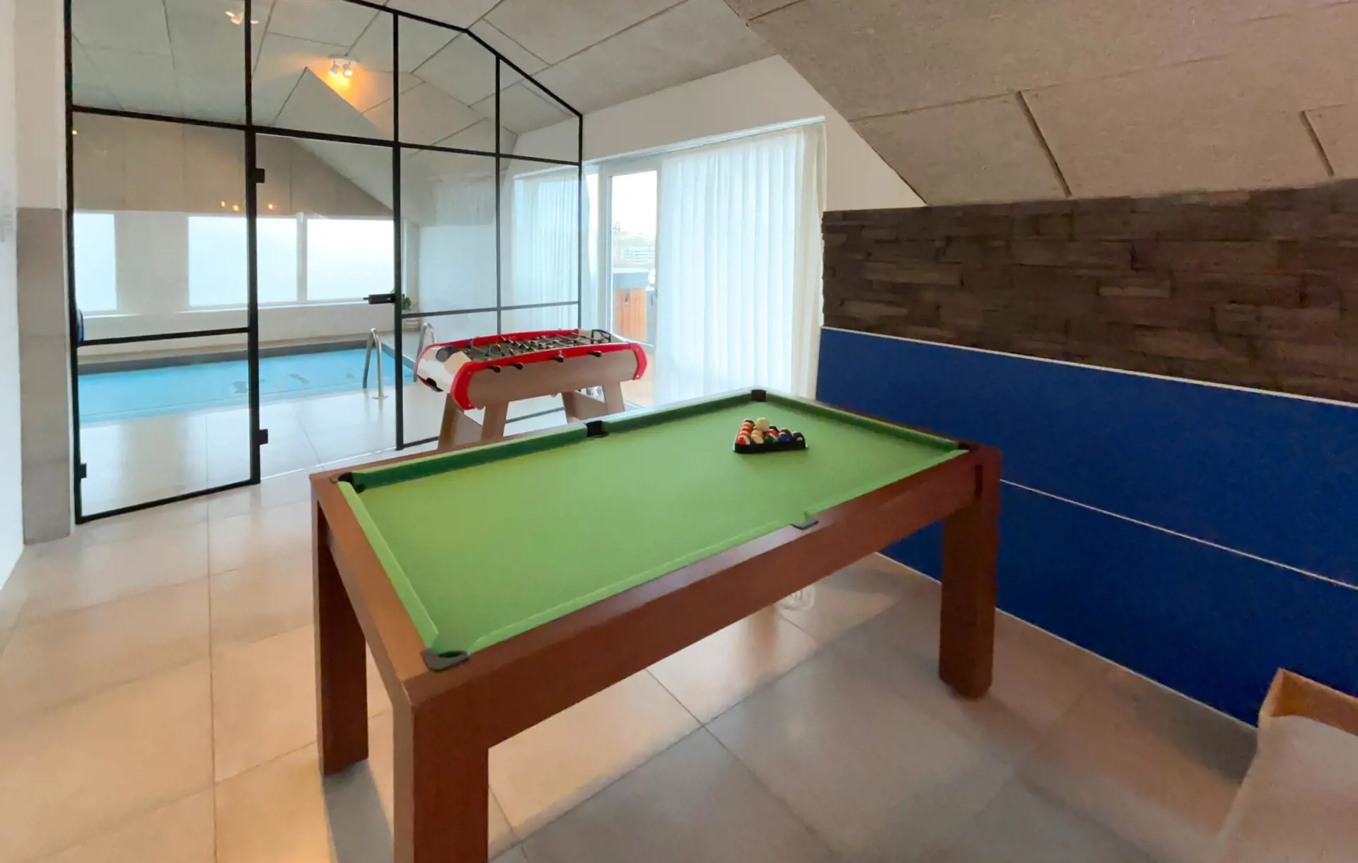 Machen Sie es sich im Wohnraum auf dem bequemen Sofa gemütlich und nutzen Sie die moderne Küche, um gemeinsam zu kochen. Der lange Esstisch bietet Platz für gesellige Runden. Entspannen Sie im Poolbereich und ziehen Sie unabhängig vom Wetter Ihre Bahnen. Gönnen Sie sich danach wohltuende Wärme in der Sauna oder ein Bad im Whirlpool. Fordern Sie Ihre Mitreisenden am Billardtisch heraus und schaffen Sie abwechslungsreiche Urlaubstage für Groß und Klein.