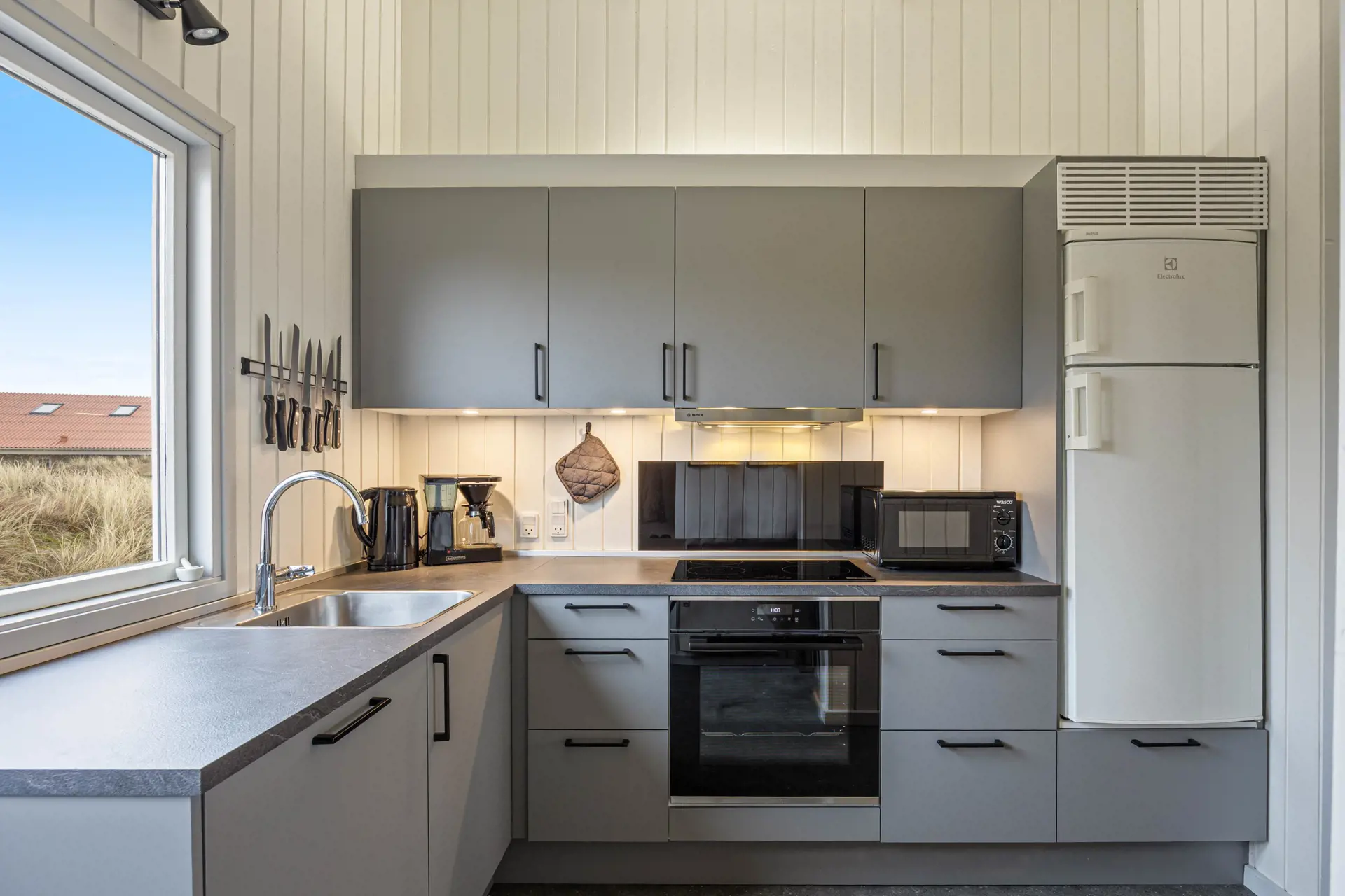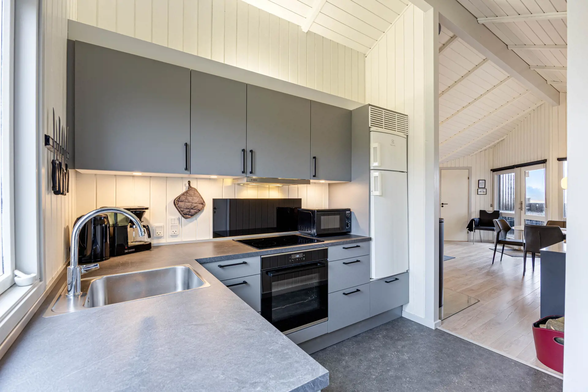 In der Küche findet ihr alles, was ihr für entspannte Urlaubstage benötigt. Eine Spülmaschine erleichtert den Alltag, während Waschmaschine und Trockner zusätzlichen Komfort bieten.