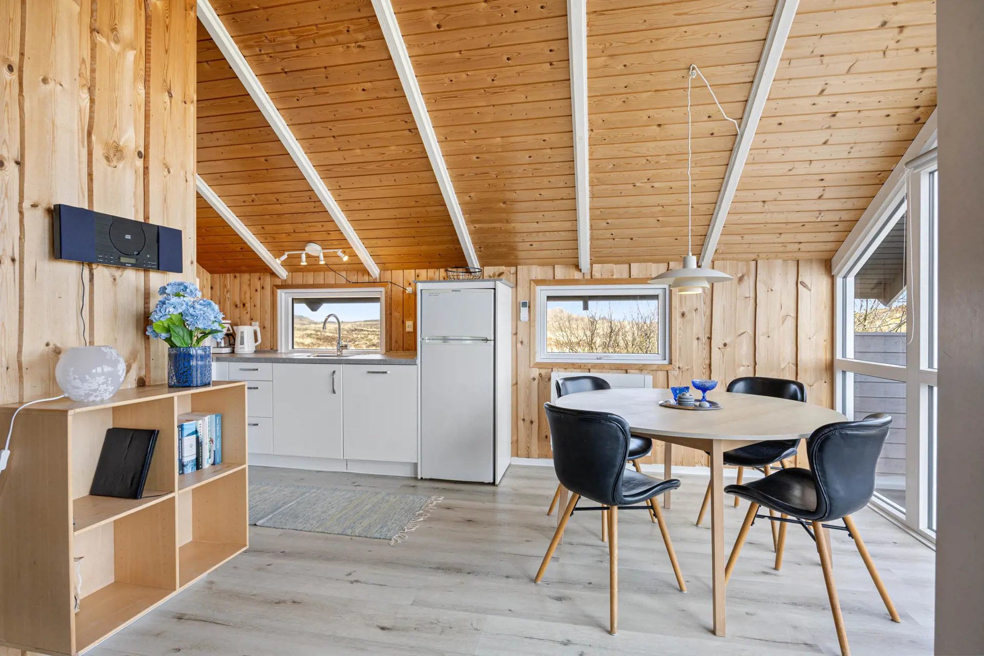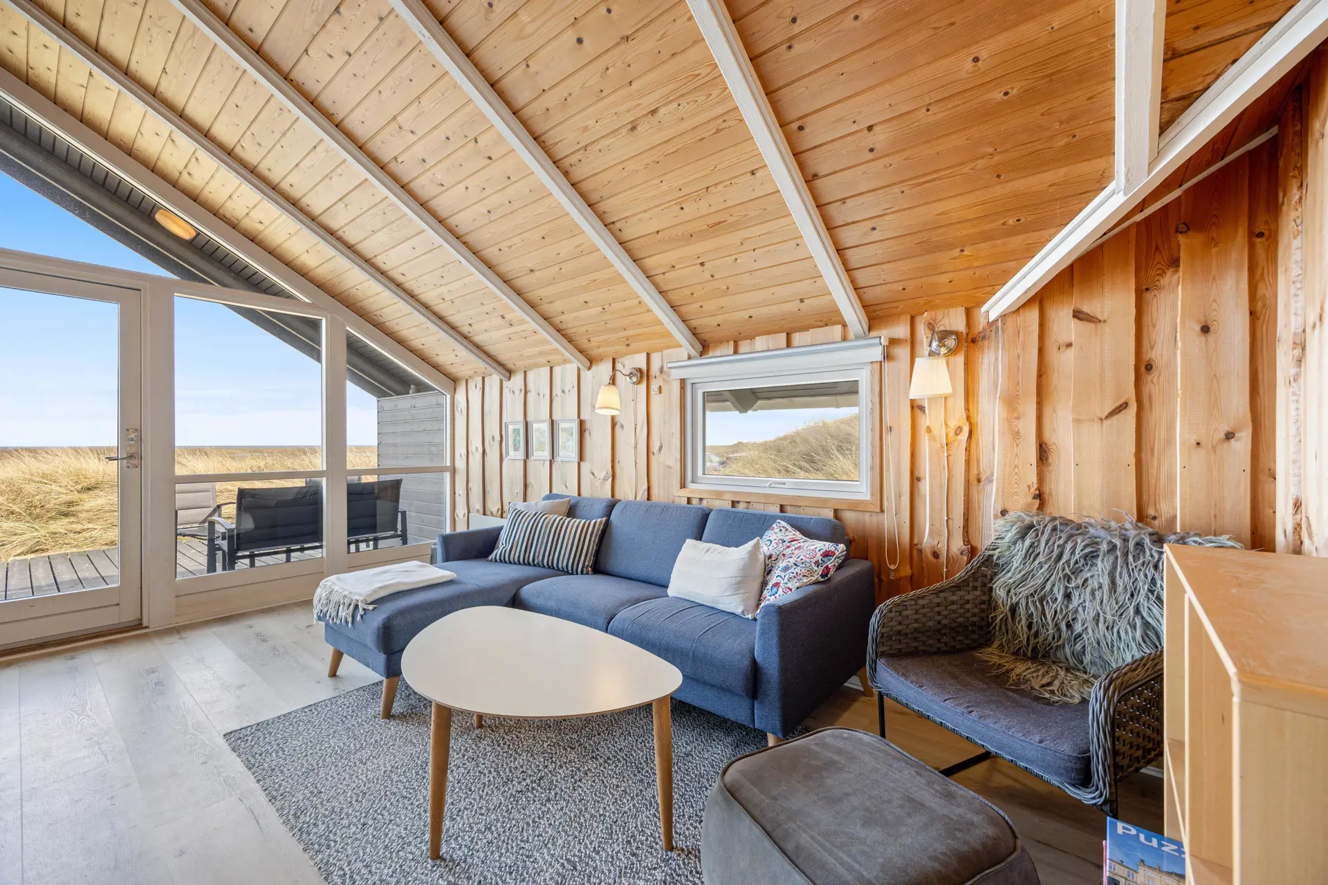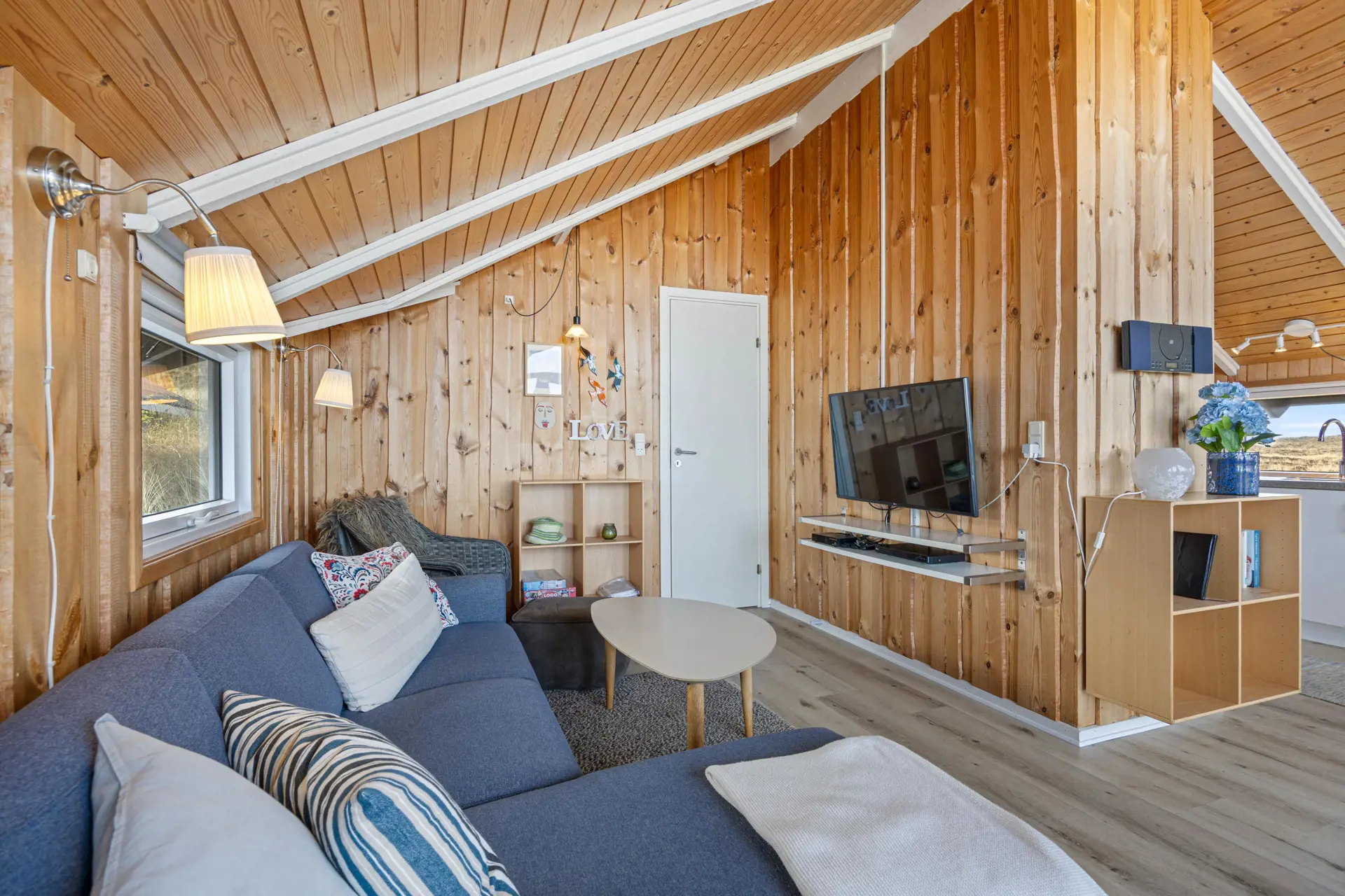 Der Wohnbereich im Ferienhaus in Sønder Klitvej 139 B bildet den zentralen Treffpunkt des Ferienhauses. Hier könnt ihr gemeinsam entspannen, den Tag planen oder den Abend ausklingen lassen. Große Fenster sorgen für viel Licht im Inneren und lassen euch die besondere Atmosphäre der Umgebung auch vom Wohnbereich aus erleben.