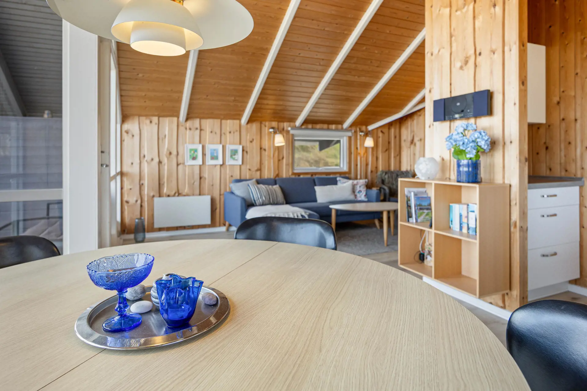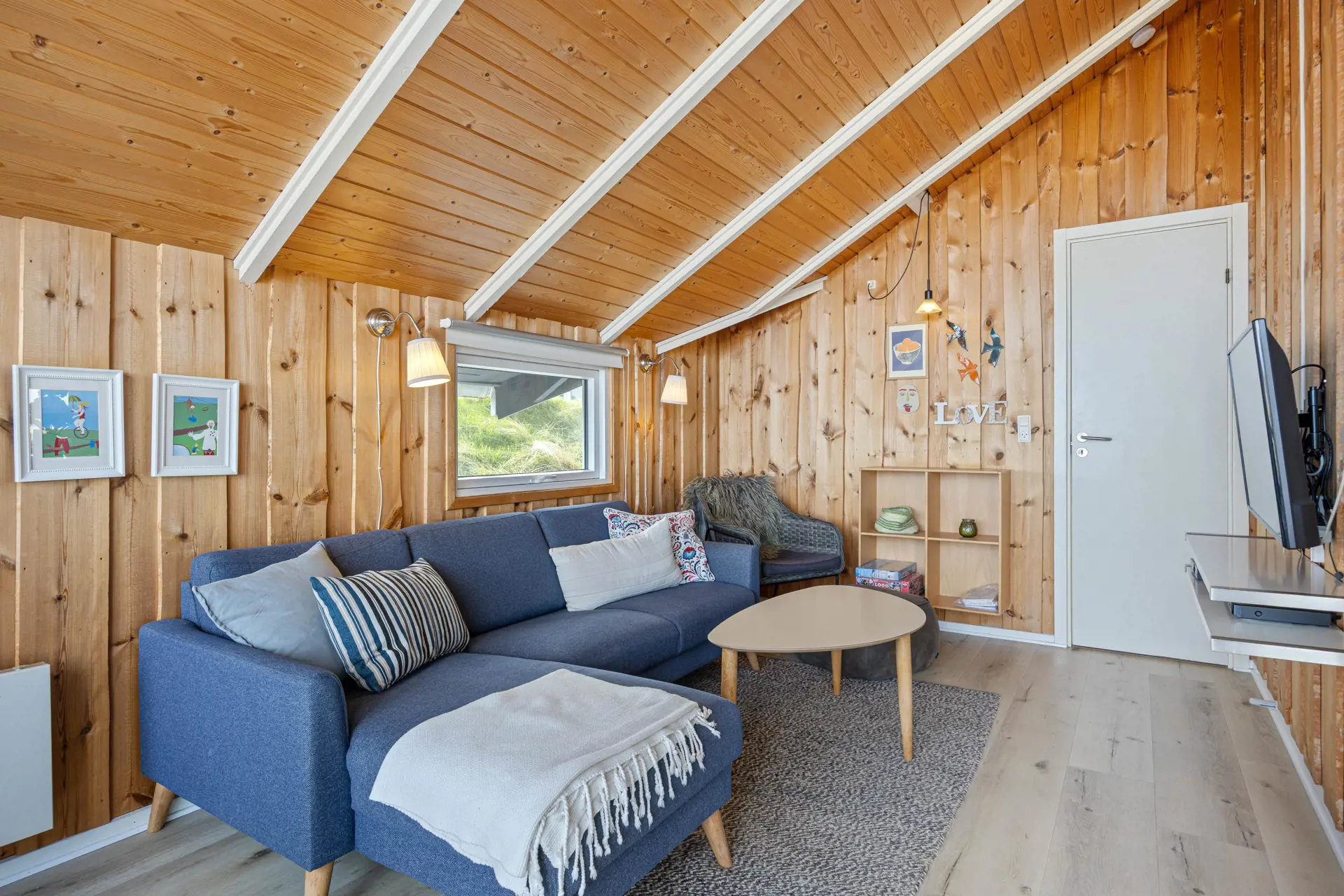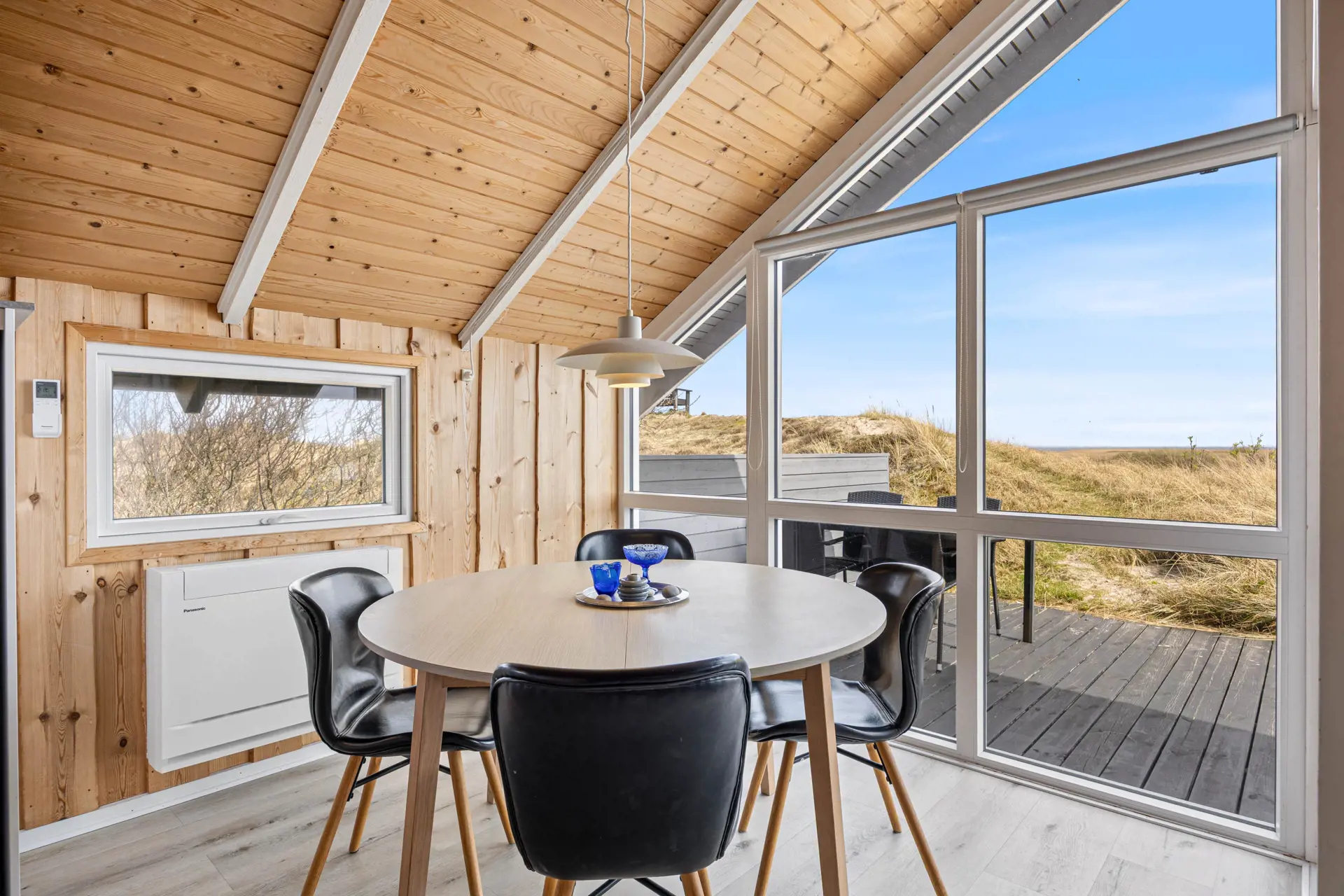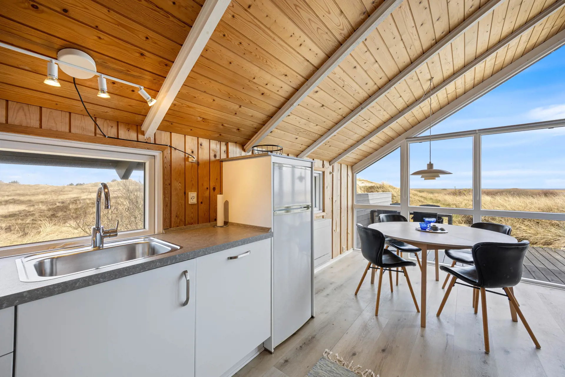 Der Wohnbereich im Ferienhaus in Sønder Klitvej 139 B bildet den zentralen Treffpunkt des Ferienhauses. Hier könnt ihr gemeinsam entspannen, den Tag planen oder den Abend ausklingen lassen. Große Fenster sorgen für viel Licht im Inneren und lassen euch die besondere Atmosphäre der Umgebung auch vom Wohnbereich aus erleben.