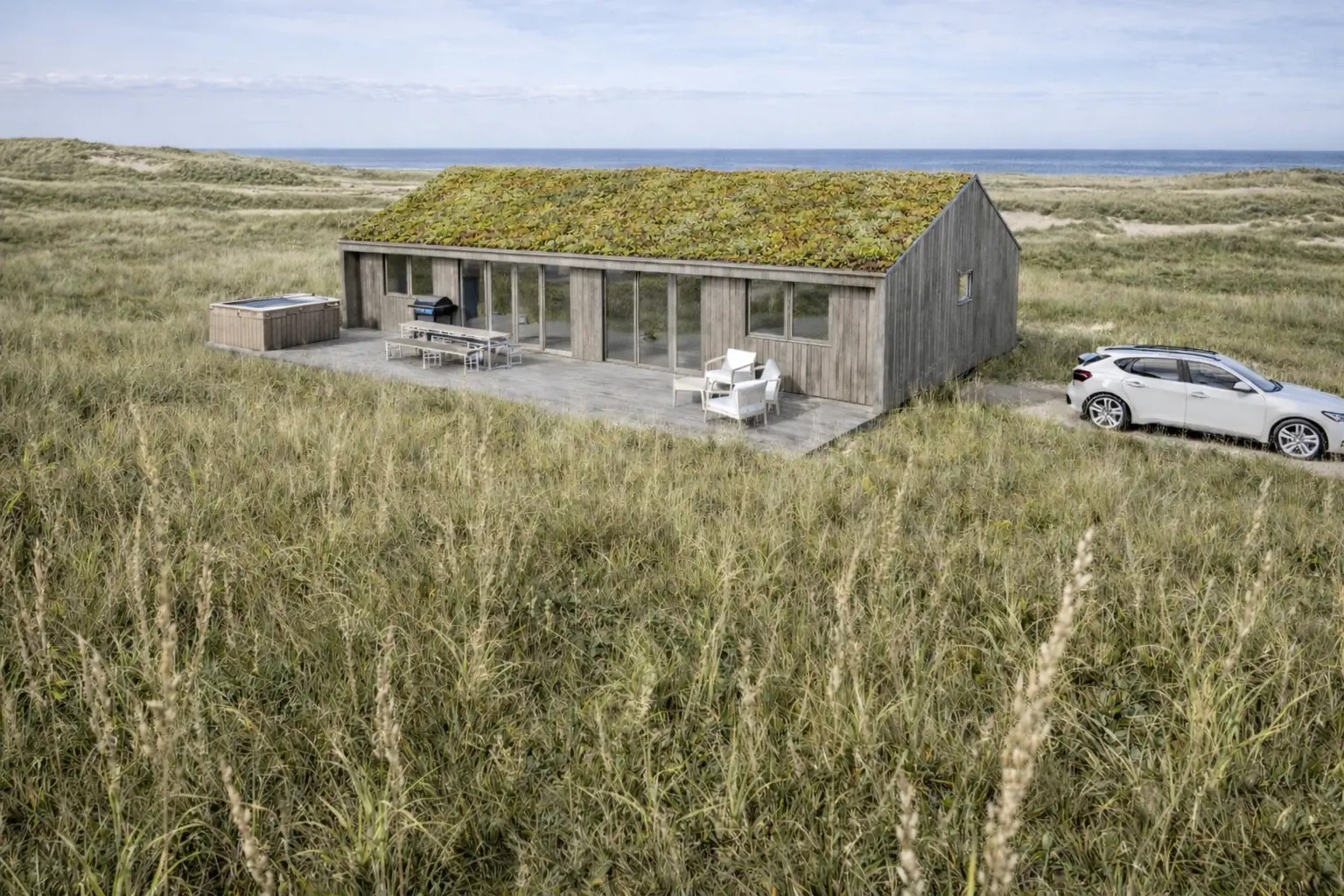 Auch draußen bietet euch das Ferienhaus ideale Voraussetzungen für erholsame Urlaubstage. Auf dem Natur- und Dünengrundstück könnt ihr die frische Luft und die Weite der Landschaft genießen. Die offene Terrasse lädt euch dazu ein, den Tag entspannt im Freien zu verbringen.