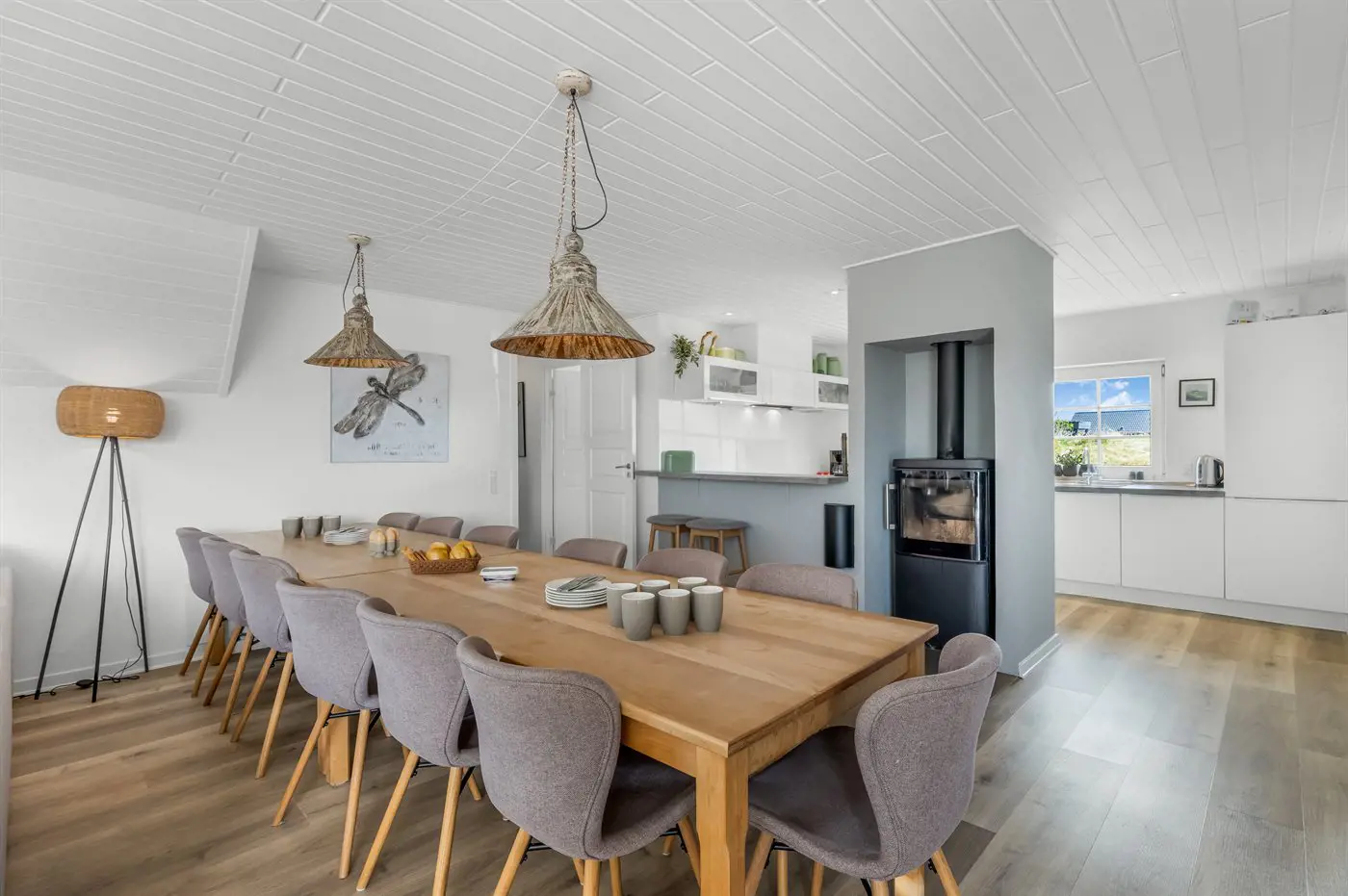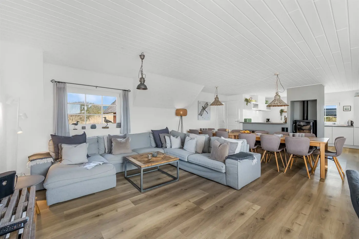 Das Ferienhaus ist geschmackvoll mit dänischem Design, harmonischen Farbtönen und viel Liebe zum Detail eingerichtet und strahlt zugleich hohe Qualität und Gemütlichkeit aus. Entspannt euch auf der großen Couch mit einem guten Buch und dem Knistern des Kaminofens im Hintergrund oder genießt das gemeinsame Zubereiten der Mahlzeiten im großzügigen Küchenbereich.