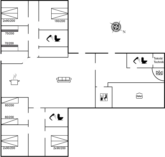 Die Schlafplätze verteilen sich auf 6 Schlafräume. 8 Schlafplätze in Doppelbetten. 2 Schlafplätze in Einzelbetten. 4 Schlafplätze in Etagenbetten.