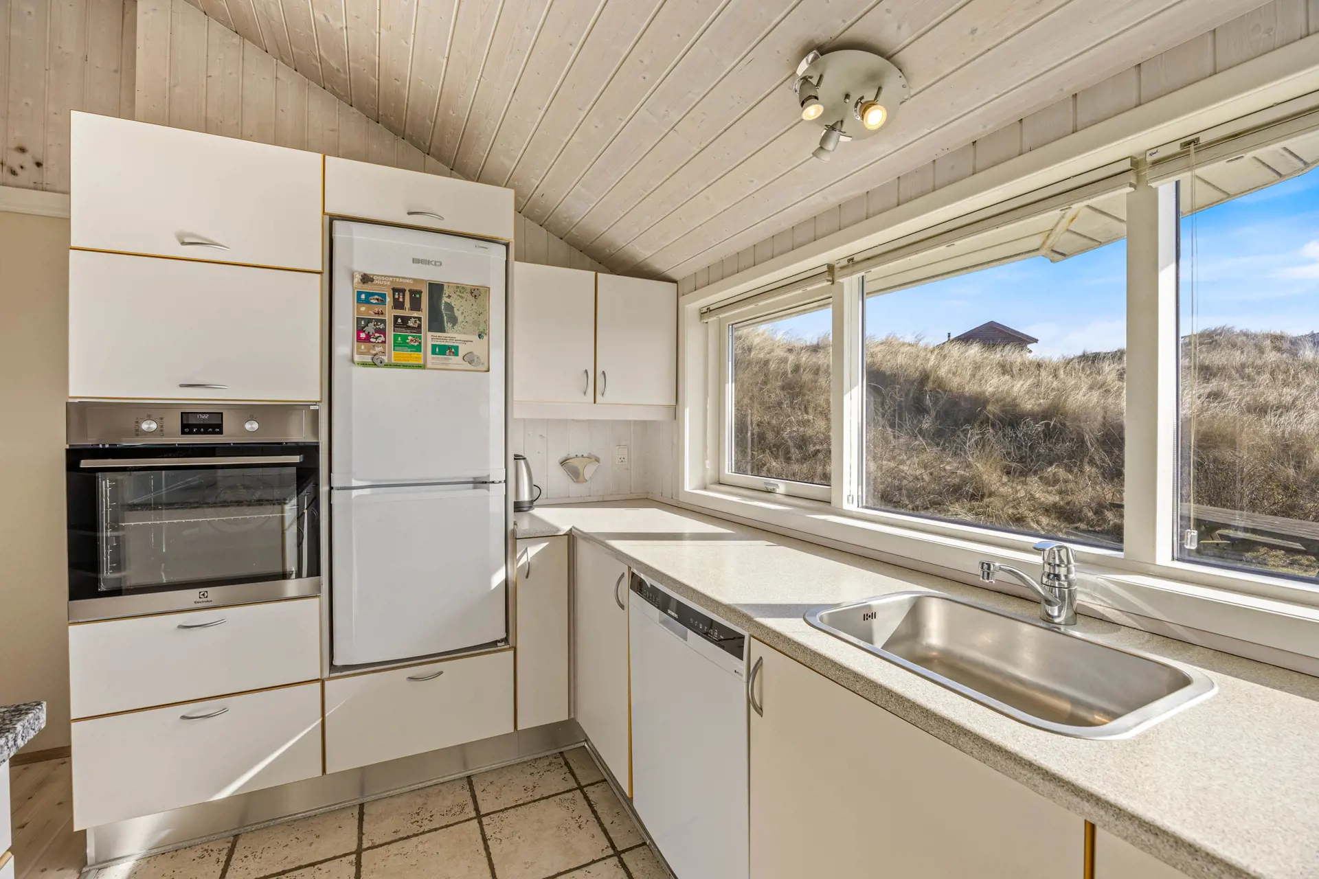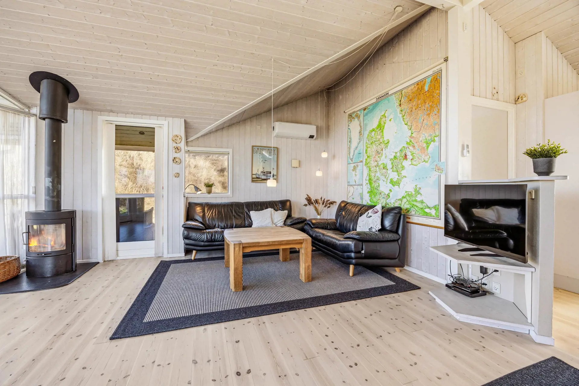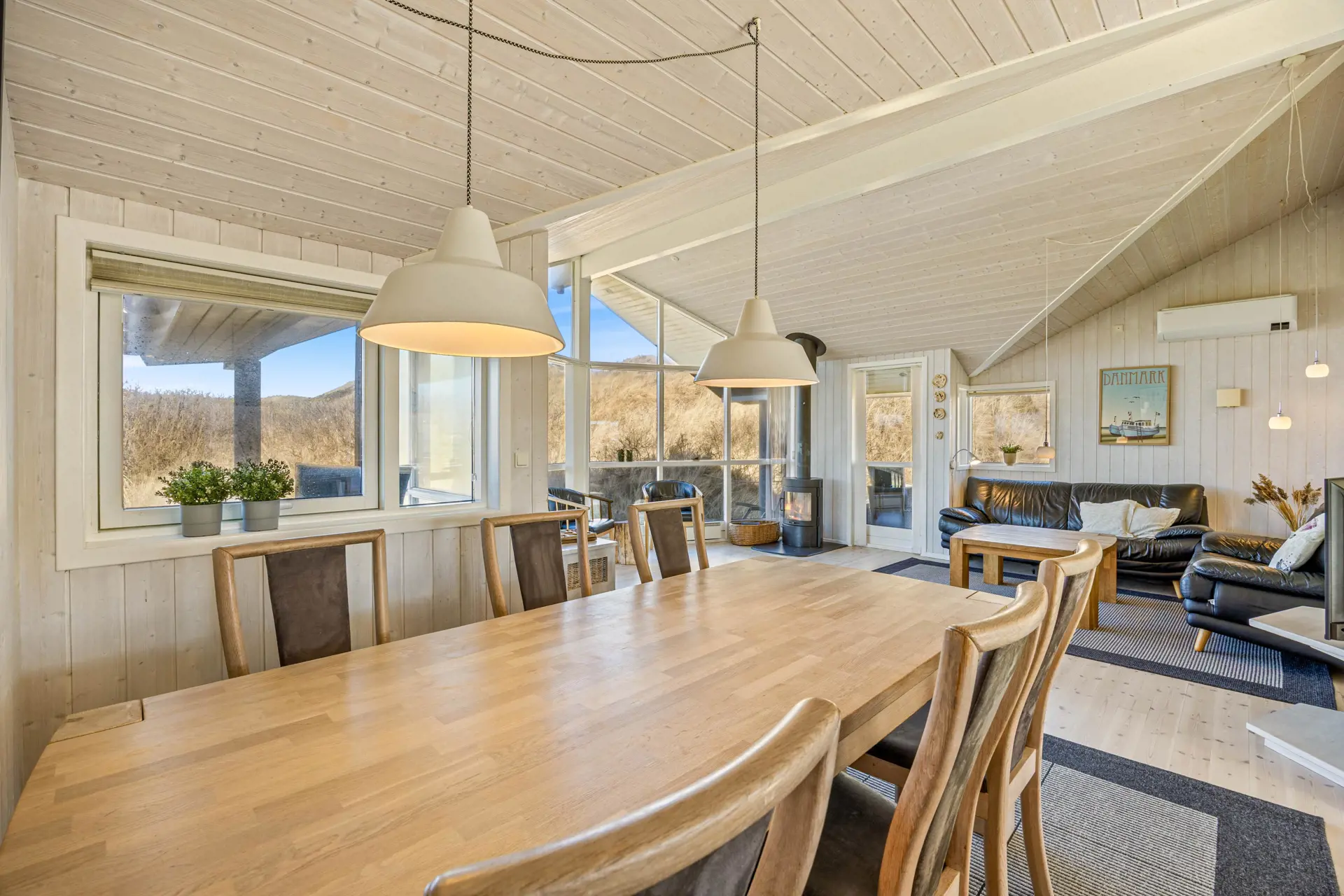 Im Mittelpunkt steht der offene Wohnbereich, der Kochen, Essen und Entspannen angenehm verbindet. In der Küche unterstützt euch eine Spülmaschine, damit nach dem Abendessen mehr Zeit für Spiele, Gespräche oder einen Film bleibt. Der Holzofen sorgt an kühleren Tagen für eine behagliche Atmosphäre, während die Wärmepumpe das Raumklima effizient und komfortabel hält. So fühlt sich der Aufenthalt zu jeder Jahreszeit stimmig an – egal, ob ihr nach einem langen Strandtag zurückkehrt oder euch einen gemütlichen Abend drinnen macht.
