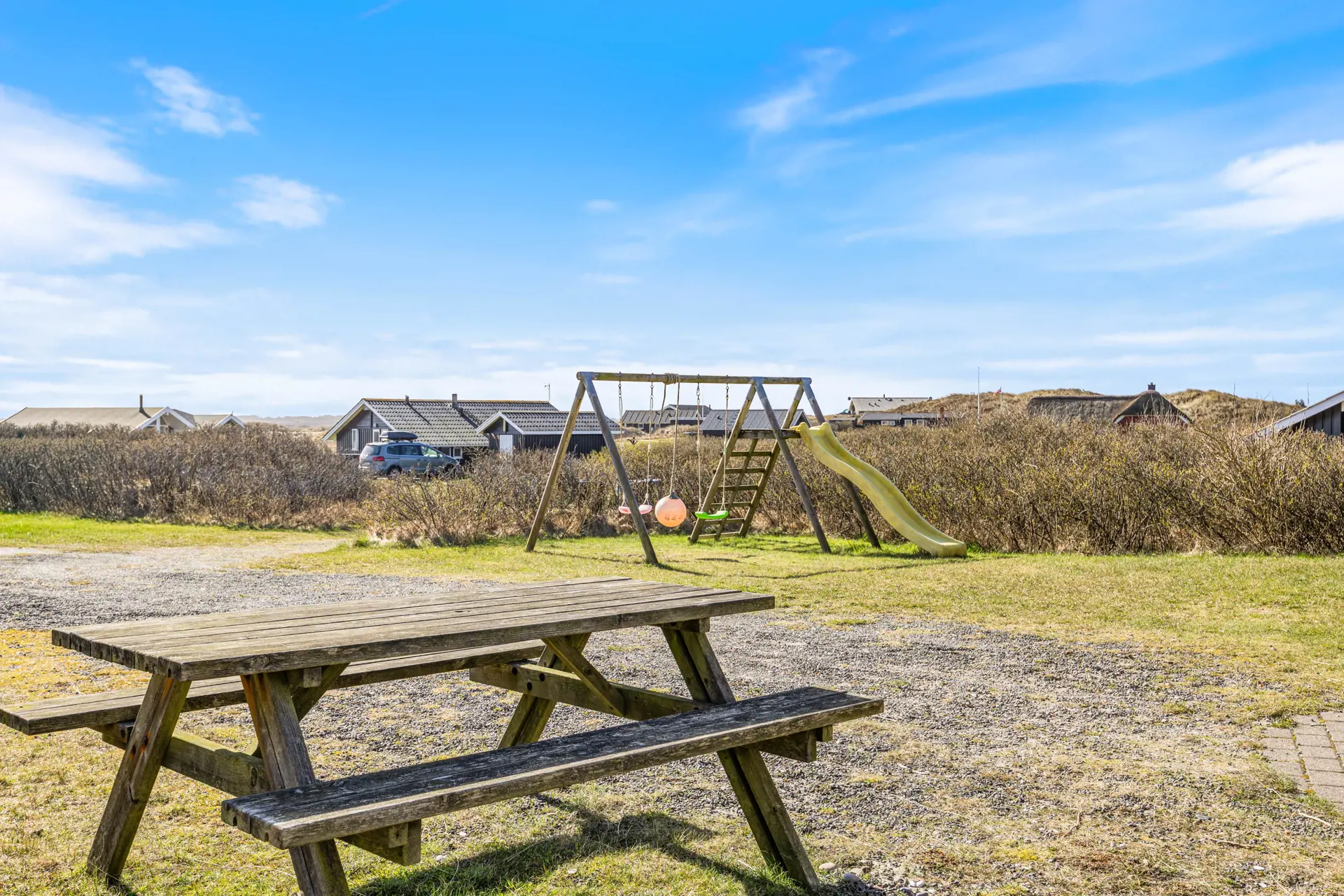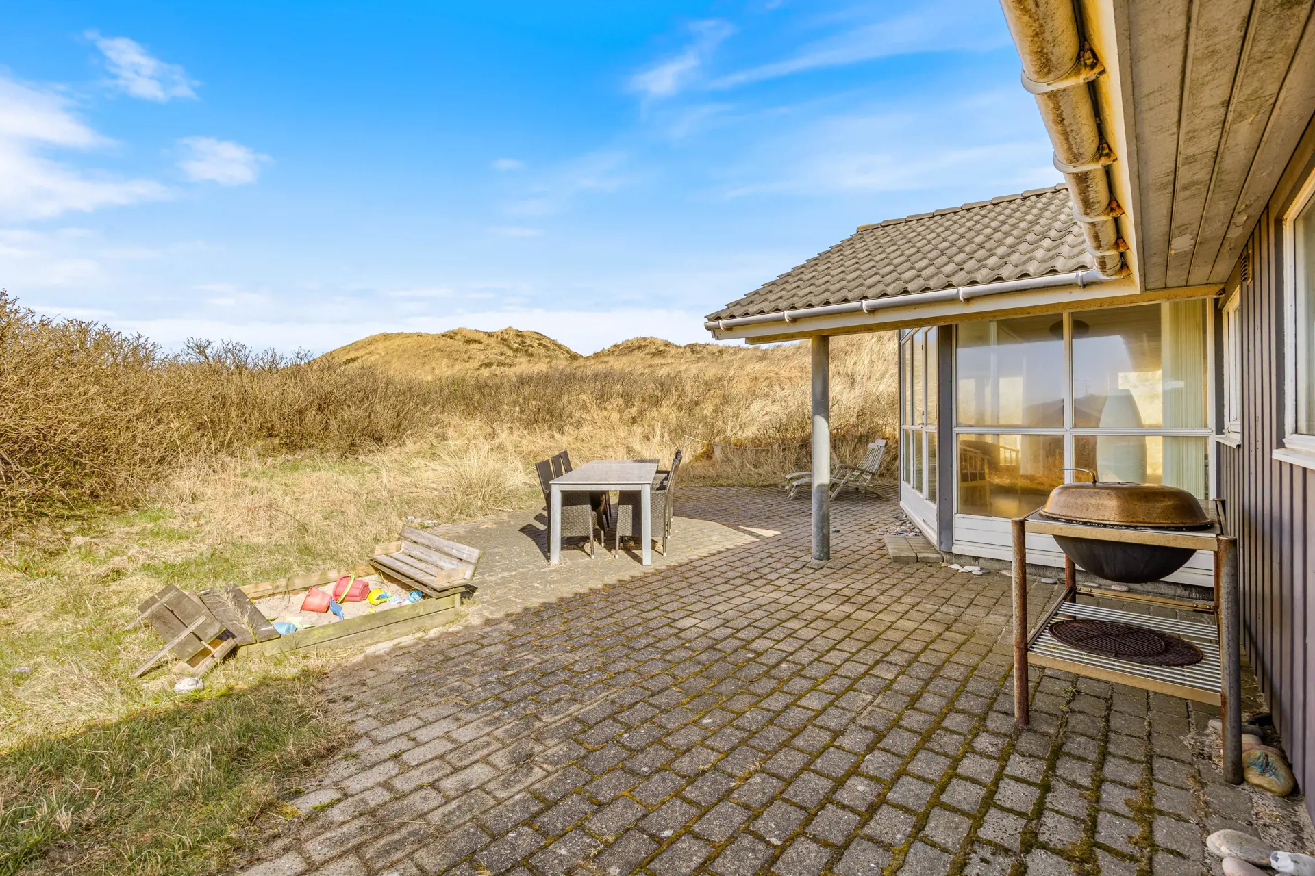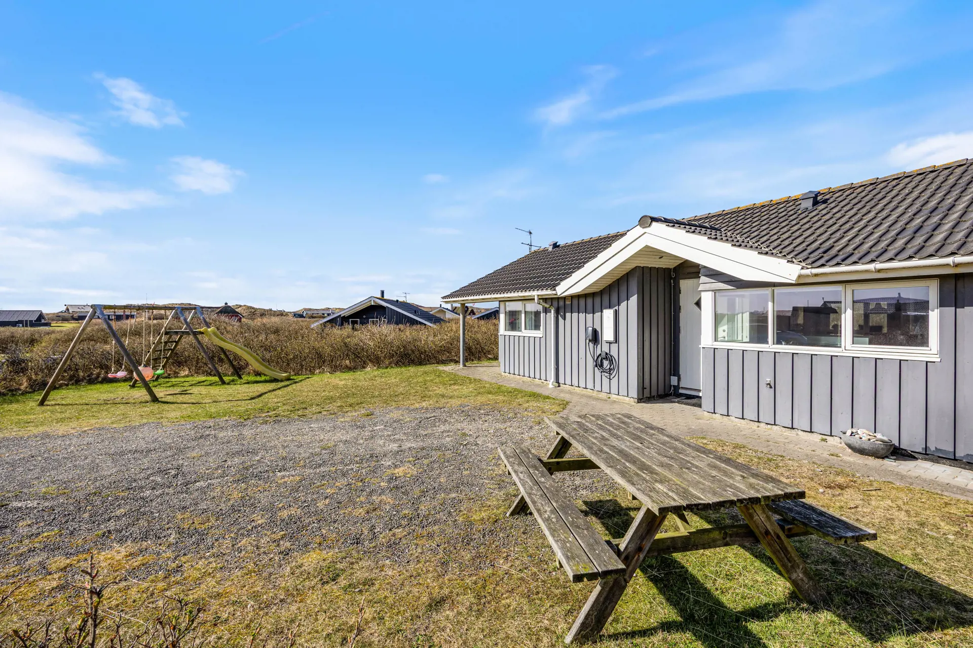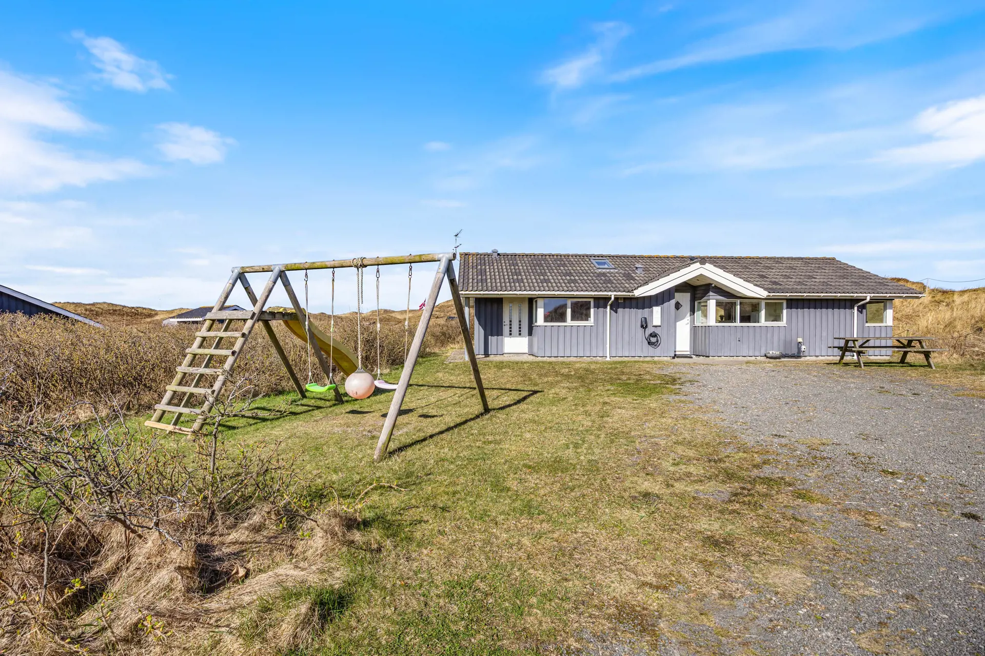 Draußen wartet viel Platz zum Leben auf der offenen, aber abgeschirmten Terrasse, die zum Sonnen und gemeinsamen Essen einlädt. Gartenmöbel stehen bereit und der Grill macht aus jedem Abendessen ein kleines Urlaubsritual. Für Kinder ist die Schaukel ein echter Pluspunkt und auch euer Hund findet auf dem weitläufigen Grundstück genügend Raum zum Schnuppern und Entdecken.