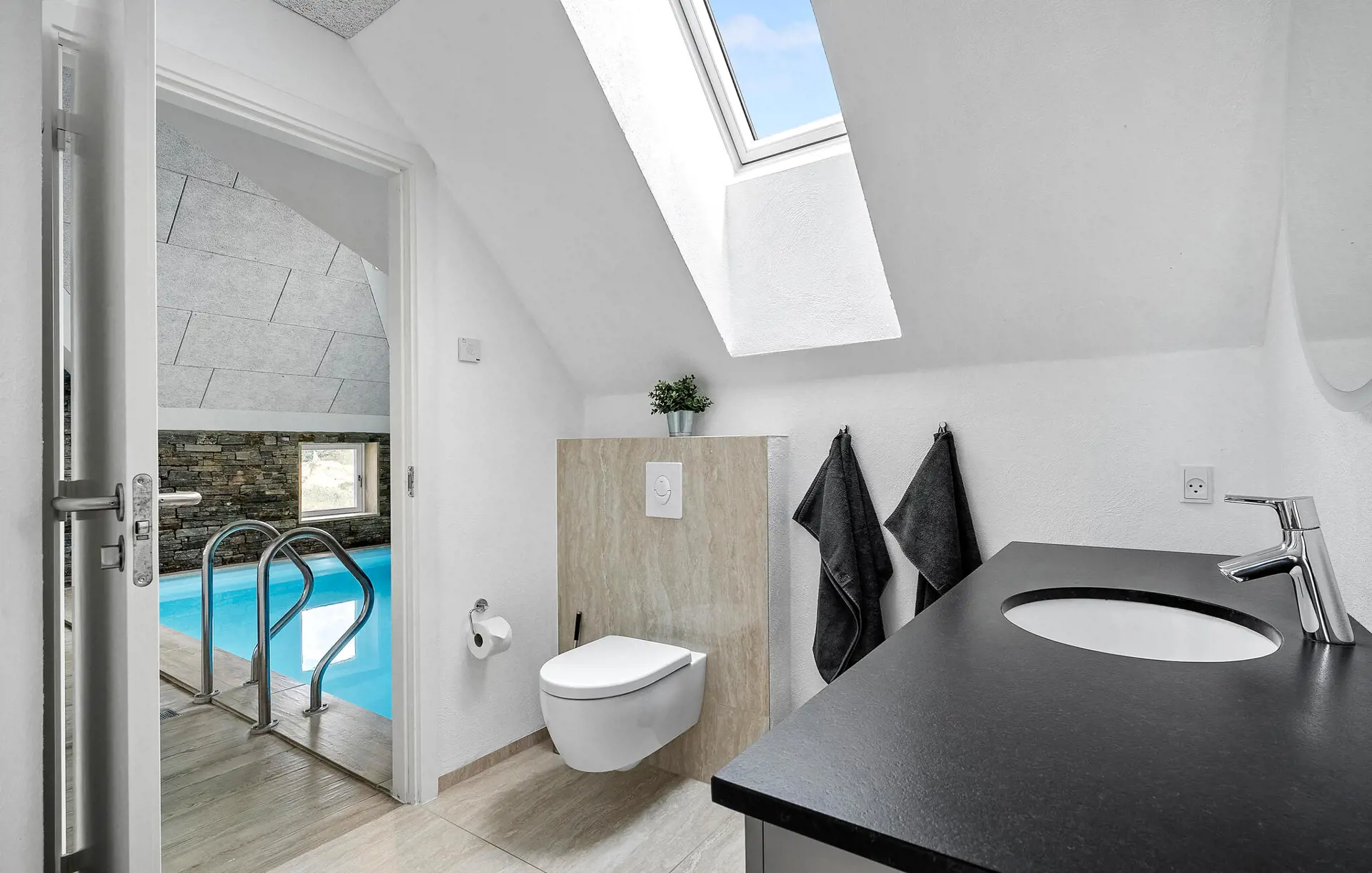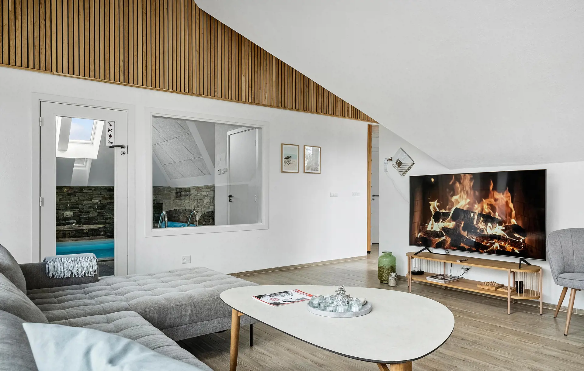Dieses malerisch gelegene Haus verspricht Ihnen einen Urlaub der Extraklasse. Große Fensterfronten, schöne Holzelemente und elegantes Mobiliar schaffen eine einladende Atmosphäre, in der Sie schnell neue Energie tanken können. Hören Sie Ihre Lieblingsmusik oder verbringen Sie einen gemütlichen Filmabend mit der Familie. Wenn Sie es sportlicher mögen, springen Sie in den Innenpool oder entspannen Sie sich in der Sauna.