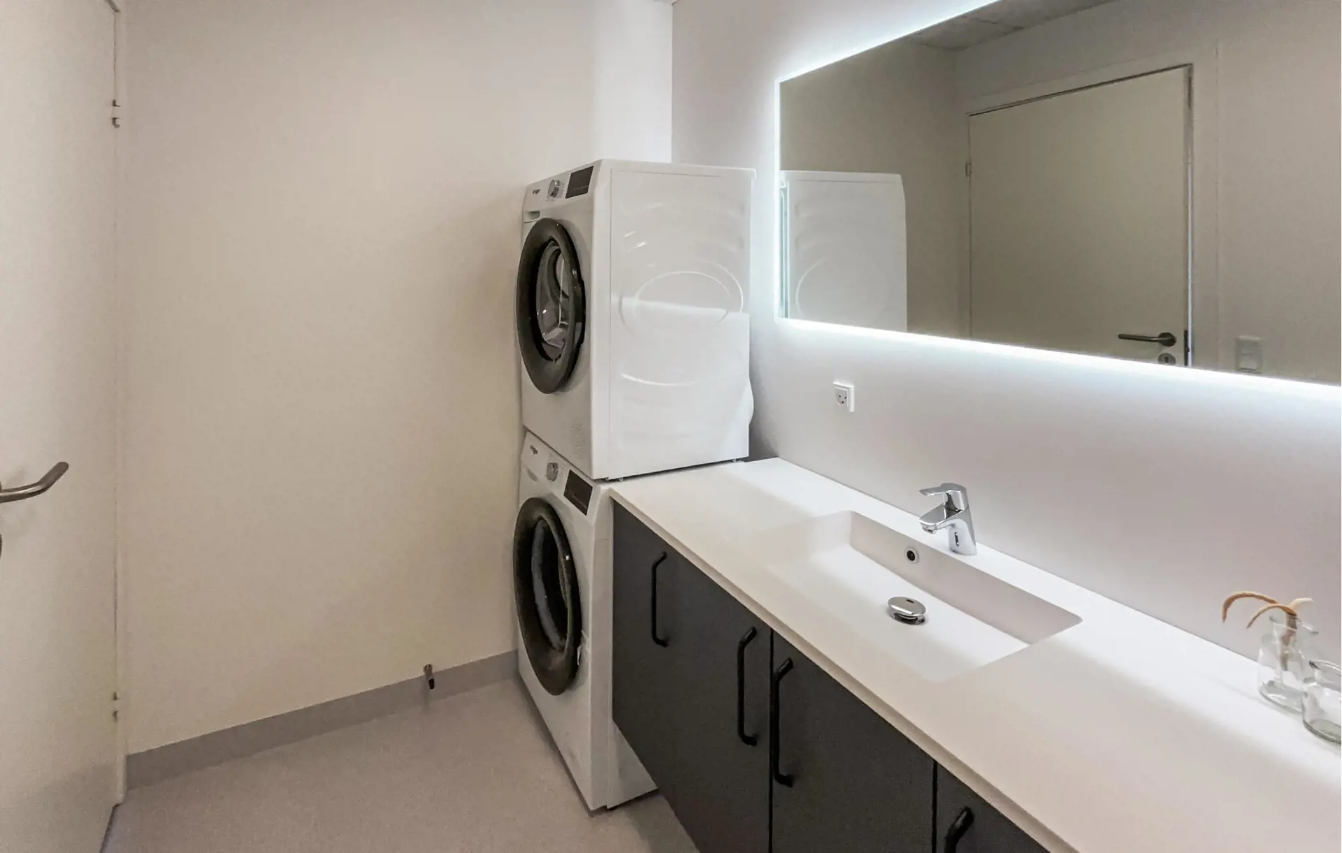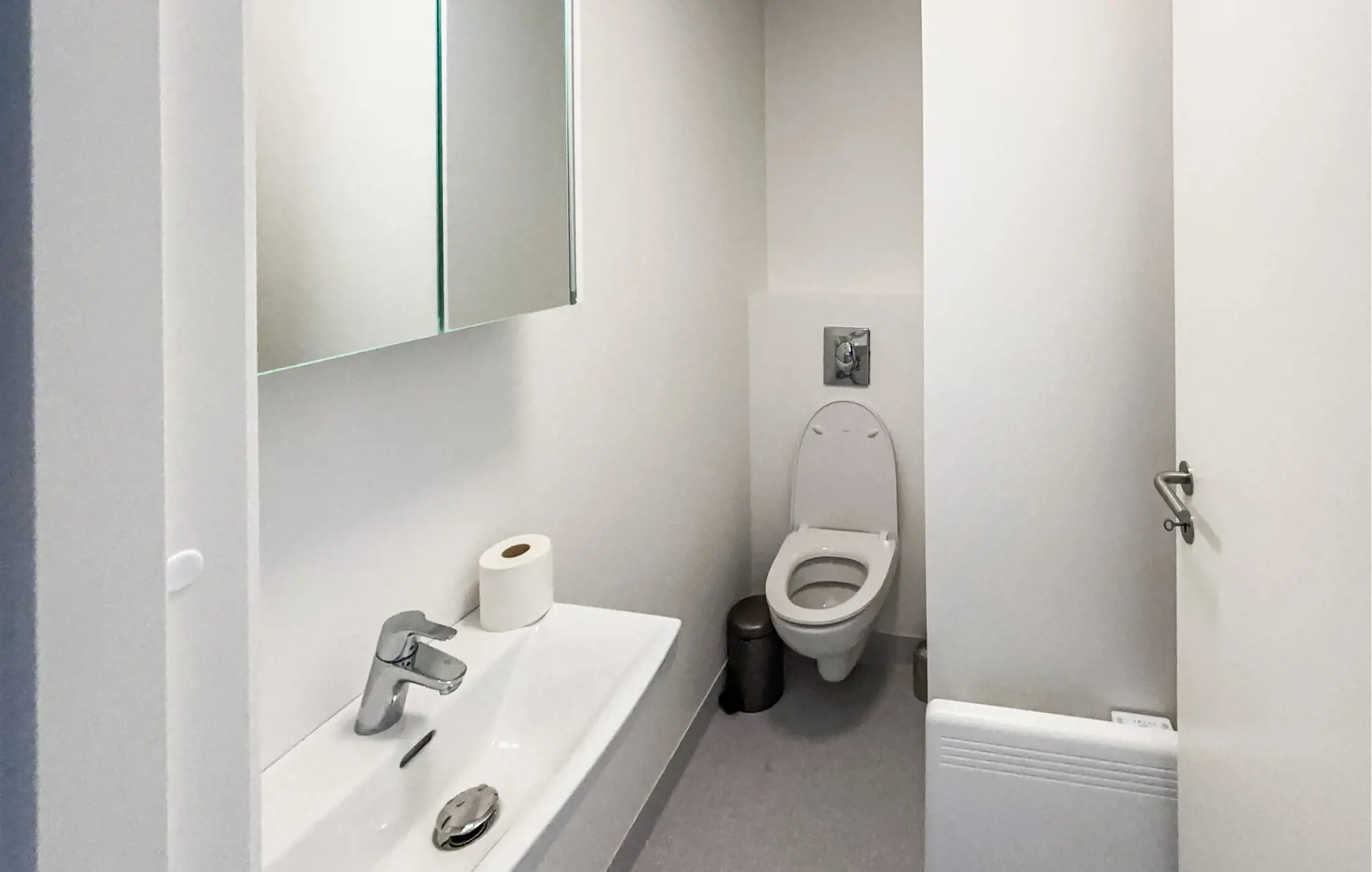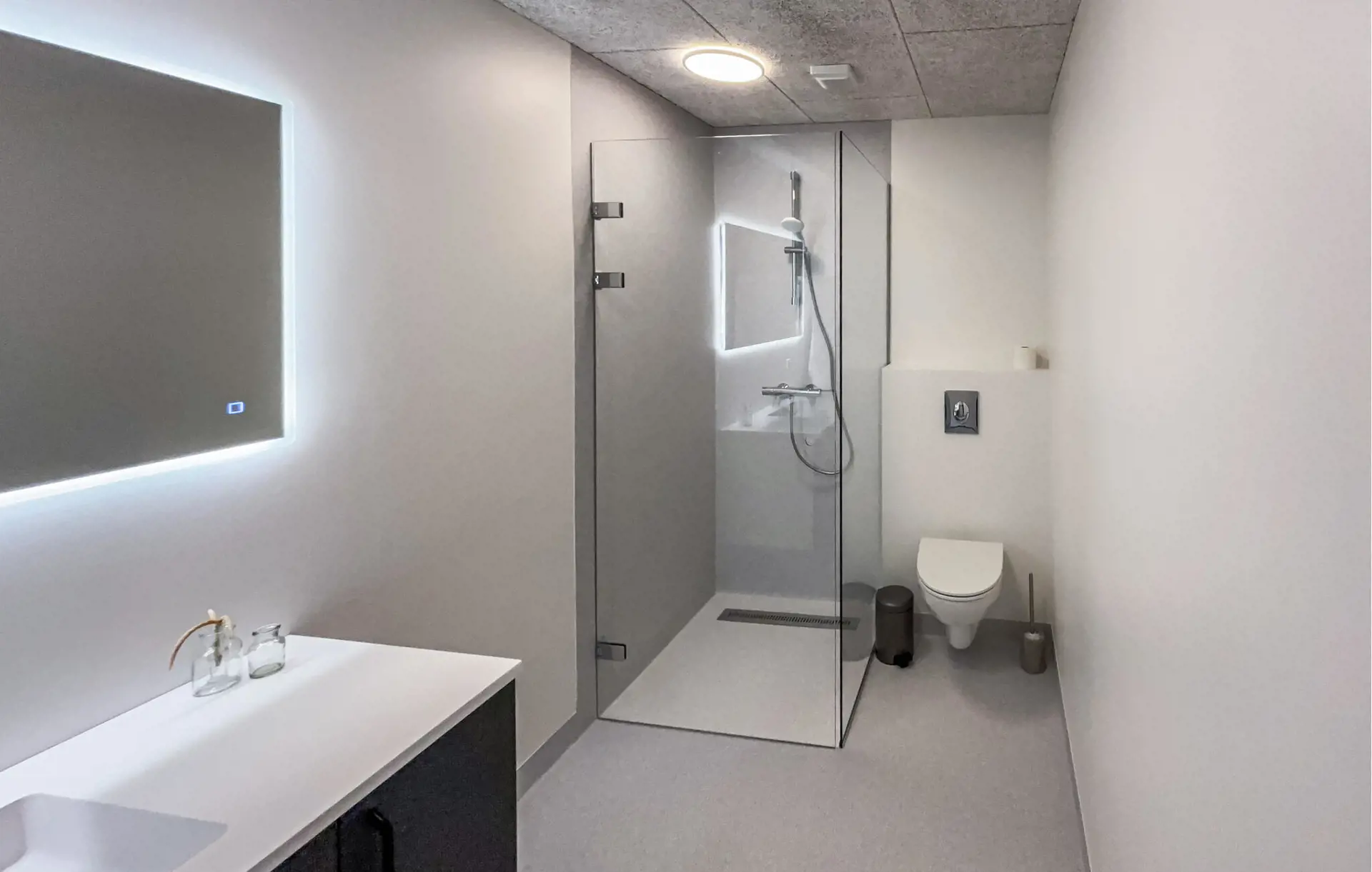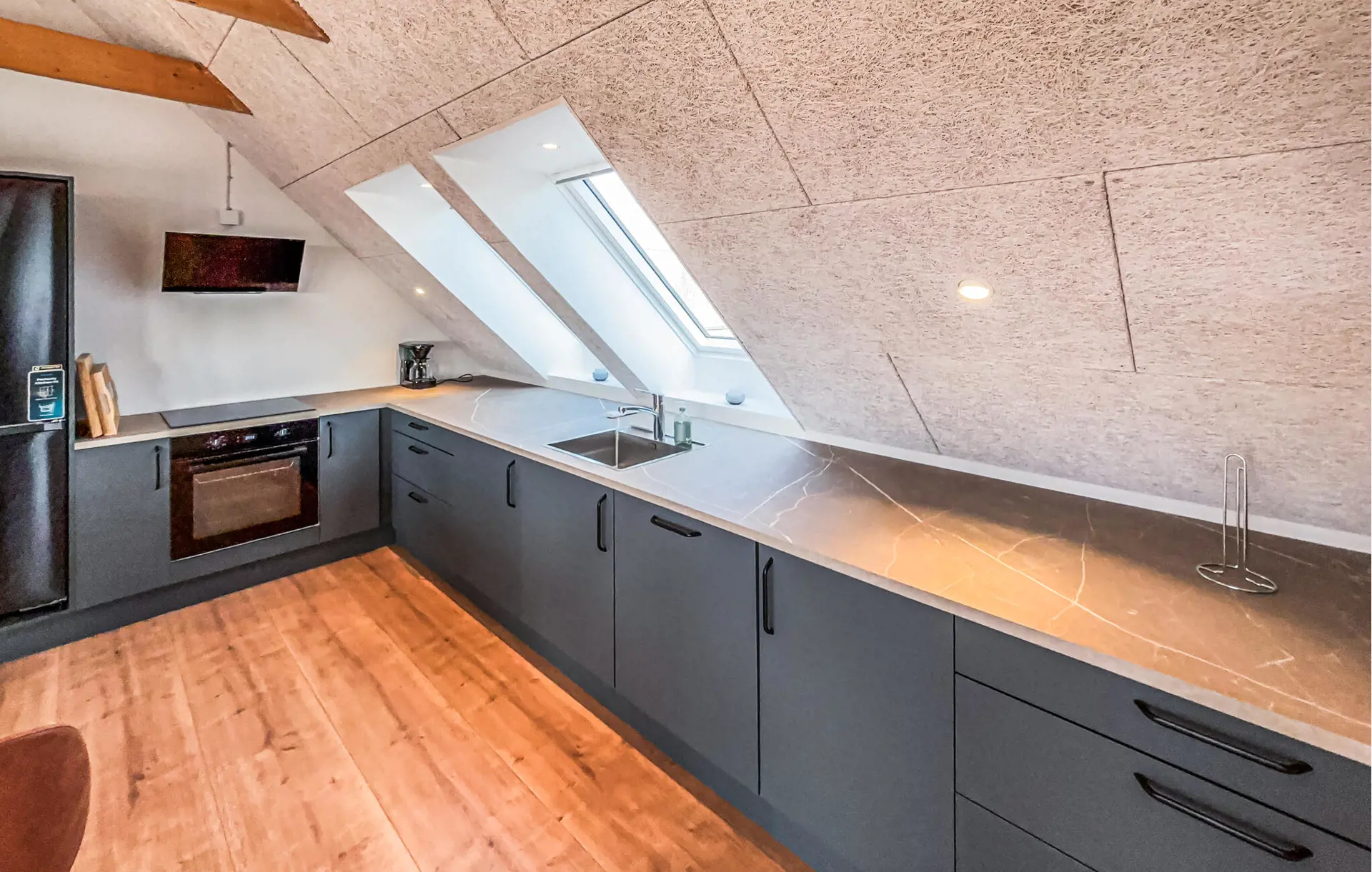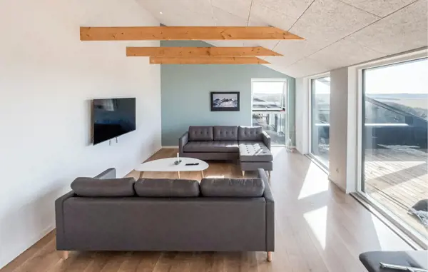 Der Wohnbereich überzeugt mit hellen Farben und großen Fensterflächen, die den Blick auf die umliegende Landschaft freigeben. Nehmen Sie auf den bequemen Sesseln Platz und genießen Sie entspannte Stunden in ruhiger Umgebung. Die sichtbaren Holzbalken verleihen dem Raum eine warme Note und unterstreichen das moderne, nordische Design. Setzen Sie sich an den runden Esstisch neben der modernen Küche und verbringen Sie gesellige Momente.