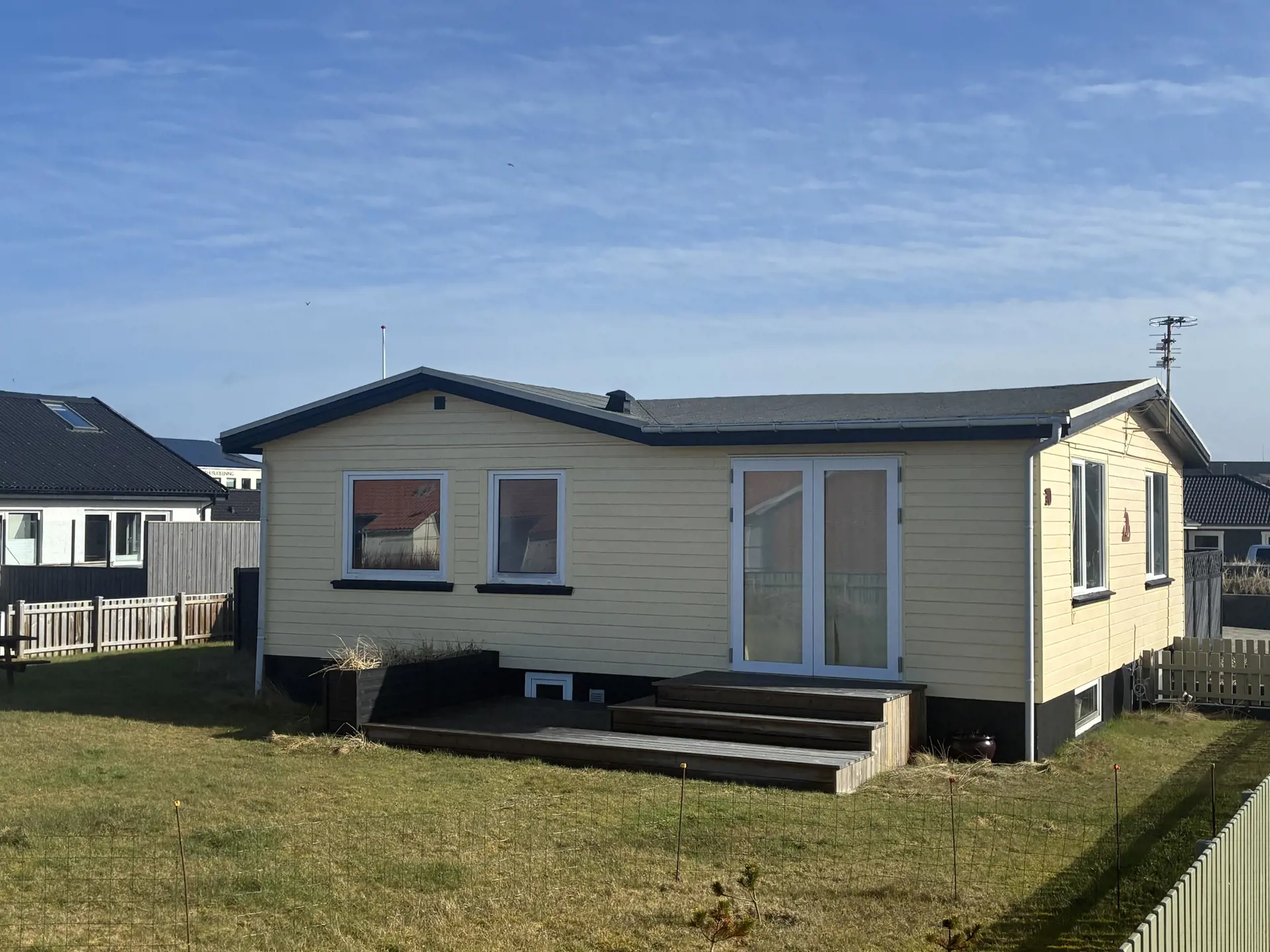 Die Außenbereiche sind ein großes Plus. Der umzäunte Rasen bietet einen sicheren Rahmen für Kinder und Hunde, und das Trampolin wird zweifellos ein Hit bei den Jüngsten sein. Die Terrasse ist teilweise überdacht und mit guten Gartenmöbeln ausgestattet, sodass Sie die Sommerabende im Windschatten genießen können. Als zusätzlicher Luxus gibt es eine Außendusche, die von April bis November genutzt werden kann – perfekt nach einem Bad im Meer.