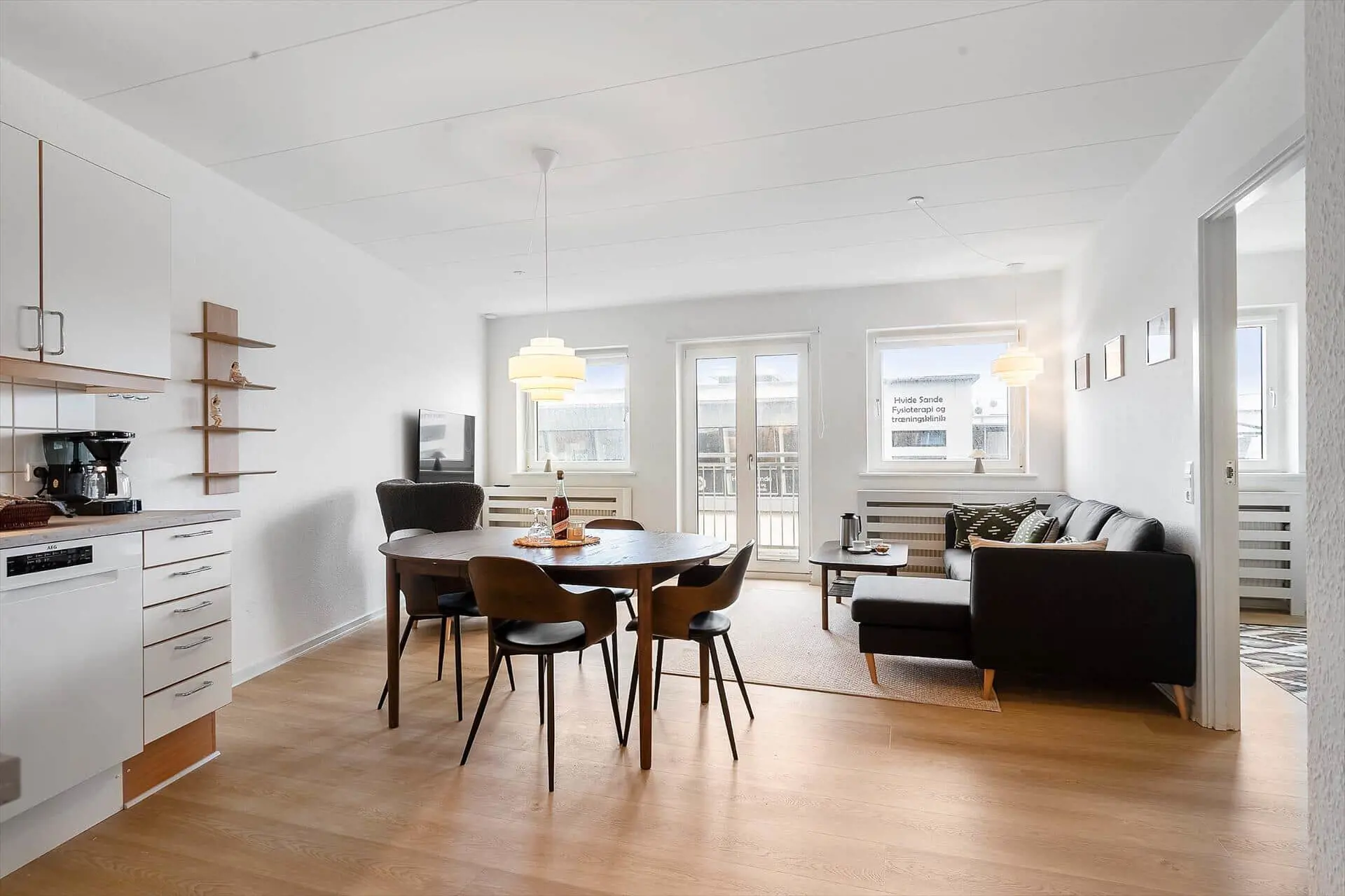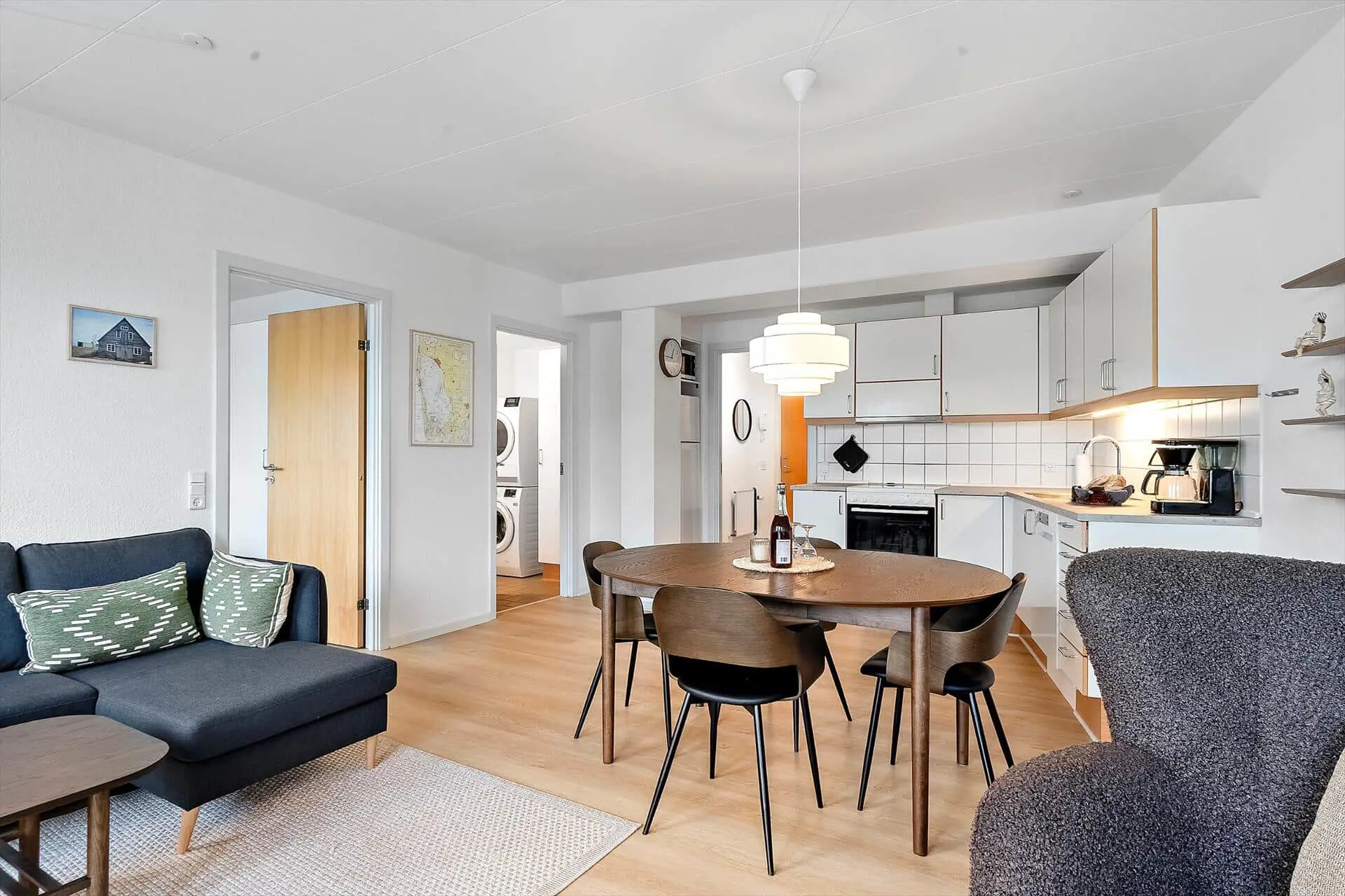 Die Wohnung befindet sich im ersten Stock eines Hauses mit Aufzug – ein komfortables Detail, das die Anreise mit Gepäck oder Einkäufen erleichtert. Innen empfängt euch eine helle und freundliche Einrichtung. Das Wohnzimmer bildet das Herzstück der Wohnung und lädt dazu ein, es sich auf dem Sofa bei einem Film oder geselligem Beisammensein gemütlich zu machen, während der Esstisch Platz für gemeinsame Mahlzeiten bietet. Die funktionale Küche ermöglicht es euch, frische Gerichte aus dem Fang des Tages oder regionalen Zutaten zuzubereiten. Das großzügige Schlafzimmer sorgt für erholsame Nächte, und im Wohnzimmer können zwei Personen auf dem Schlafsofa übernachten – ideal, wenn ihr zu mehreren reist. Das Badezimmer ist praktisch mit Dusche ausgestattet, und auch eine Waschmaschine steht euch hier zur Verfügung. Von der Wohnung aus könnt ihr über den Hafen blicken und das charmante Treiben am Kai beobachten – eine ganz besondere Stimmung, die man nur in Hvide Sande findet.