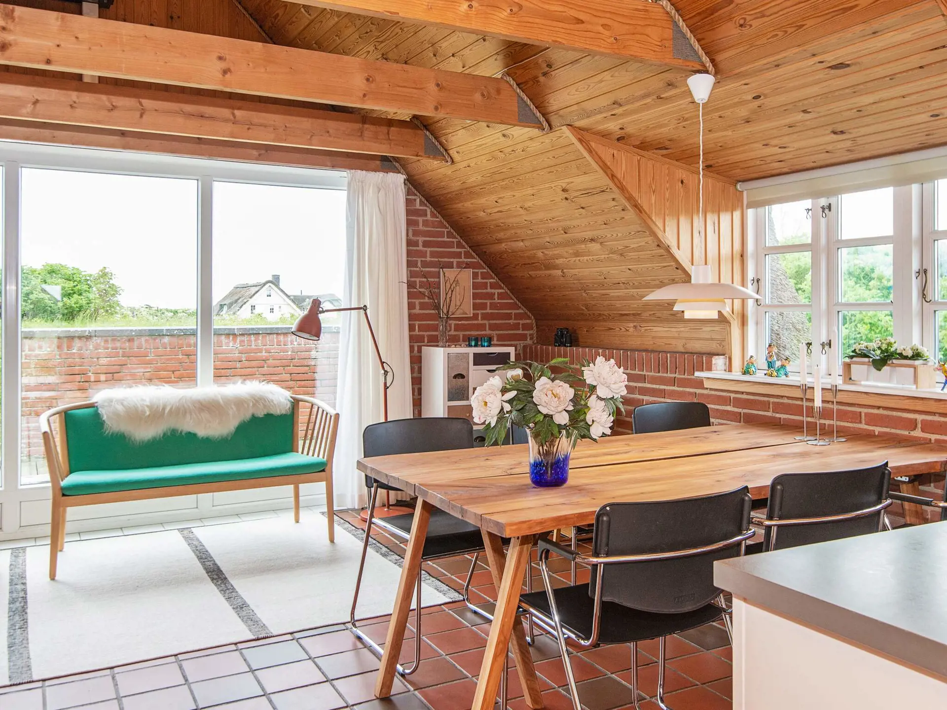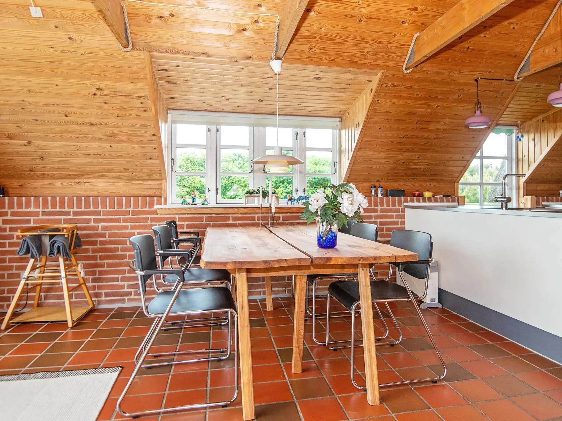 Das Ferienhaus hat einen hellen Küchen-/Wohnbereich für das Familienleben, inklusive Essecke und Holzofen für die kühleren Tage. Genießen Sie hier nach dem windigen Strandspaziergang den Ausblick zur umliegenden Natur durch den großen Fensterbereich, während Sie sich vor dem Feuer des Ofens aufwärmen.