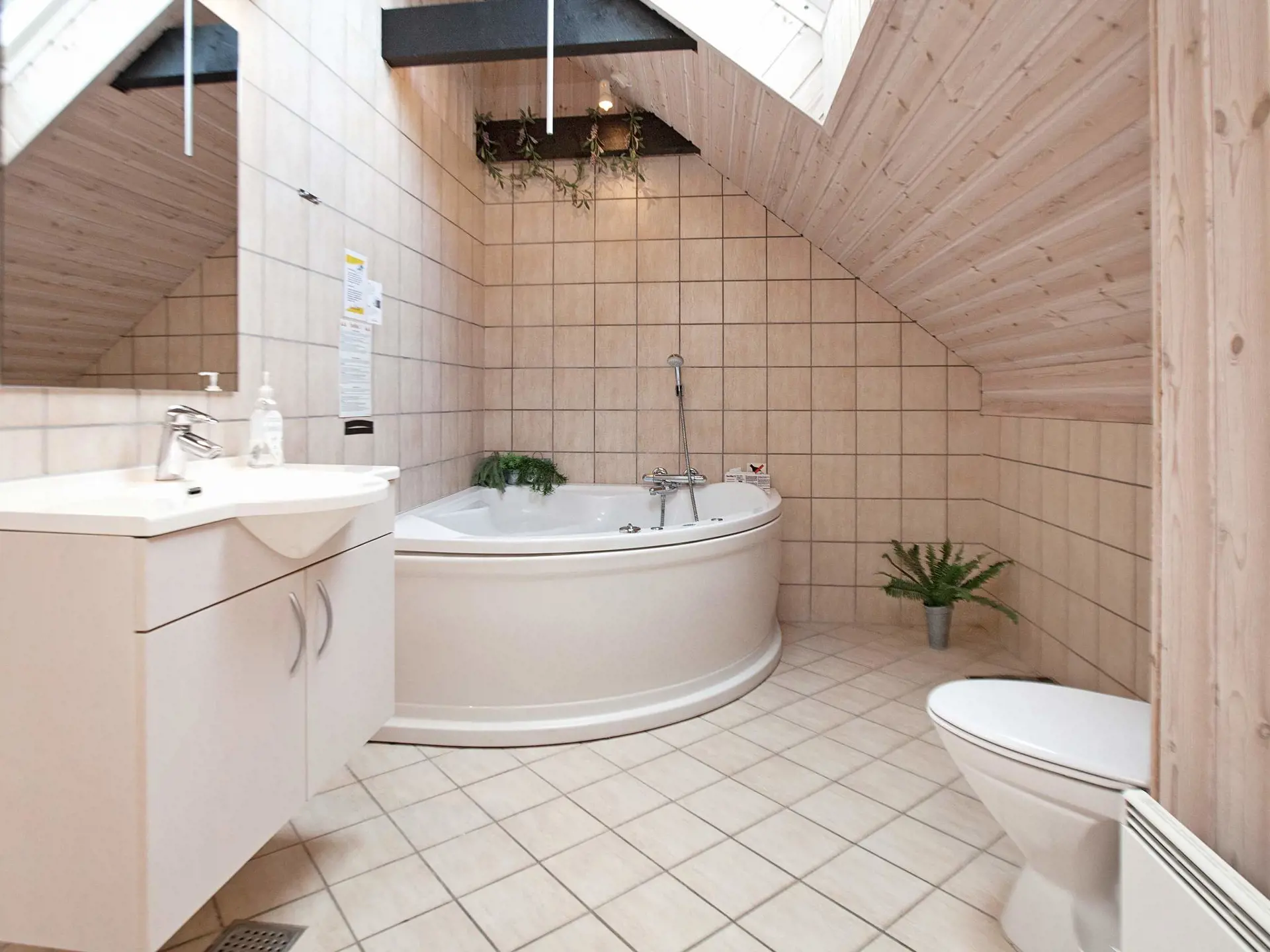 Innen erwartet Sie ein offener, gefliester Küchen-/Wohnbereich mit angenehmer Fußbodenheizung. Größeres Bad mit Sauna und Whirlpool sowie ein Gäste-WC mit Waschmaschine und Wäschetrockner im Haus. Zudem Wickelfläche und Babywanne vorhanden. Es stehen drei Schlafzimmer zur Auswahl; zwei mit je einem Doppelbett, das dritte mit zwei Einzelbetten. Zudem Hems oben unter der Dachschräge mit zwei weiteren Schlafplätzen.
