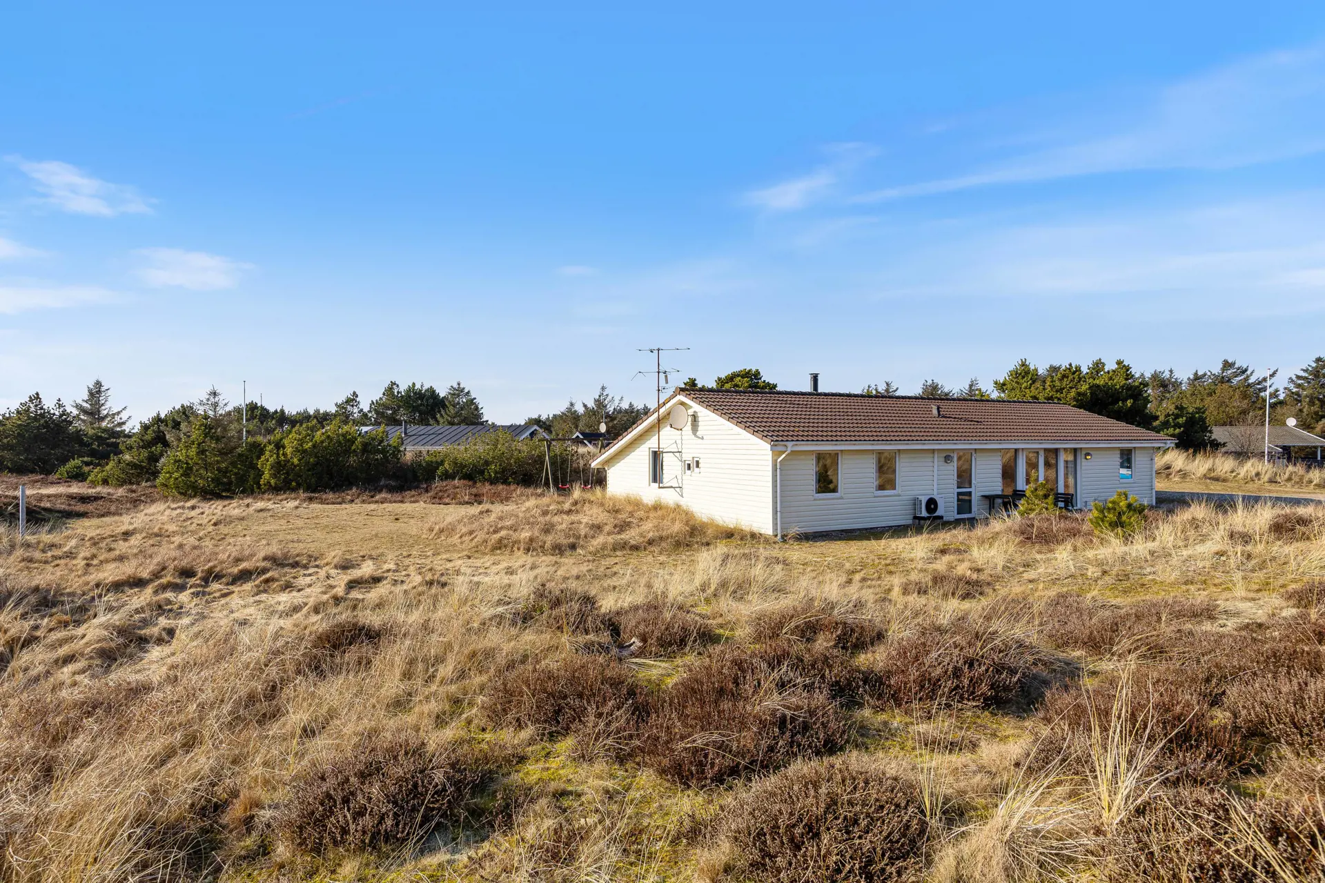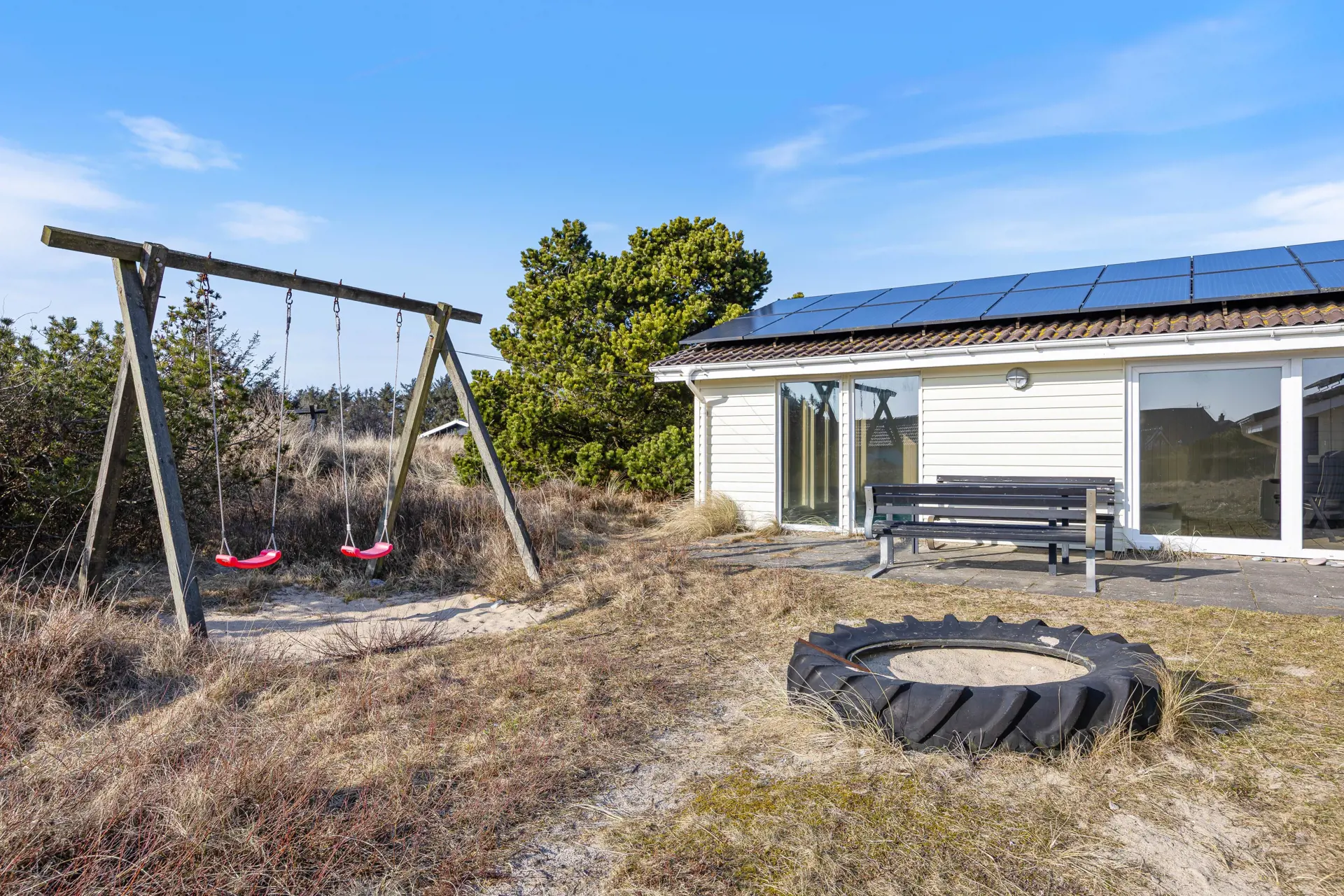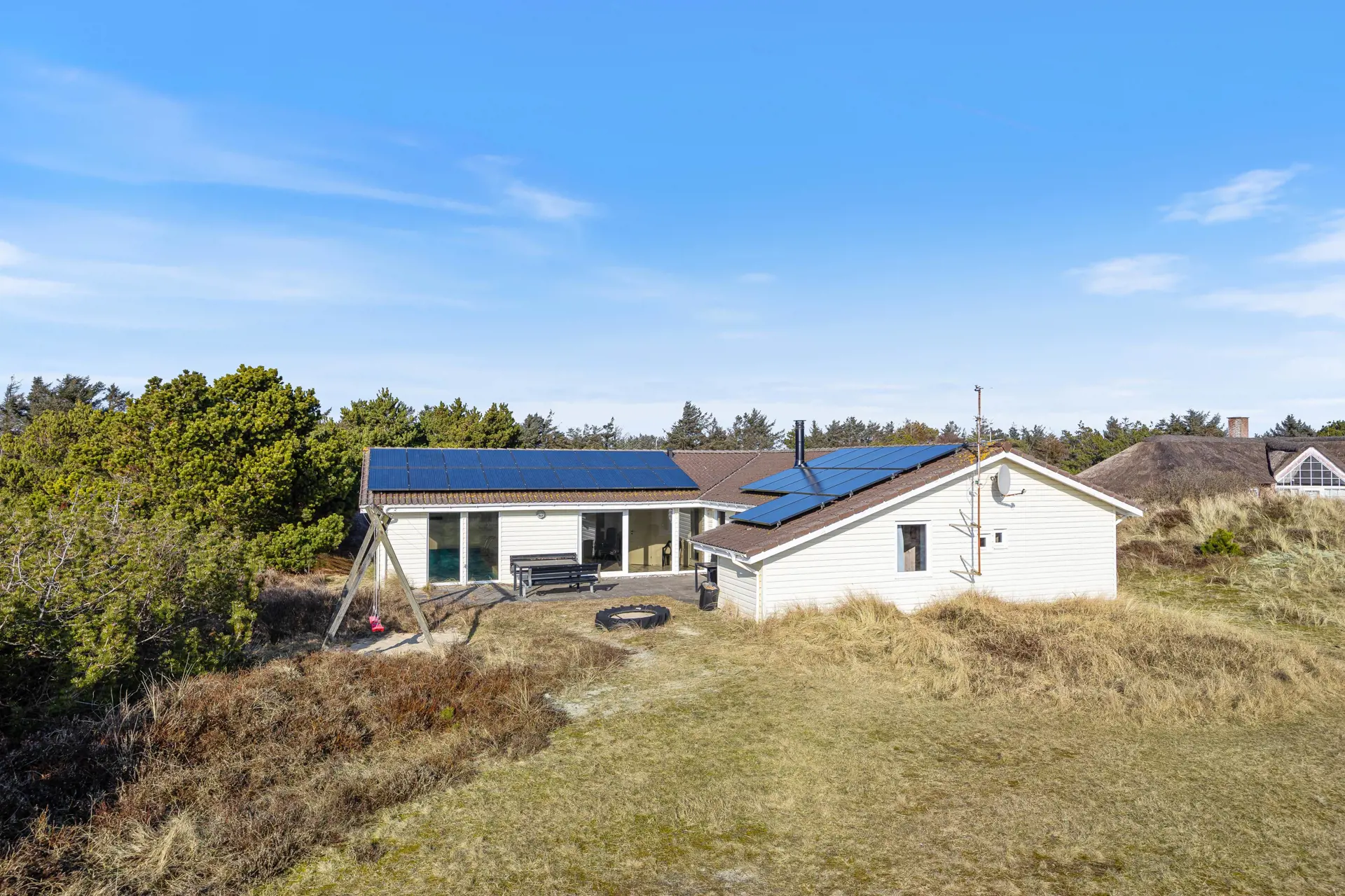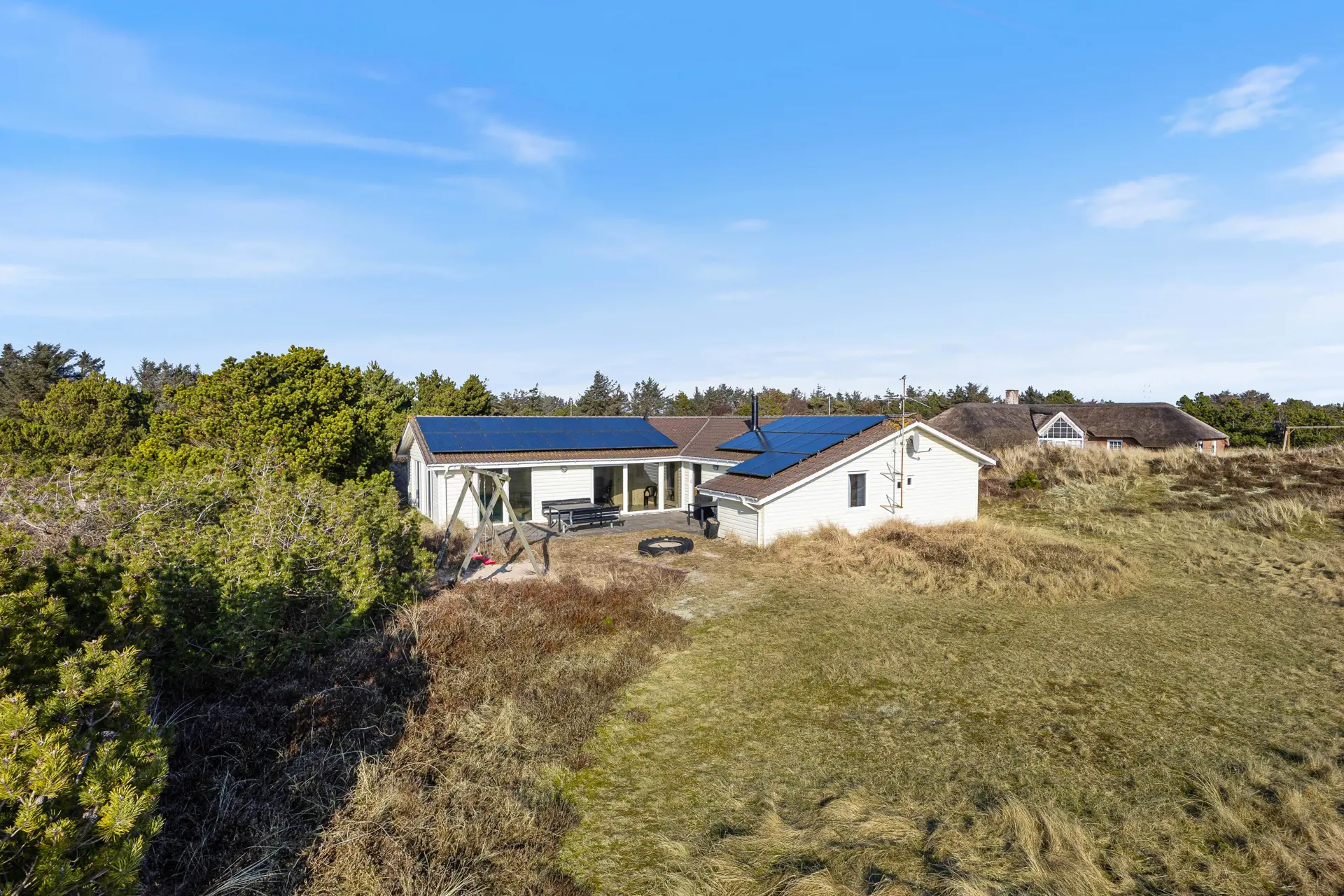 Das Ferienhaus liegt auf einem idyllischen Naturgrundstück, umgeben von Dünen, was eine ruhige und private Atmosphäre schafft. Hier gibt es viel Platz zum Spielen und Entspannen.