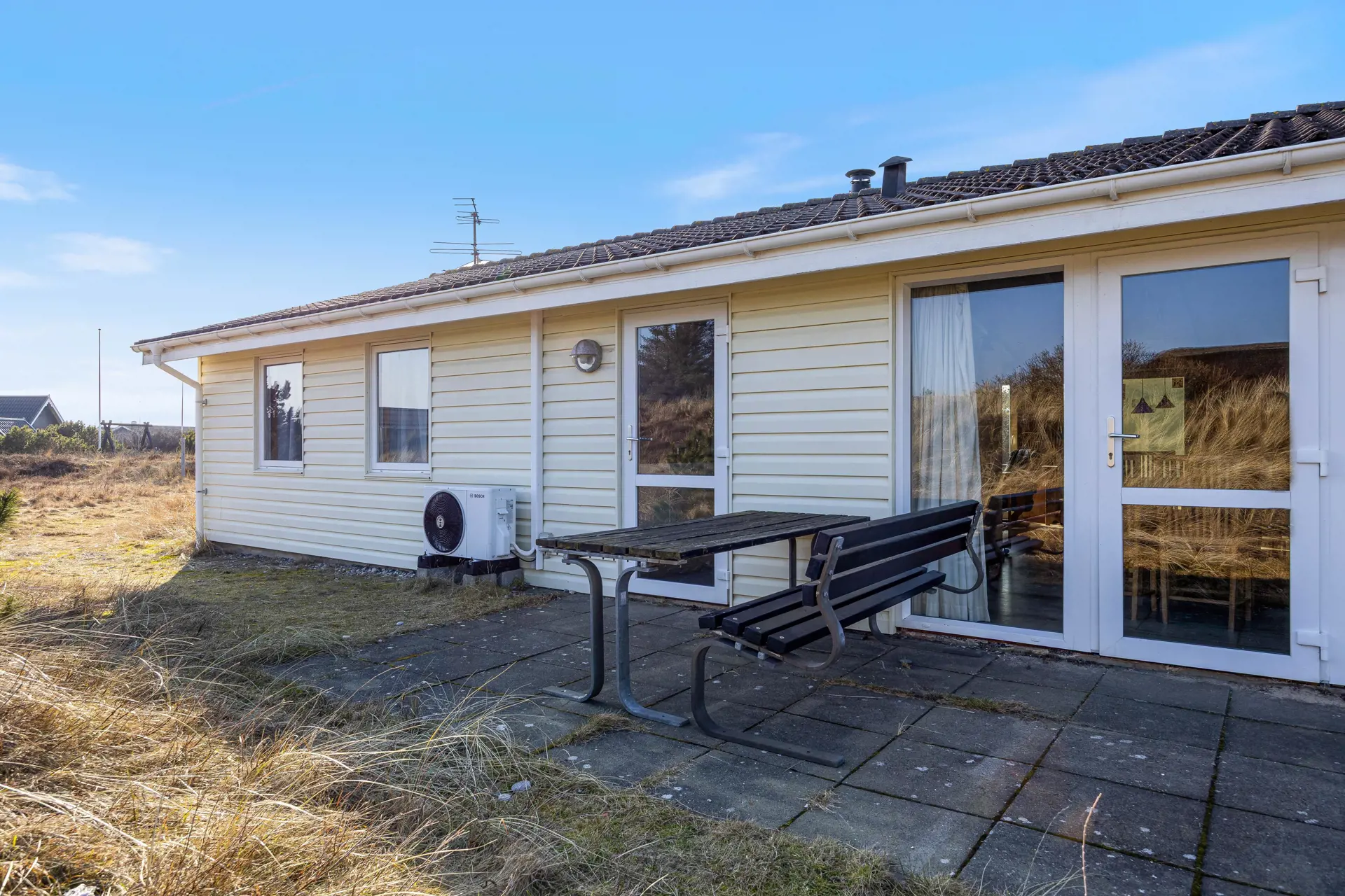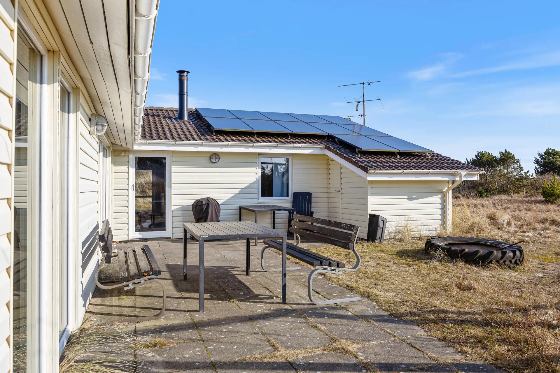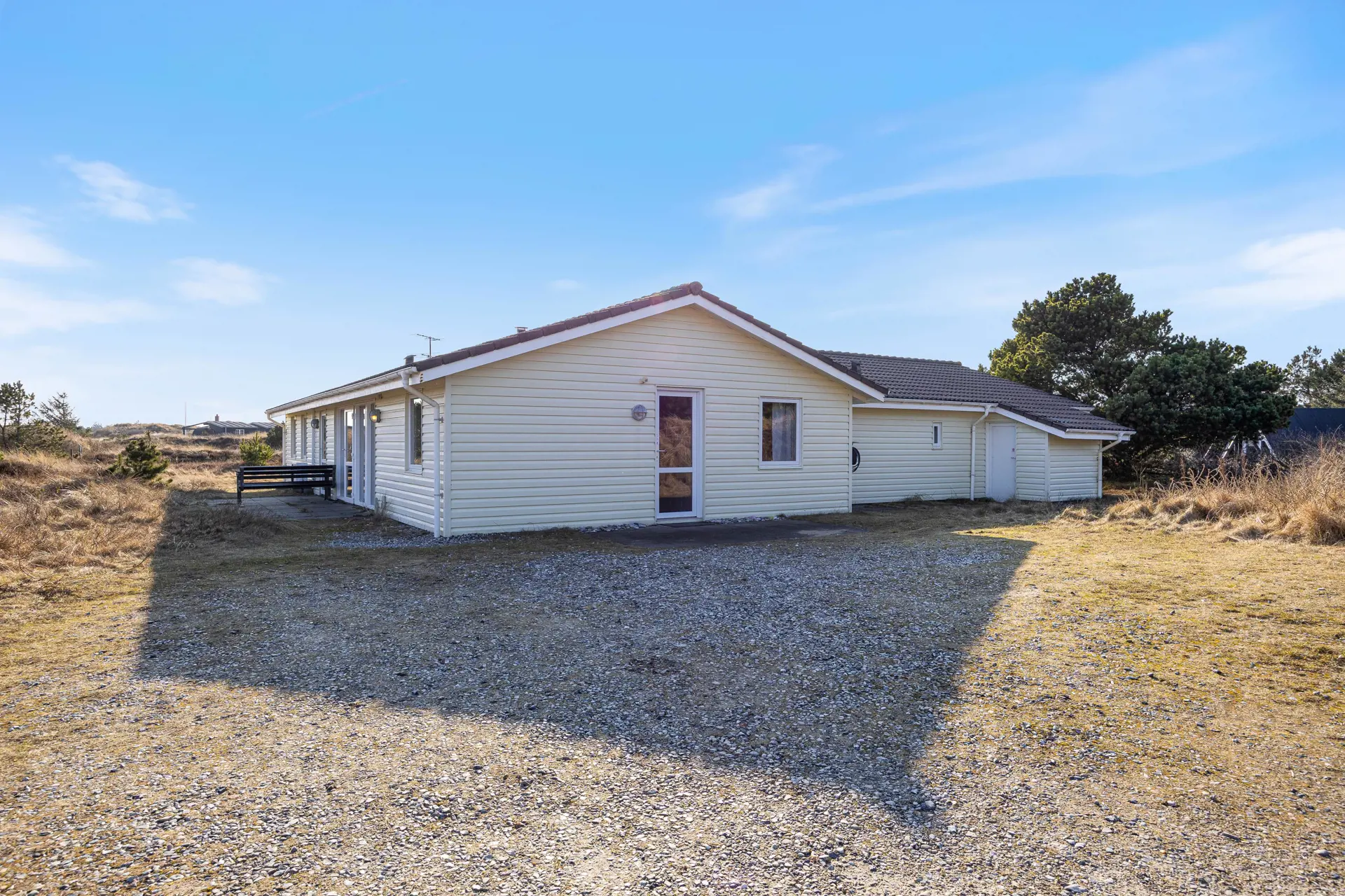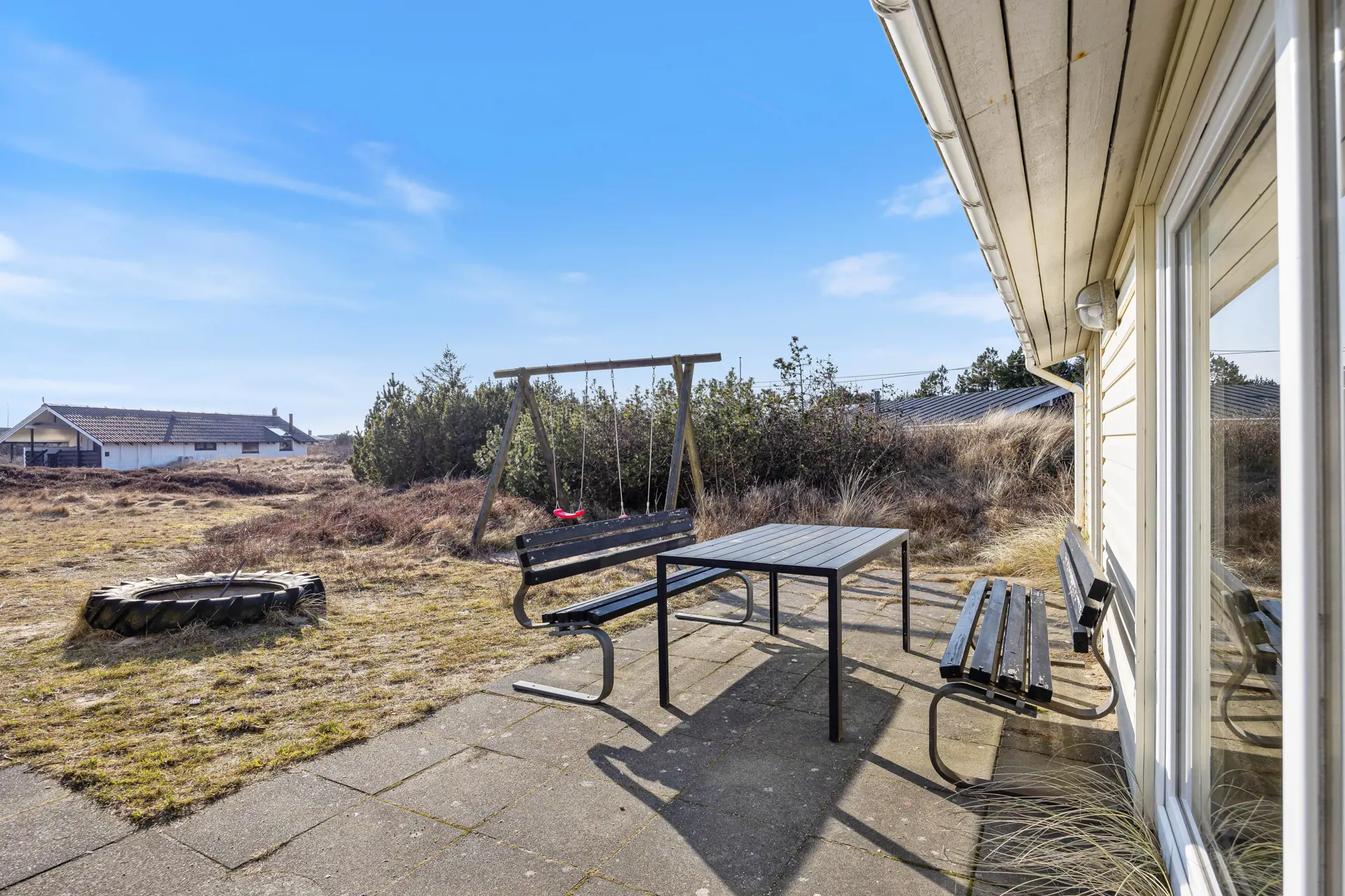 Das Ferienhaus liegt auf einem idyllischen Naturgrundstück, umgeben von Dünen, was eine ruhige und private Atmosphäre schafft. Hier gibt es viel Platz zum Spielen und Entspannen.
