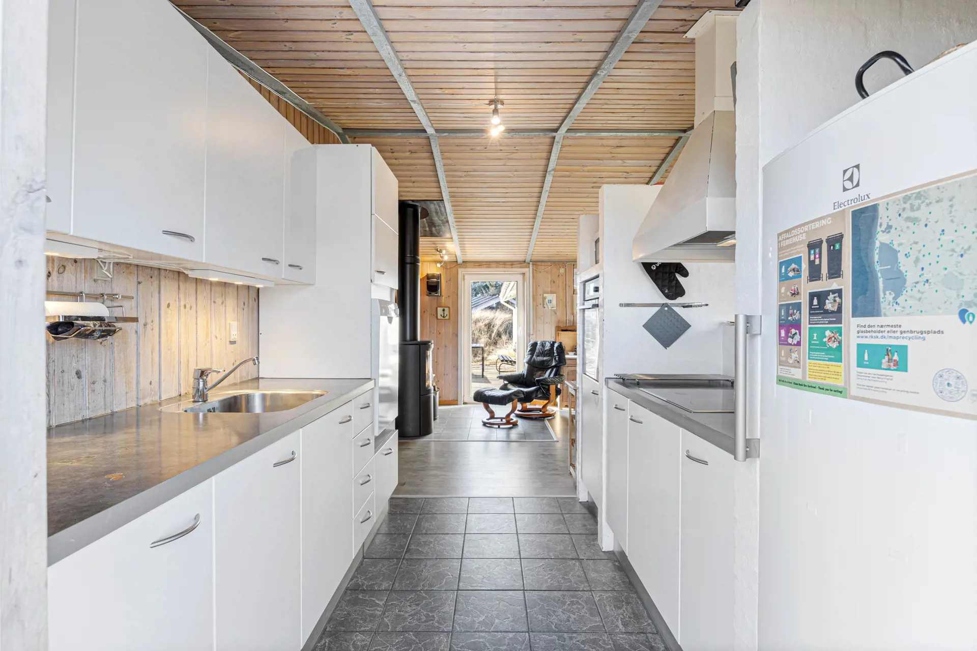 Das Herzstück des Ferienhauses ist der offene Wohnbereich, in dem Küche, Essbereich und Wohnzimmer ineinander übergehen. Hier könnt ihr euch am Esstisch versammeln oder auf dem Sofa mit Blick in die Natur entspannen. Der Kaminofen sorgt für eine behagliche Atmosphäre, während die Wärmepumpe ganzjährig für angenehme Temperaturen sorgt. Die Küche ist mit einem Geschirrspüler ausgestattet, sodass die praktischen Aufgaben schnell erledigt sind.