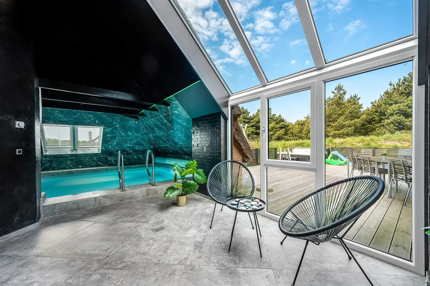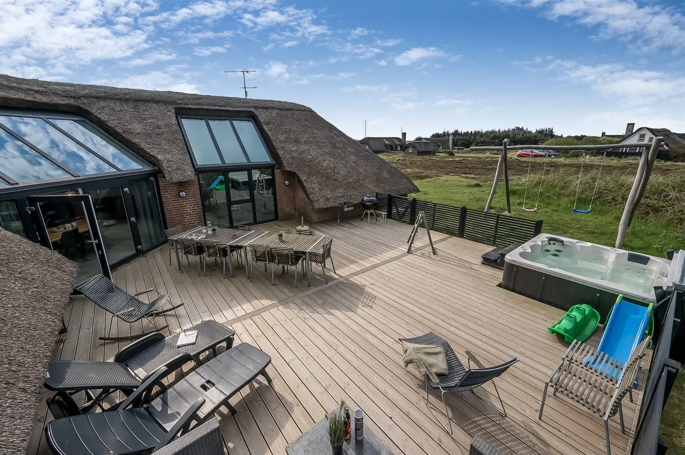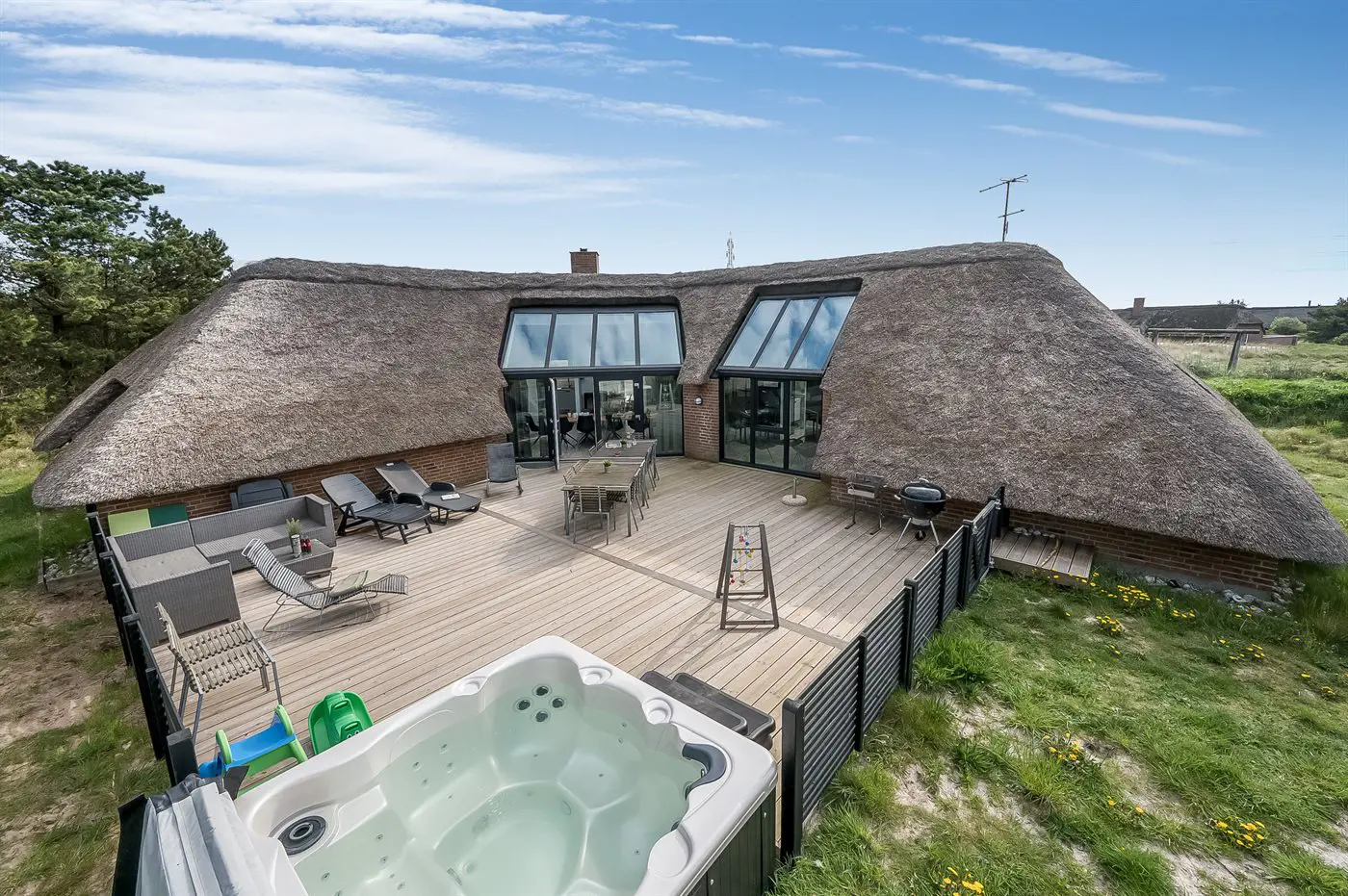 Schönes Ferienhaus mit u. a. Swimmingpool und einem guten Terrassenbereich mit einem großen Außenwhirlpool.