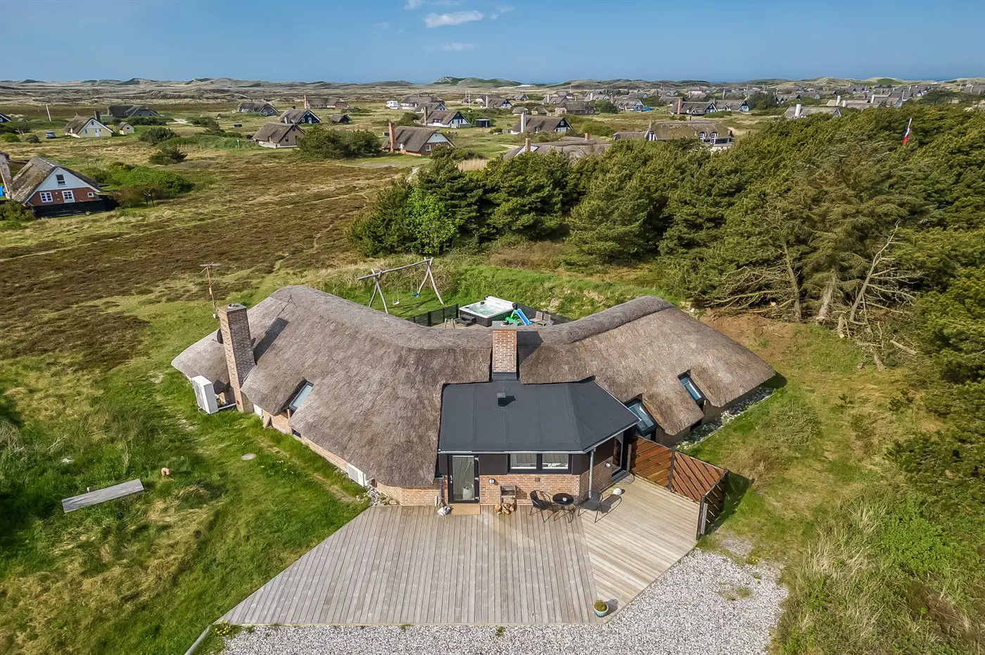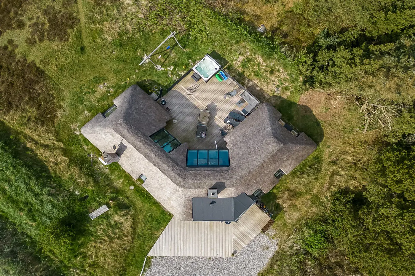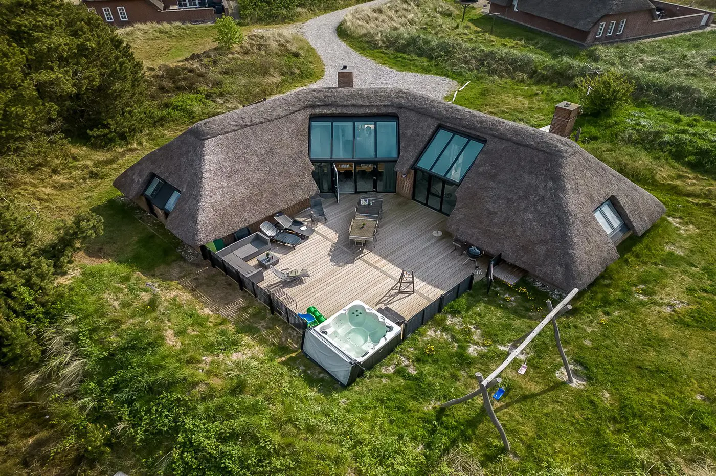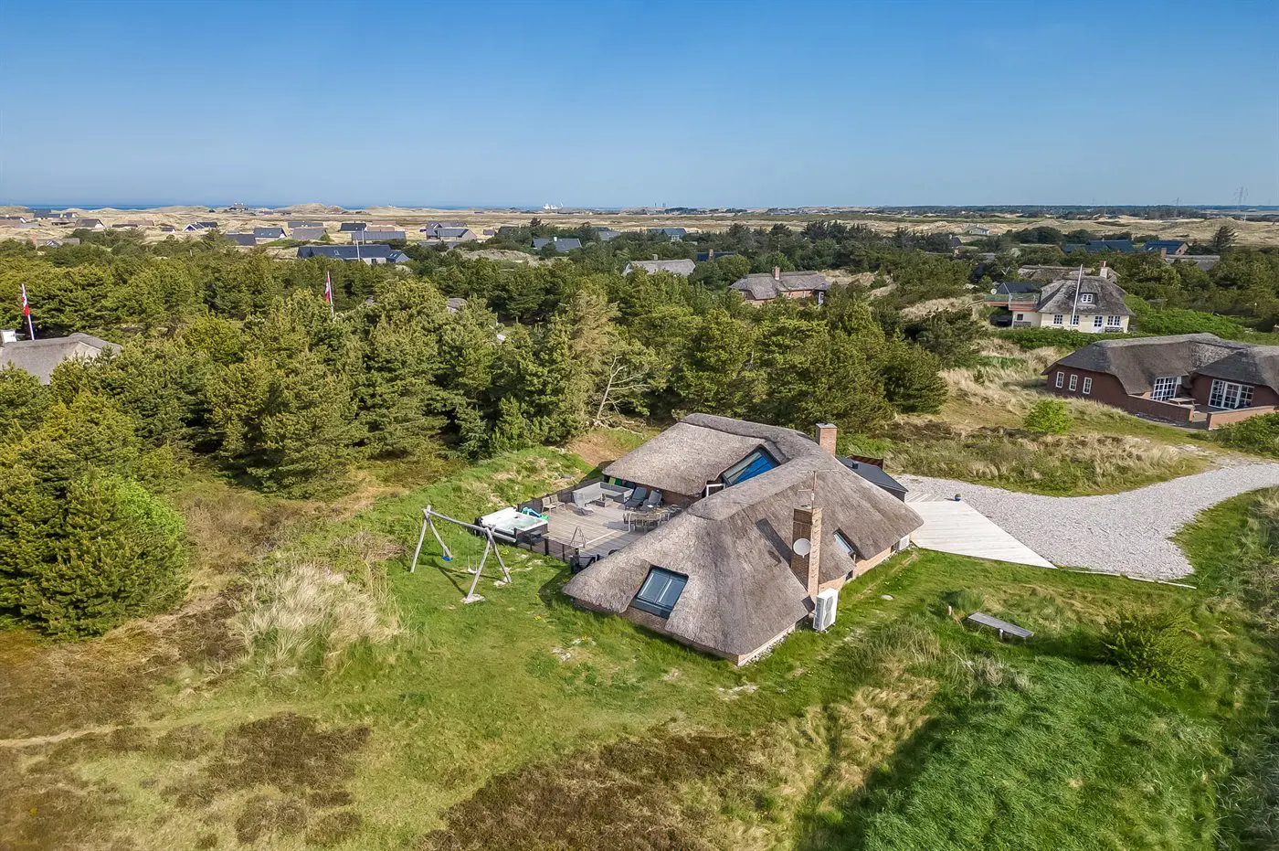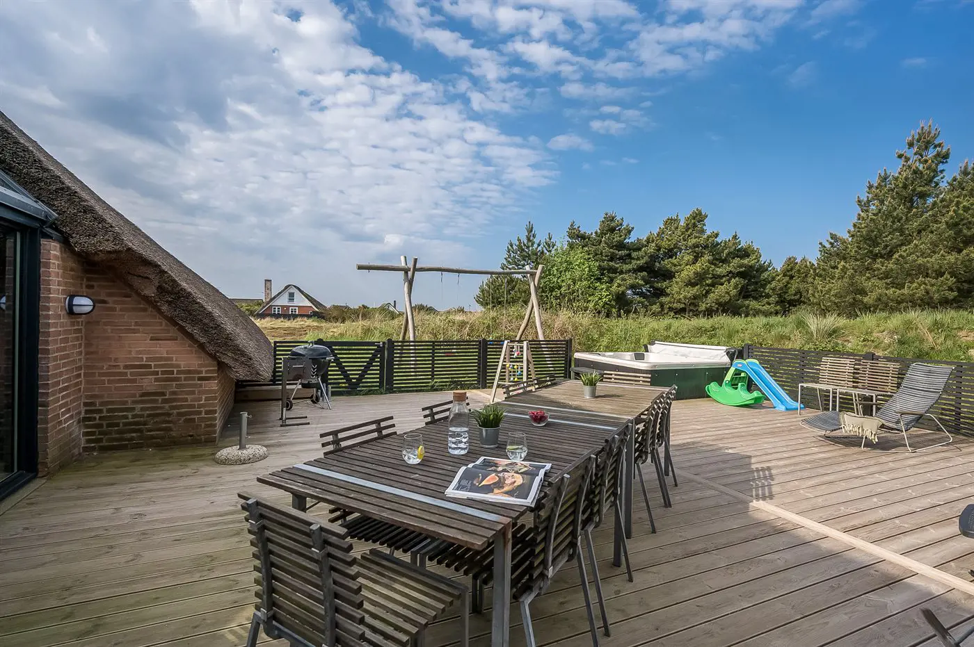 Die Ferienunterkunft liegt auf einem 2537 m² großen Naturgrundstück. Die Entfernung zum Meer beträgt 750 m. Die Entfernung zum Fjord beträgt 750 m. Die nächste Einkaufsmöglichkeit liegt 6000 m entfernt. In einem Abstand von 7000 m gibt es einen Golfplatz. Das Ferienhaus verfügt über eine teilweise geschlossene Terrasse. Schaukel. Es steht ein Grill zur Verfügung. Es ist ein Ladestecker für Elektroautos installiert. Mit einer Ladeleistung von 11 kW. Parkplatz auf dem Grundstück.