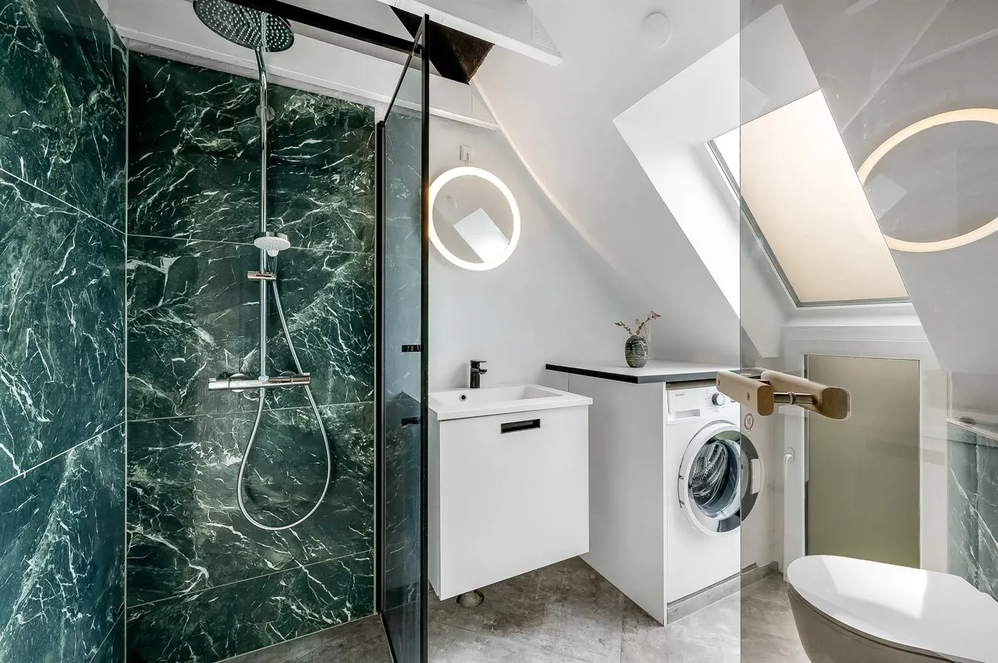 Es gibt 2 Badezimmer mit Duschnische und 2 Toiletten. Fußbodenheizung in 2 Badezimmern. Es steht eine Sauna zur Verfügung in der Sie sich so richtig entspannen können.