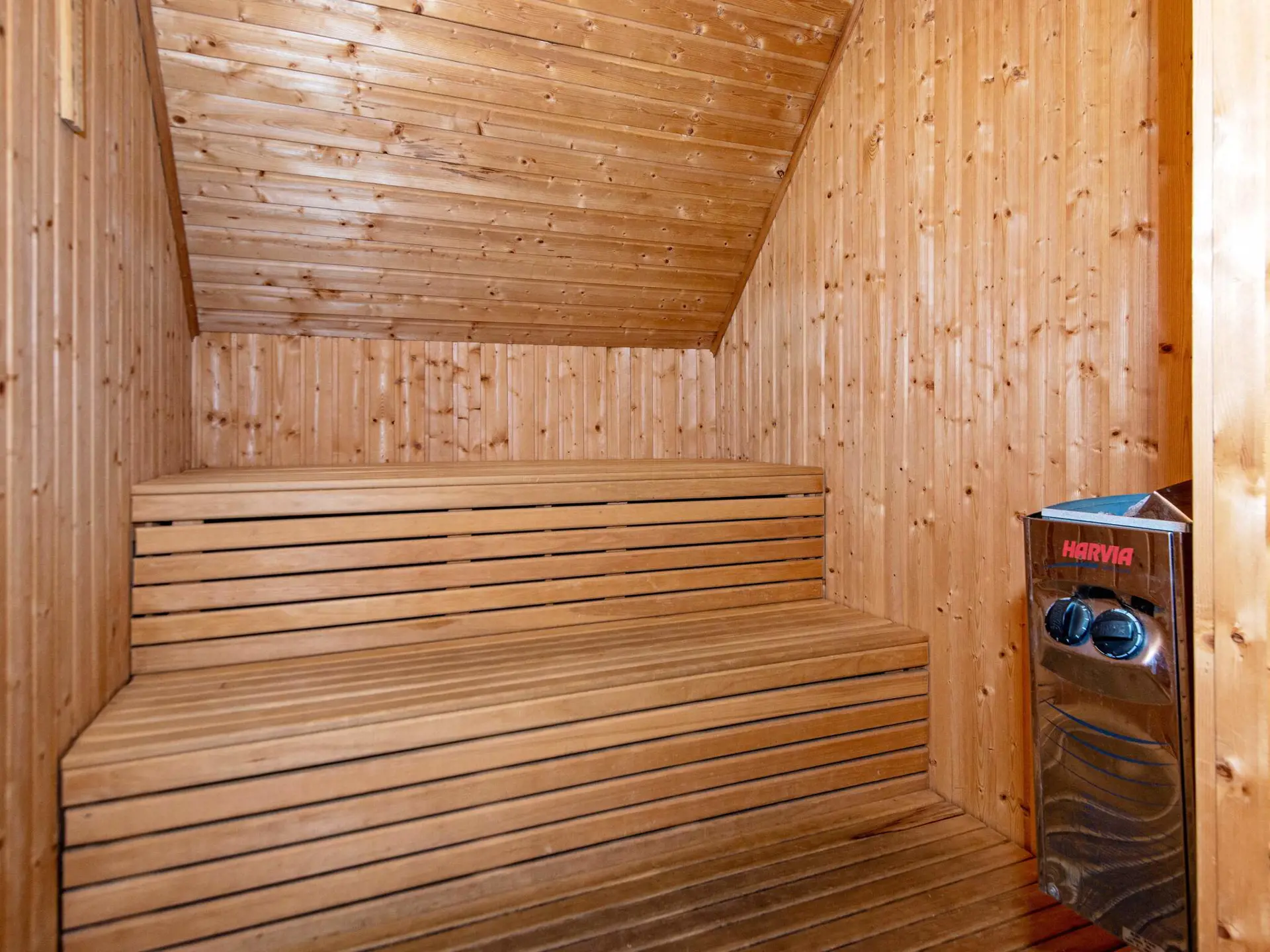 Der Pool des Hauses ist ganze 20 m2 groß. Vorne am Fenster steht zudem ein Whirlpool mit Ausblick zu den Dünen bereit. An kühleren Tagen kann man auch die Wärme in der Sauna genießen.