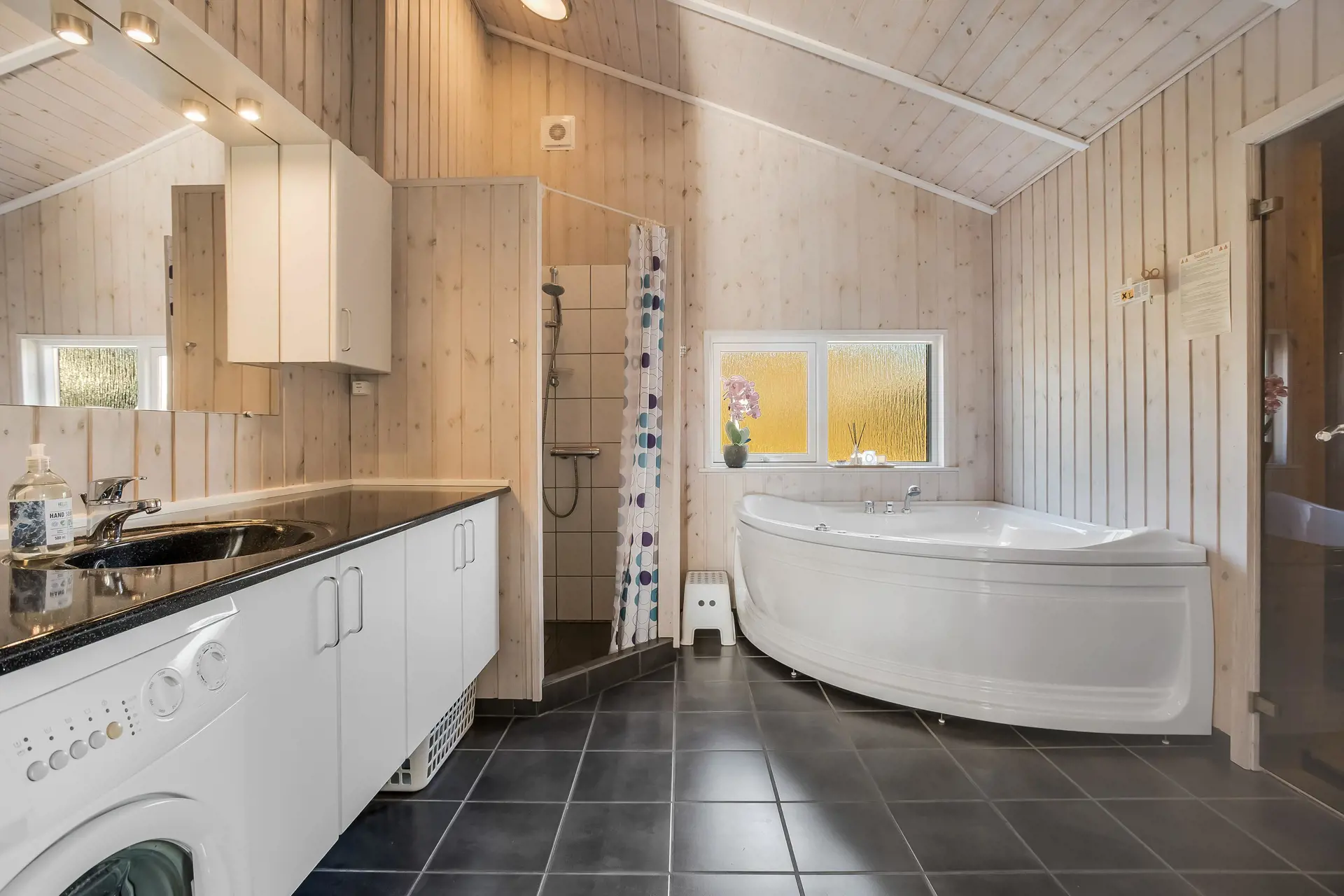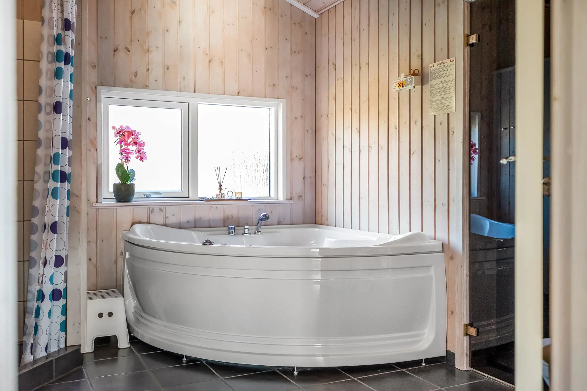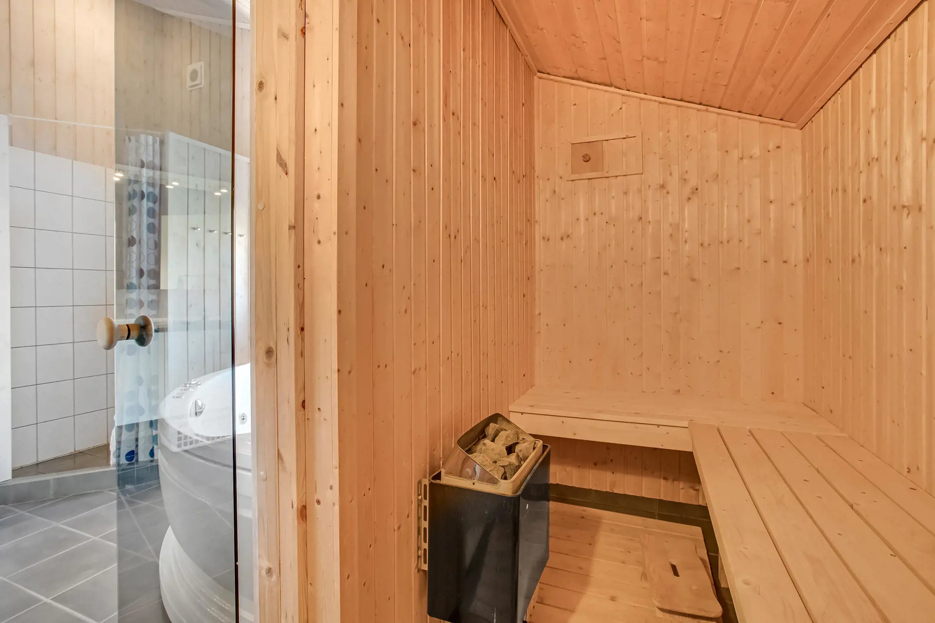 Das Badezimmer verfügt über eine Duschkabine, ein WC sowie Fußbodenheizung. Außerdem gibt es im Haus eine Sauna, in der Sie sich nach einem Tag am Meer entspannen können. Zusätzlich steht ein Innen-Whirlpool für 2 Personen zur Verfügung.