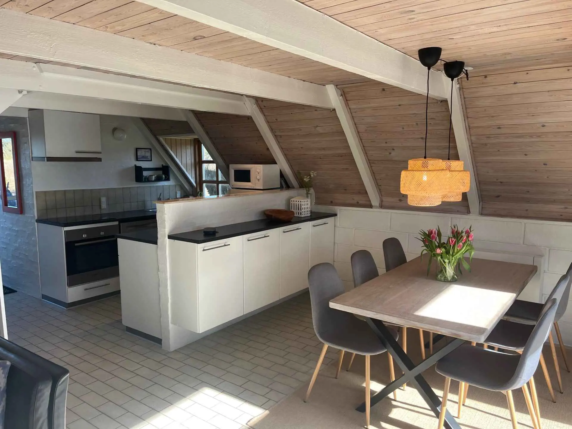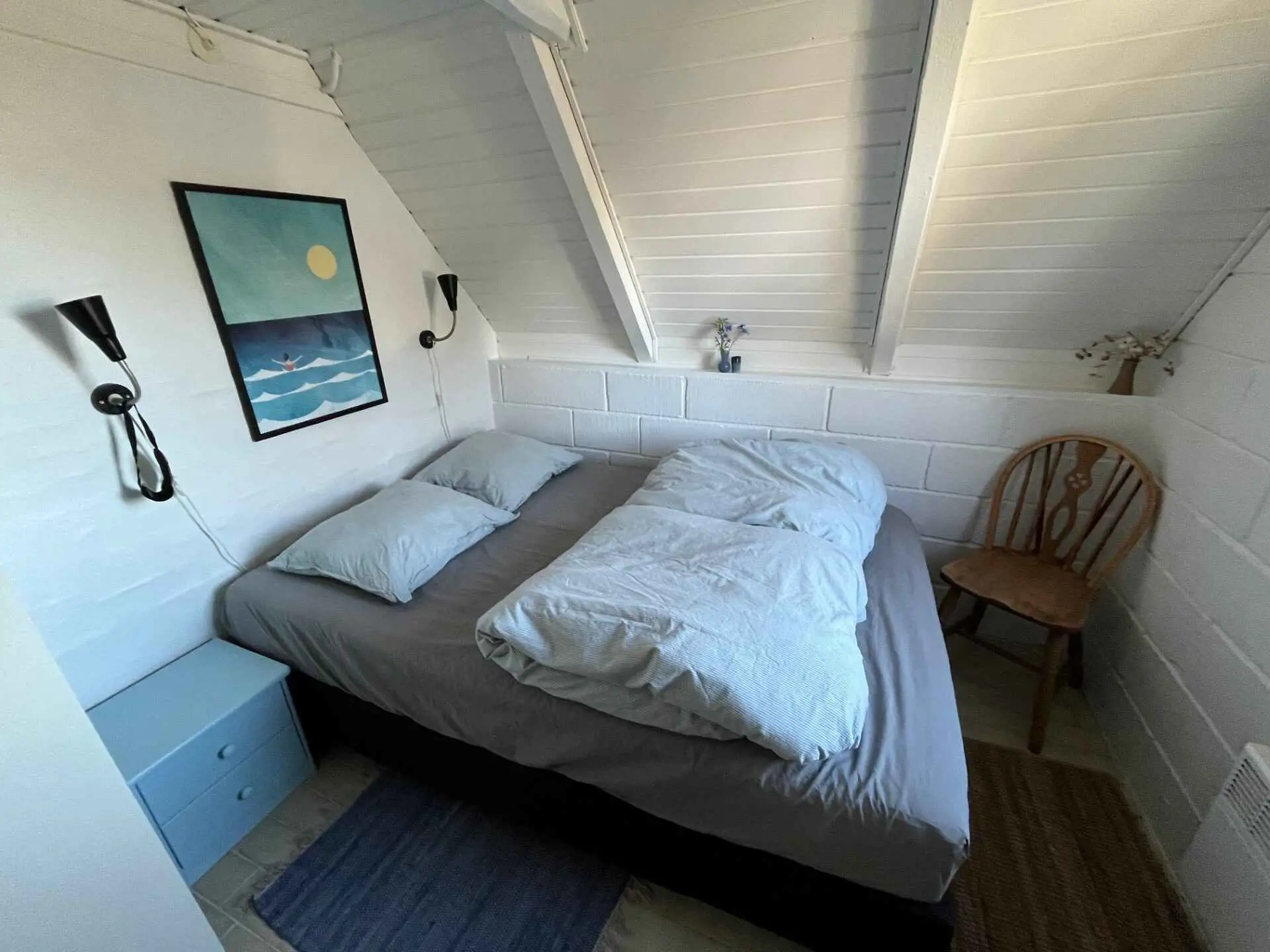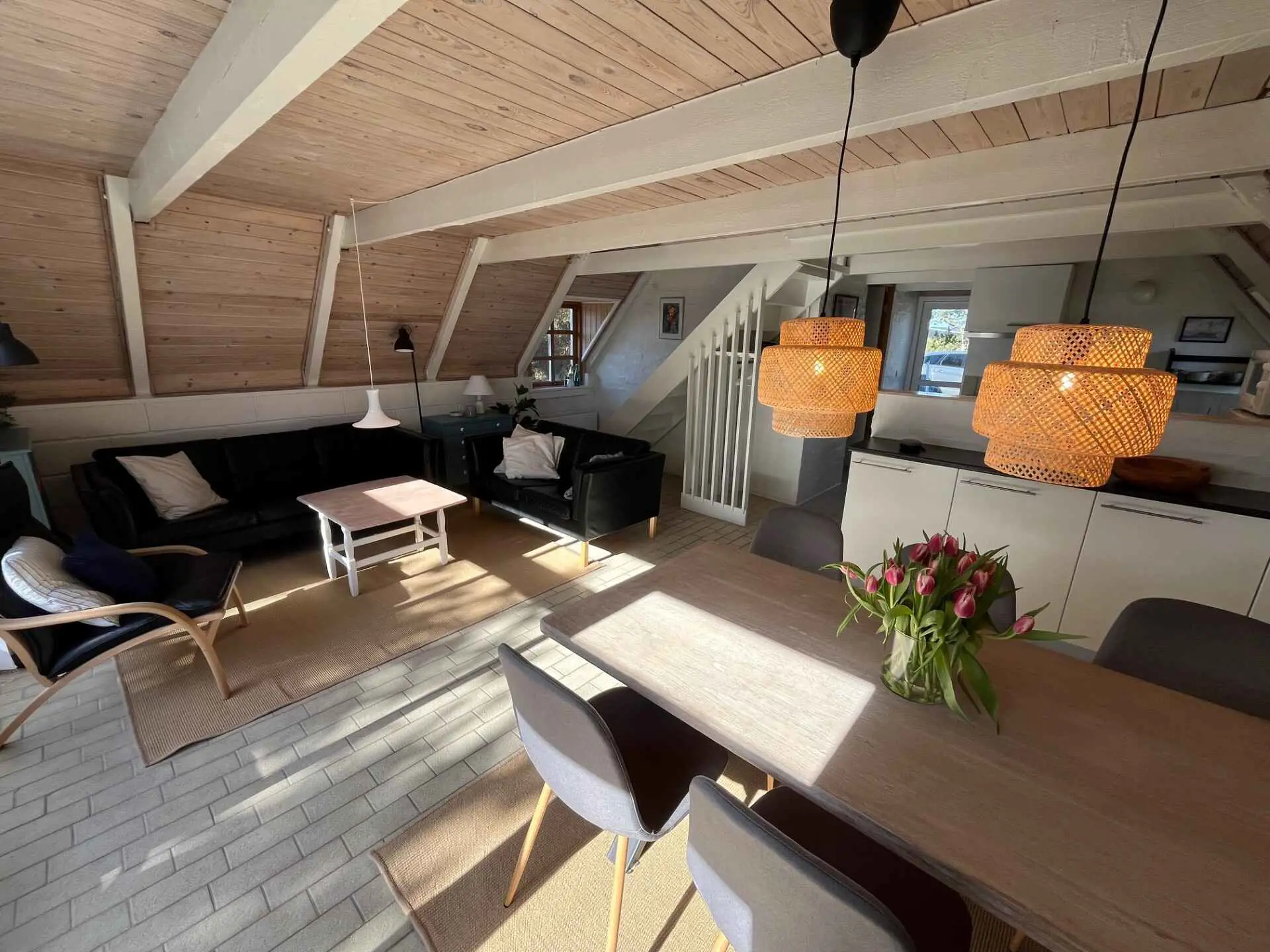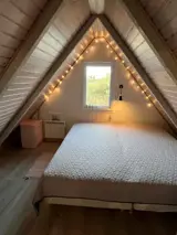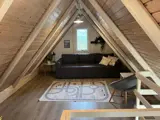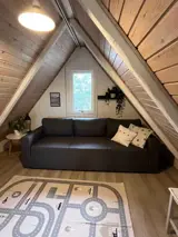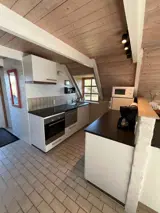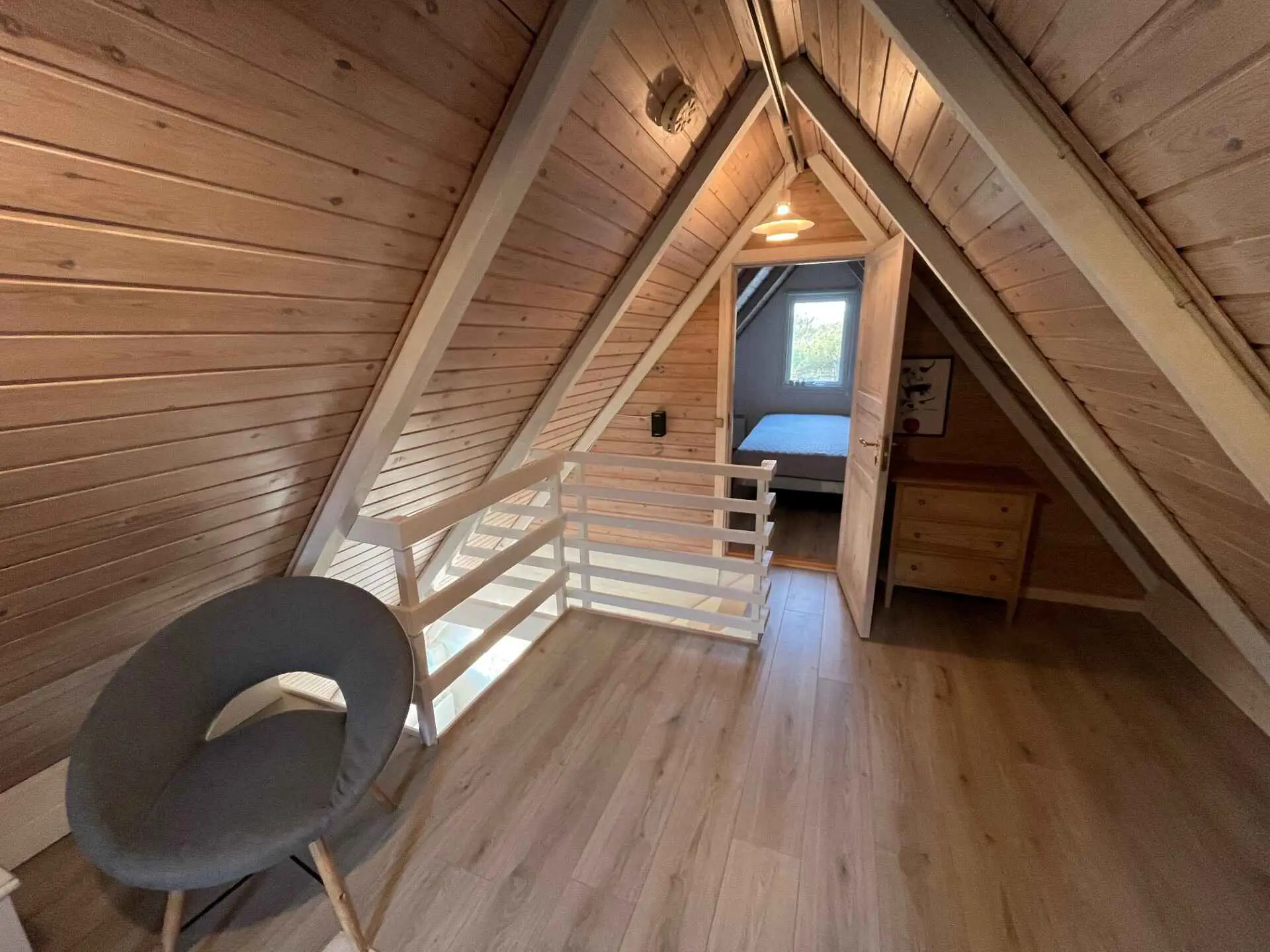 Innen ist das Haus hell und freundlich eingerichtet. Im Erdgeschoss befinden sich ein Schlafzimmer, ein Badezimmer sowie eine offene Küche mit Wohnbereich. Im Obergeschoss gibt es ein weiteres Schlafzimmer sowie ein zusätzliches gemütliches Wohnzimmer, ideal für Ruhe oder für die Spielsachen der Kinder.