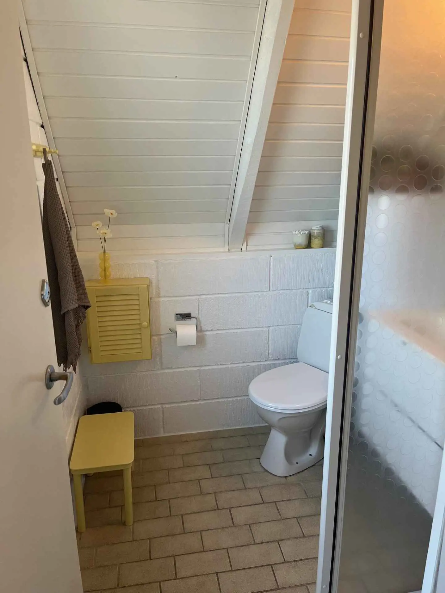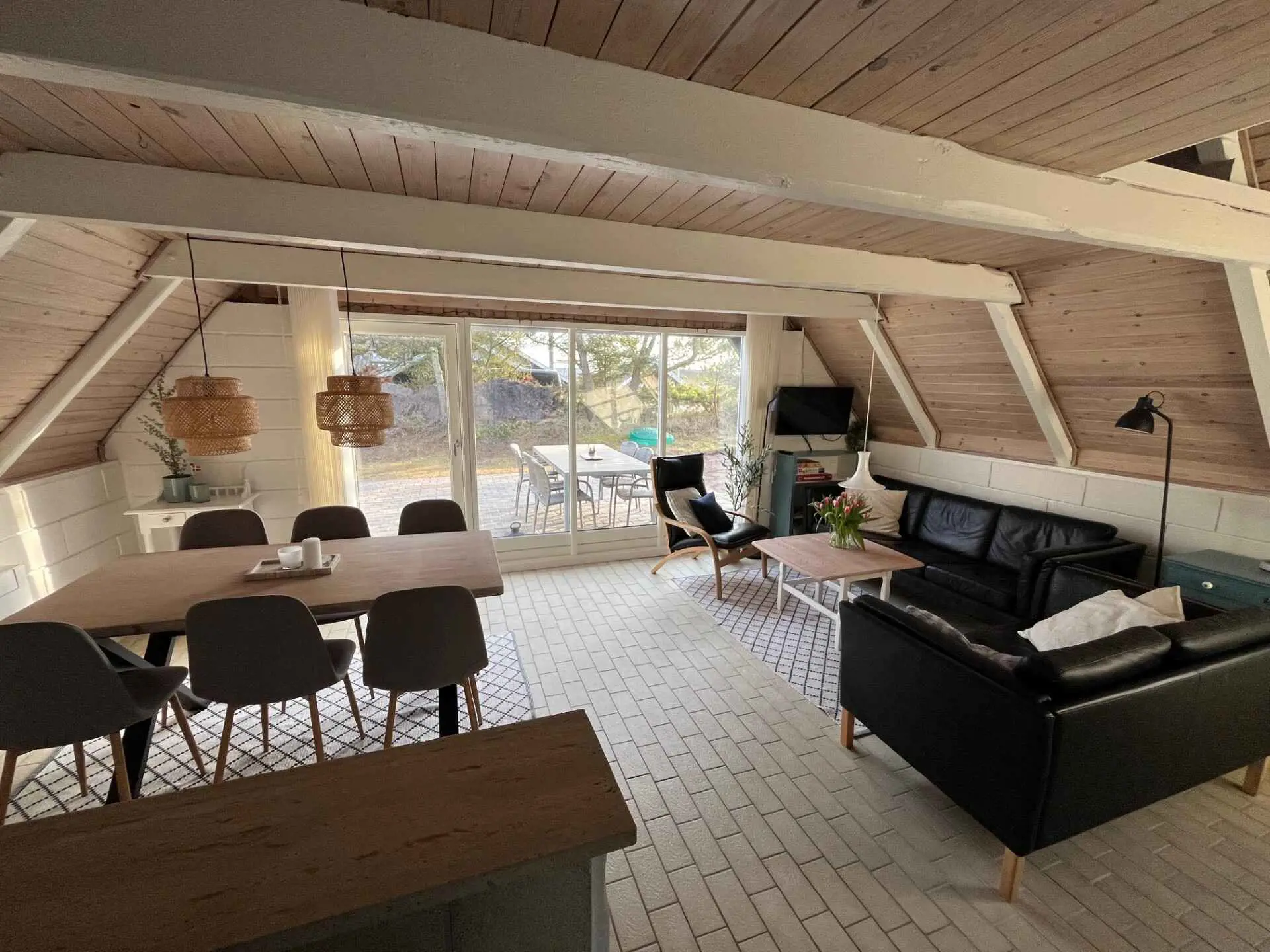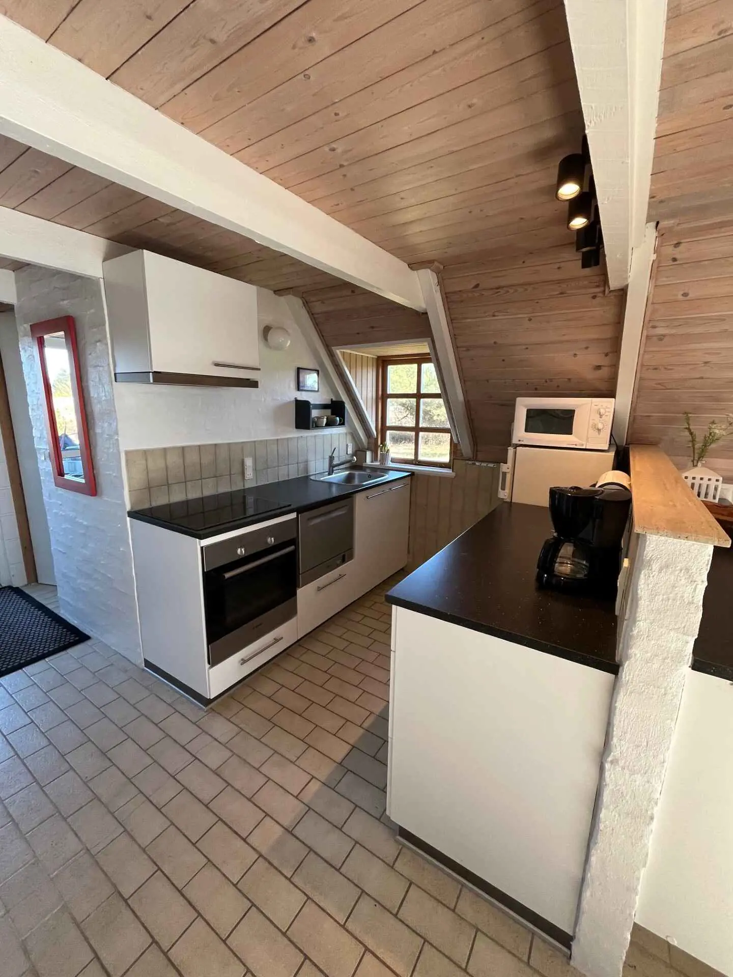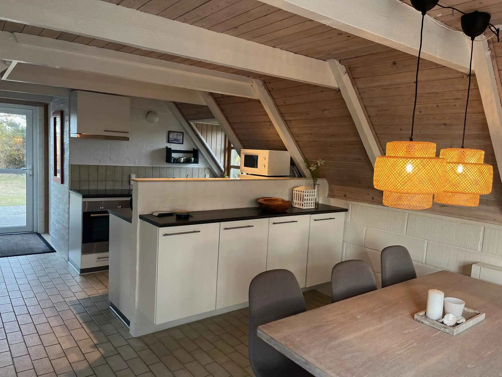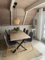 Innen ist das Haus hell und freundlich eingerichtet. Im Erdgeschoss befinden sich ein Schlafzimmer, ein Badezimmer sowie eine offene Küche mit Wohnbereich. Im Obergeschoss gibt es ein weiteres Schlafzimmer sowie ein zusätzliches gemütliches Wohnzimmer, ideal für Ruhe oder für die Spielsachen der Kinder.
