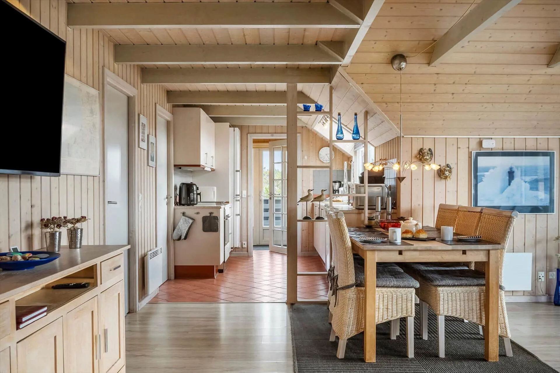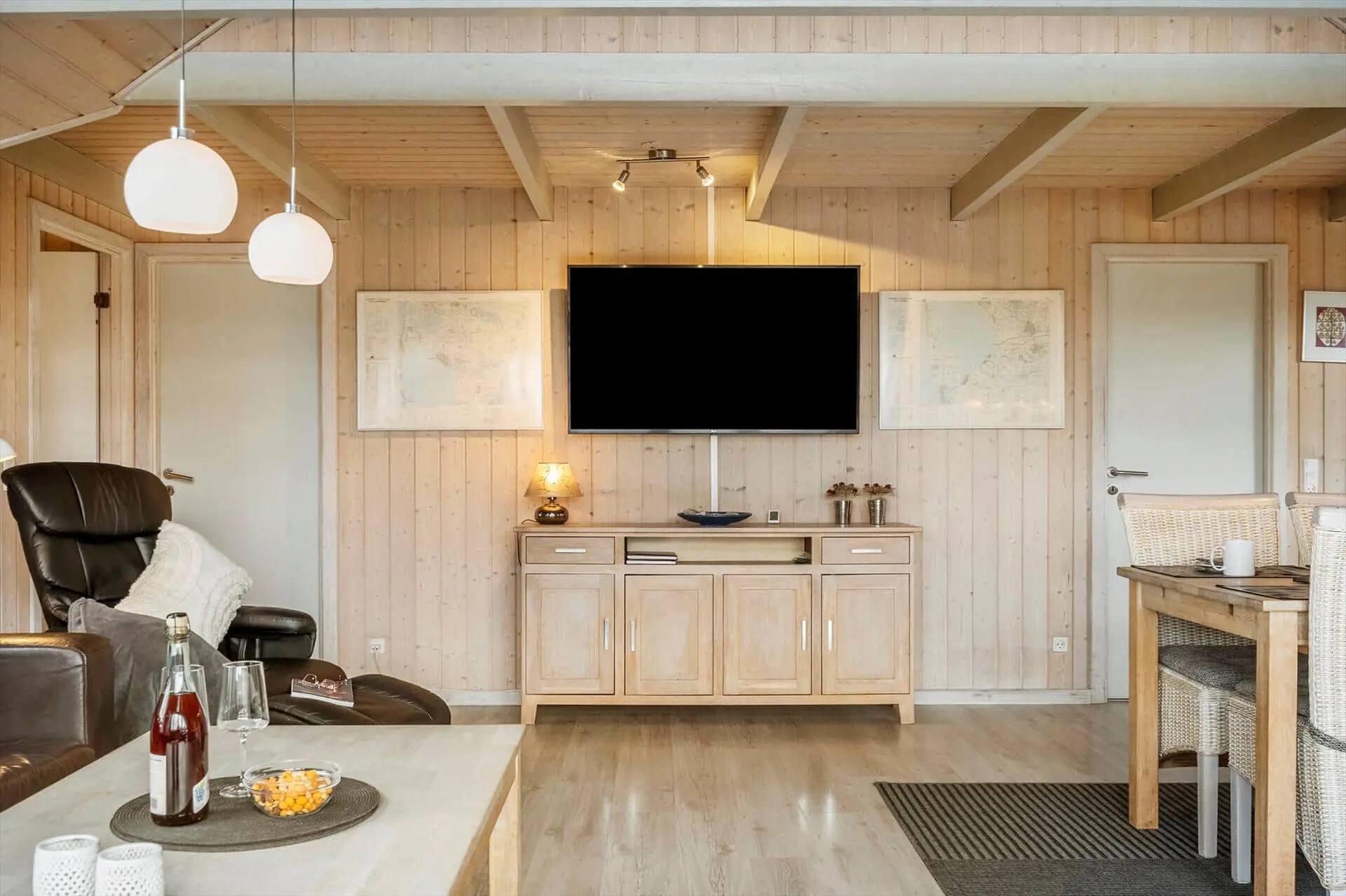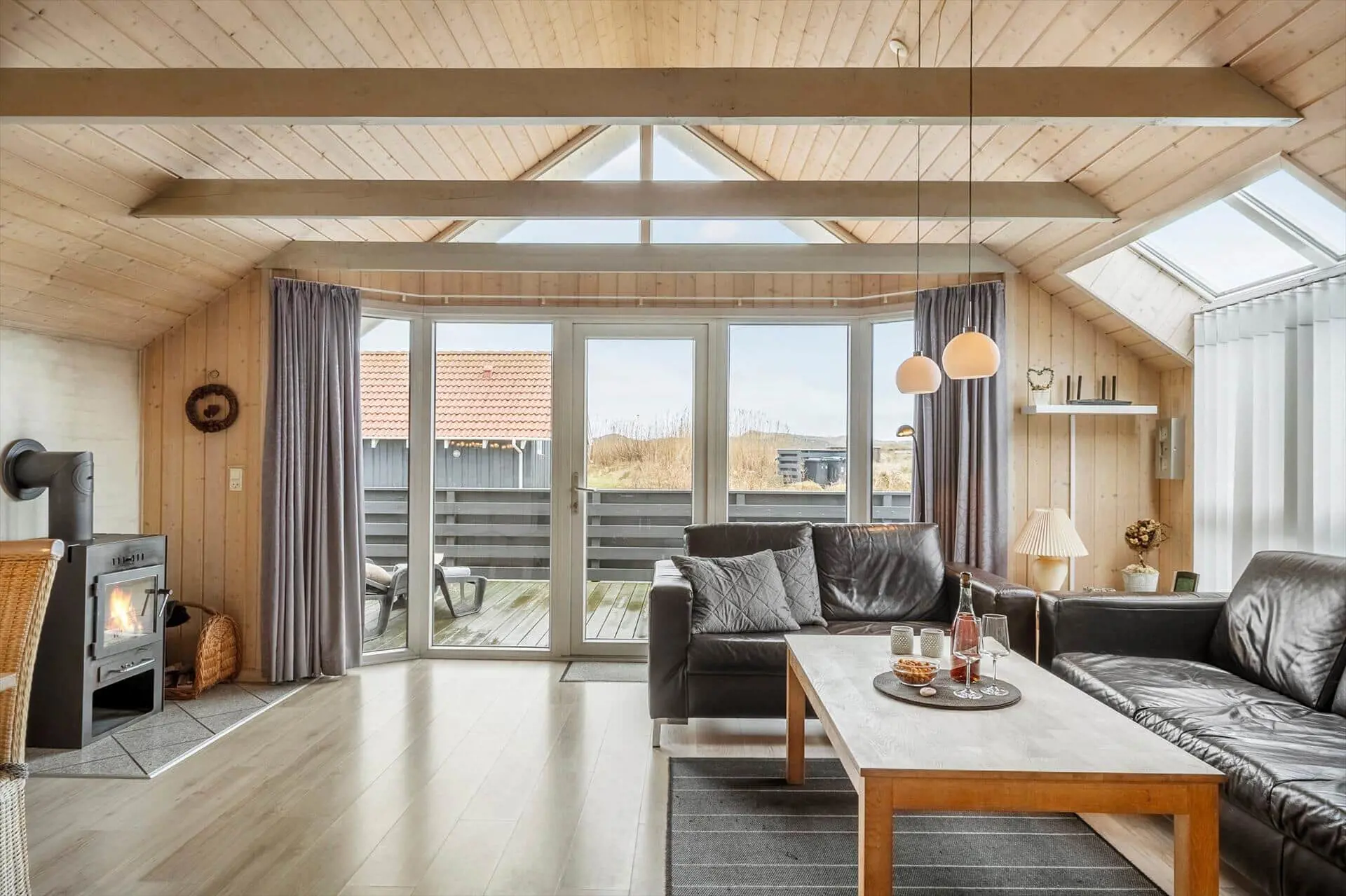 Treten Sie ein in die Gemütlichkeit und Ruhe dieses charmanten Ferienhauses, wo Materialien und Licht harmonisch zu einer warmen und behaglichen Atmosphäre verschmelzen. Zeitlose nordische Eleganz trifft hier auf modernen Komfort. Der offene Grundriss lädt zum geselligen Beisammensein ein, während das gemütliche Wohnzimmer mit Kaminofen und effizienter Heizung an kühlen Abenden für wohlige Wärme sorgt. Die gut ausgestattete Wohnküche bietet Platz für Familie und Freunde, und die funktionalen Schlafbereiche garantieren einen erholsamen Schlaf. Genießen Sie den weiten Blick durch die großen Fenster, die die Natur zum Greifen nah bringen, und öffnen Sie die Tür zur sonnigen Terrasse, wo Sie den Tag mit einer Tasse Kaffee beginnen oder mit einem Glas Wein ausklingen lassen können.