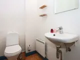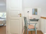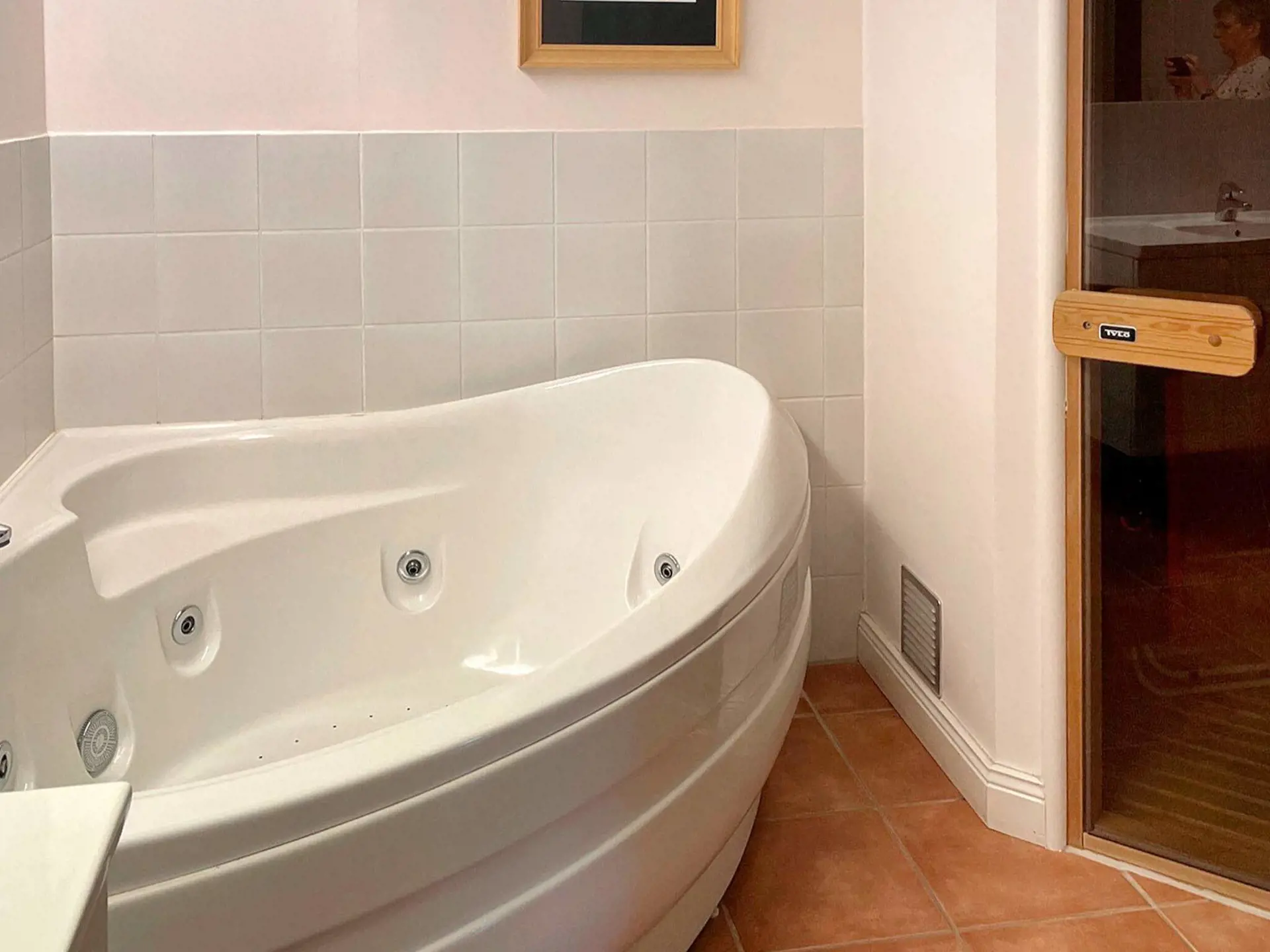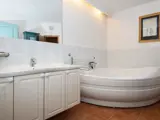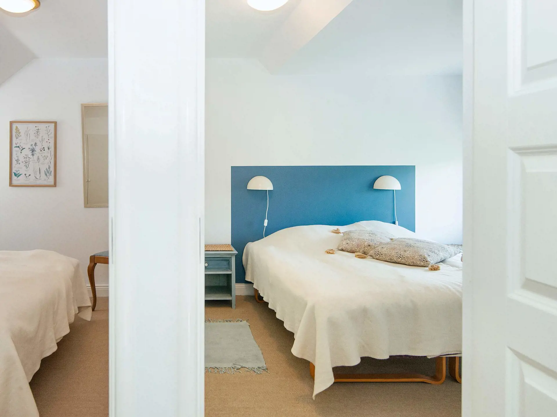 Oben in der 1. Etage findet man zwei Schlafzimmer mit je einem Doppelbett mit Boxspring-Matratzen sowie ein schönes Duschbad mit Fußbodenheizung, Dusche, Whirlwanne für zwei Personen, Waschmaschine und Wäschetrockner sowie direktem Zugang zur Sauna. Separates WC mit Waschbecken.