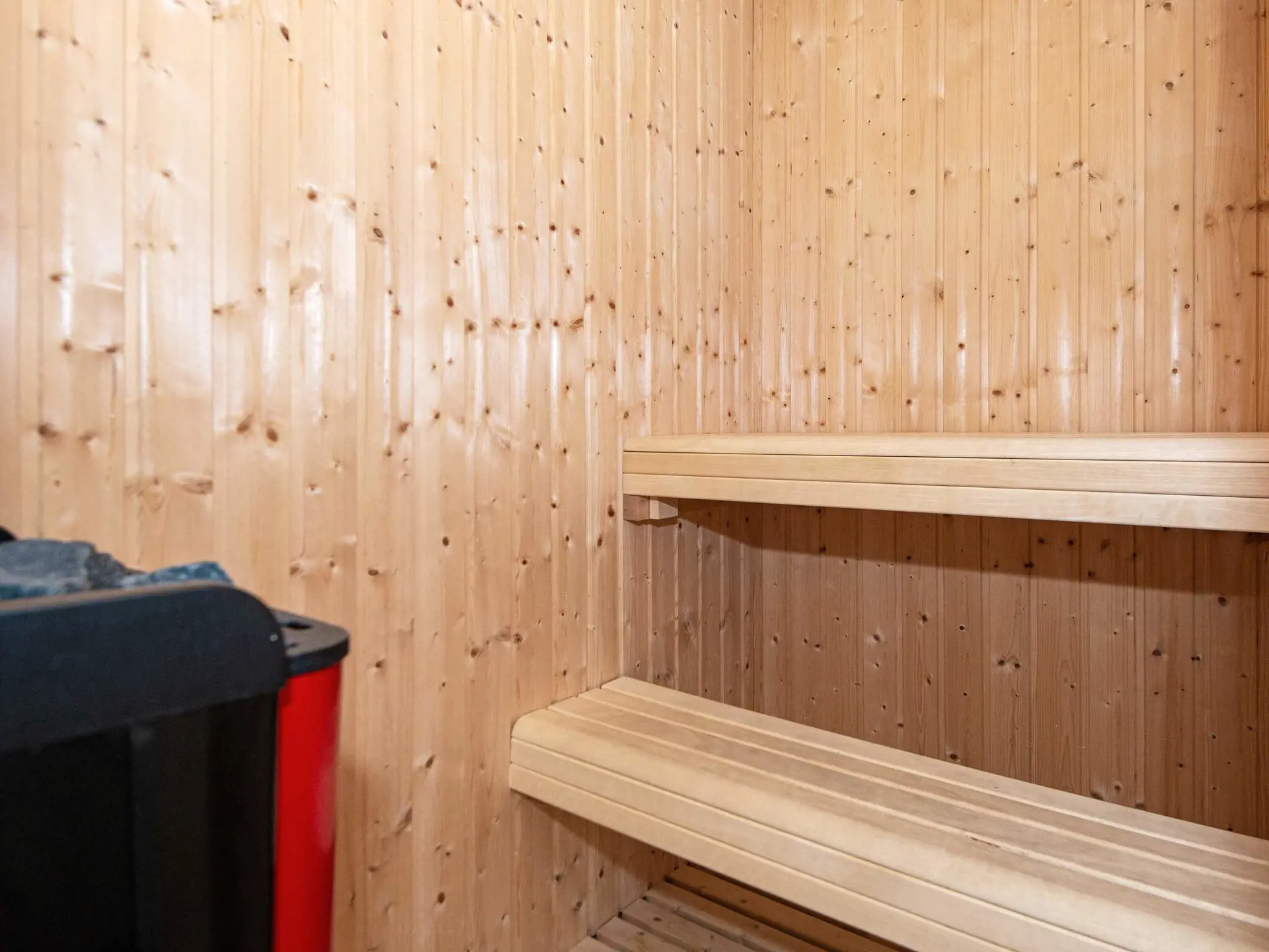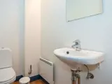 Schönes Duschbad mit Fußbodenheizung, Dusche, Whirlwanne für zwei Personen, Waschmaschine und Wäschetrockner sowie direktem Zugang zur Sauna. Separates WC mit Waschbecken.