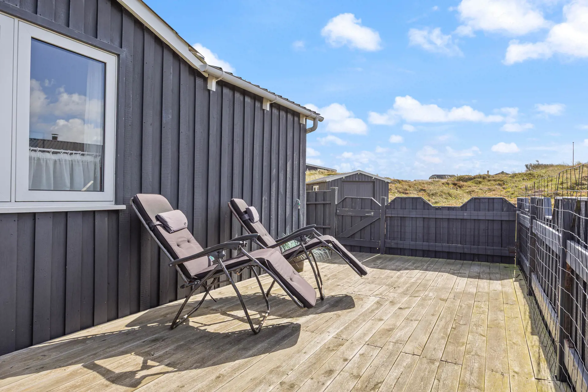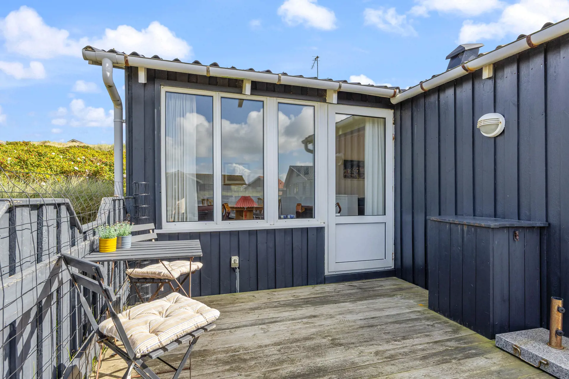 Die abgeschirmte und geschlossene Terrasse ist ideal für gemütliche Grillabende und zum Entspannen im Garten. Es sind auch Gartenmöbel vorhanden, sodass ihr die hellen Sommerabende in vollen Zügen genießen können. Die Sonnenliegen laden an warmen, sonnigen Tagen zu einem Sonnenbad ein. Das Ferienhaus befindet sich auf einem Naturgrundstück in den Dünen, was für eine hyggelige Urlaubsatmosphäre sorgt. Das 1200 Quadratmeter große Grundstück bietet viel Platz für Aktivitäten im Freien und zum Spielen.