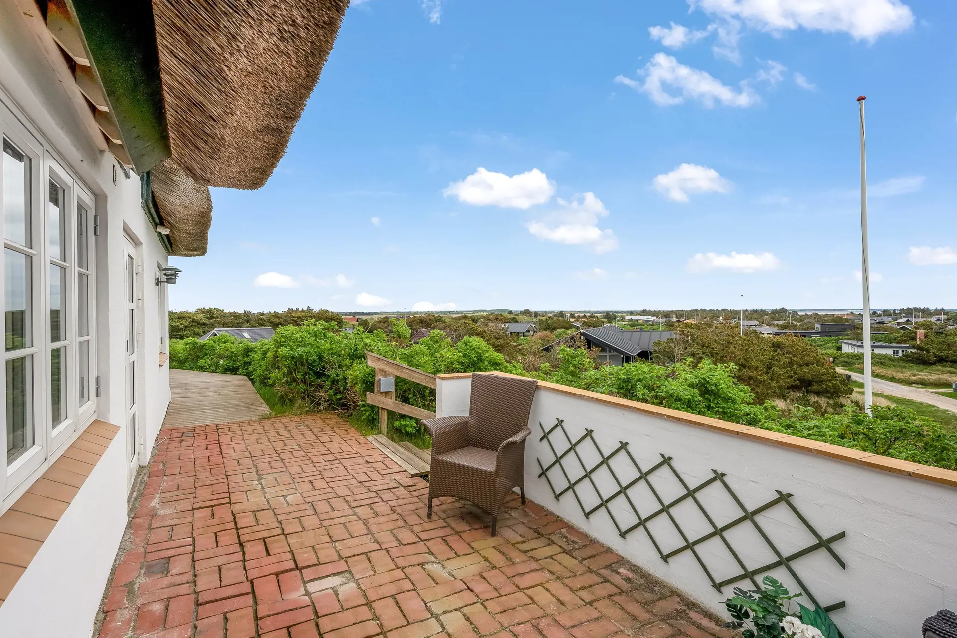 Die offene, abgeschirmte und überdachte Terrasse bietet euch vielfältige Möglichkeiten, die frische Luft zu genießen. Macht es euch auf den Gartenmöbeln bequem, während der Panoramablick über den Ringkøbing Fjord euch in eine andere Welt entführt. Ein gemeinsames Frühstück unter freiem Himmel oder ein Kaltgetränk beim Sonnenuntergang – die Terrasse ist der ideale Ort, um die Seele baumeln zu lassen.