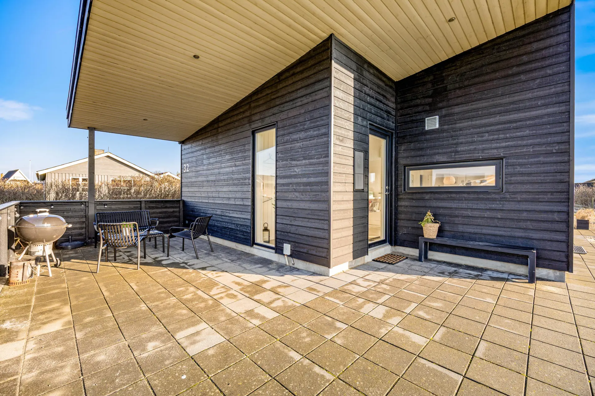 Der Außenbereich des Ferienhauses bietet zahlreiche Möglichkeiten für Spaß und Erholung. Auf dem 1200 m2 großen, eingezäunten Grundstück können Kinder in Sandkasten und an der Schaukel spielen, während ihr auf dem Grill ein köstliches Barbecue zubereitet. Die offene und zum Teil überdachte Terrasse mit Gartenmöbeln sind der ideale Ort, um die frische Luft zu genießen.