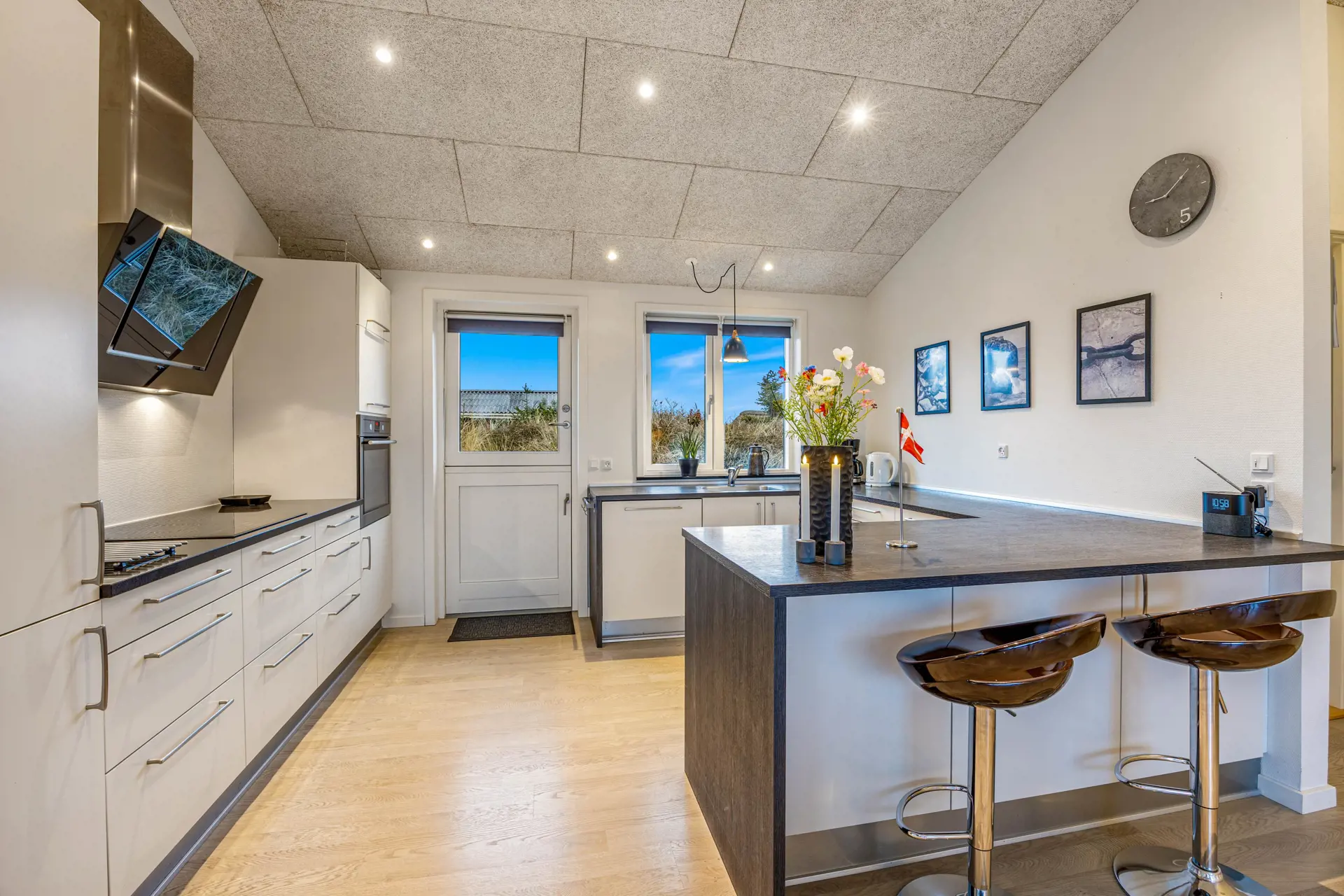 Der zentral gelegene Wohnbereich des Ferienhauses lädt euch zu gemütlichen Abenden ein. Ein Kaminofen verbreitet eine wohlige Wärme, während die moderne Wärmepumpe für eine energieeffiziente Beheizung sorgt. Entspannt euch auf den bequemen Möbeln und genießt gemeinsame Stunden in geselliger Runde. Für die Momente, in denen ihr den Strandtag mit einem selbst zubereiteten Essen abschließen möchtet, steht euch eine gut ausgestattete Küche mit Spülmaschine zur Verfügung, die den Abwasch erleichtert, sodass mehr Zeit für Entspannung und Freude bleibt. Bereitet köstliche Mahlzeiten vor und genießt sie im Essbereich des offen gestalteten Wohnzimmers.