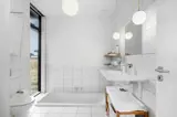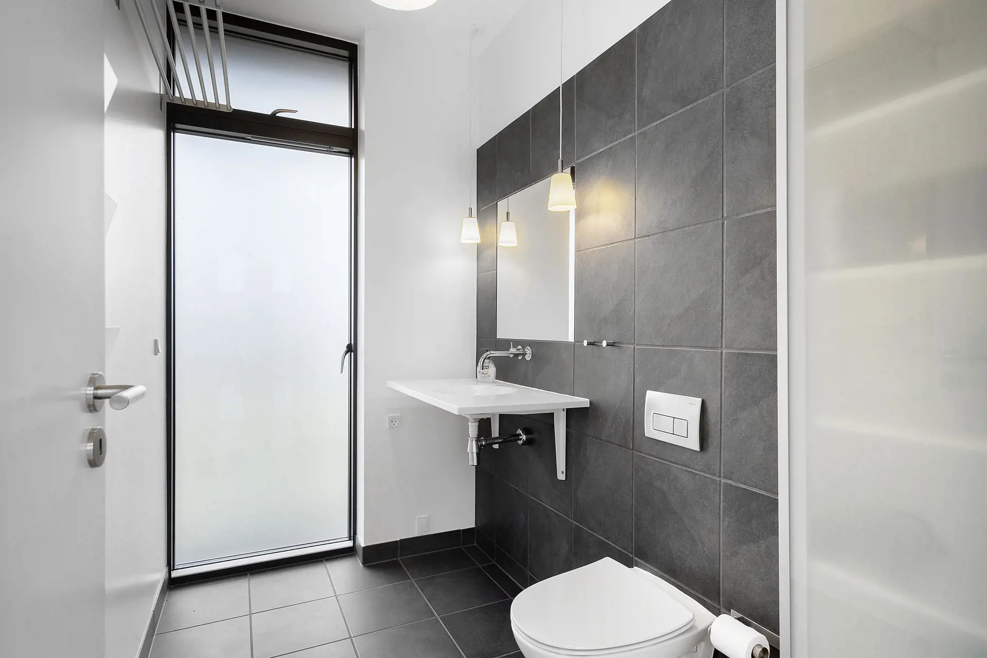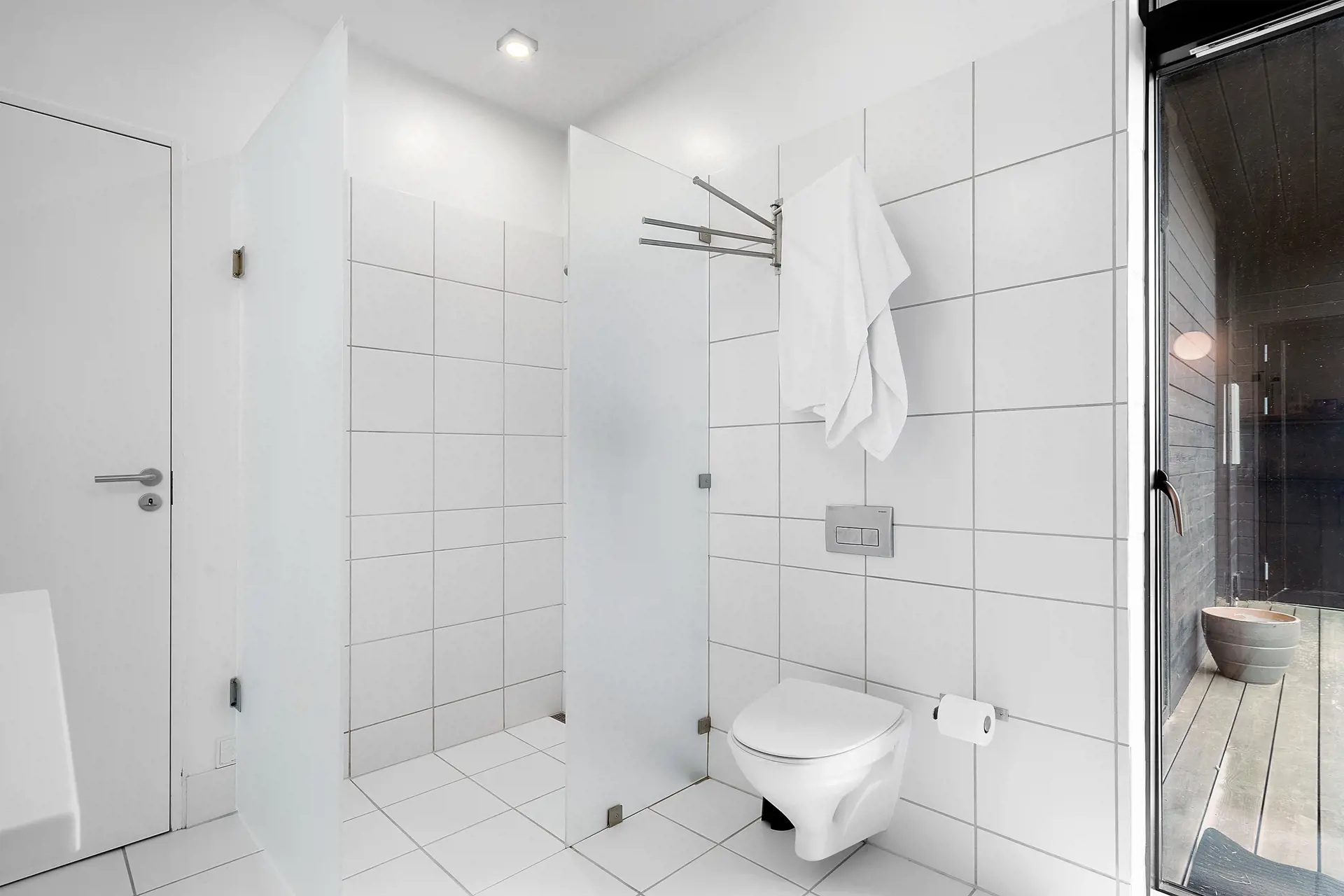 Das große Badezimmer hat neben der Dusche, eine schöne, in den Boden eingelassene Badewanne. Außerdem gibt es eine Gästetoilette. Beides wird über eine Fußbodenheizung beheizt, besonders angenehm, wenn ihr barfuß in den Tag startet.