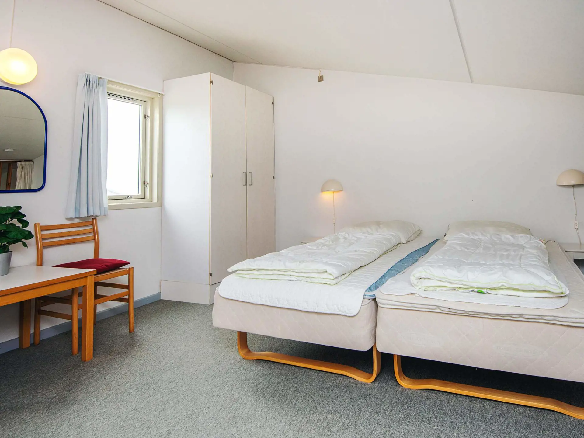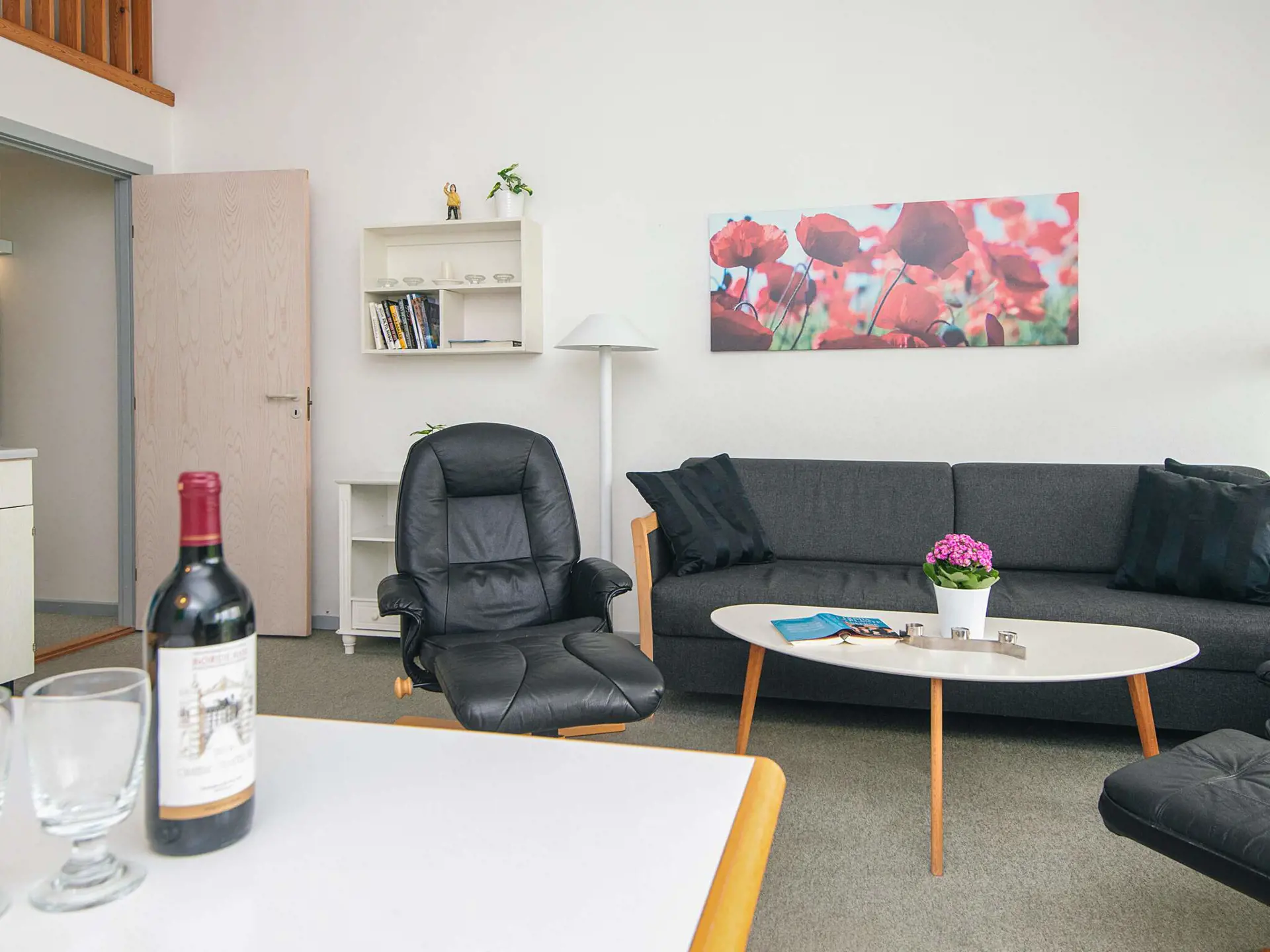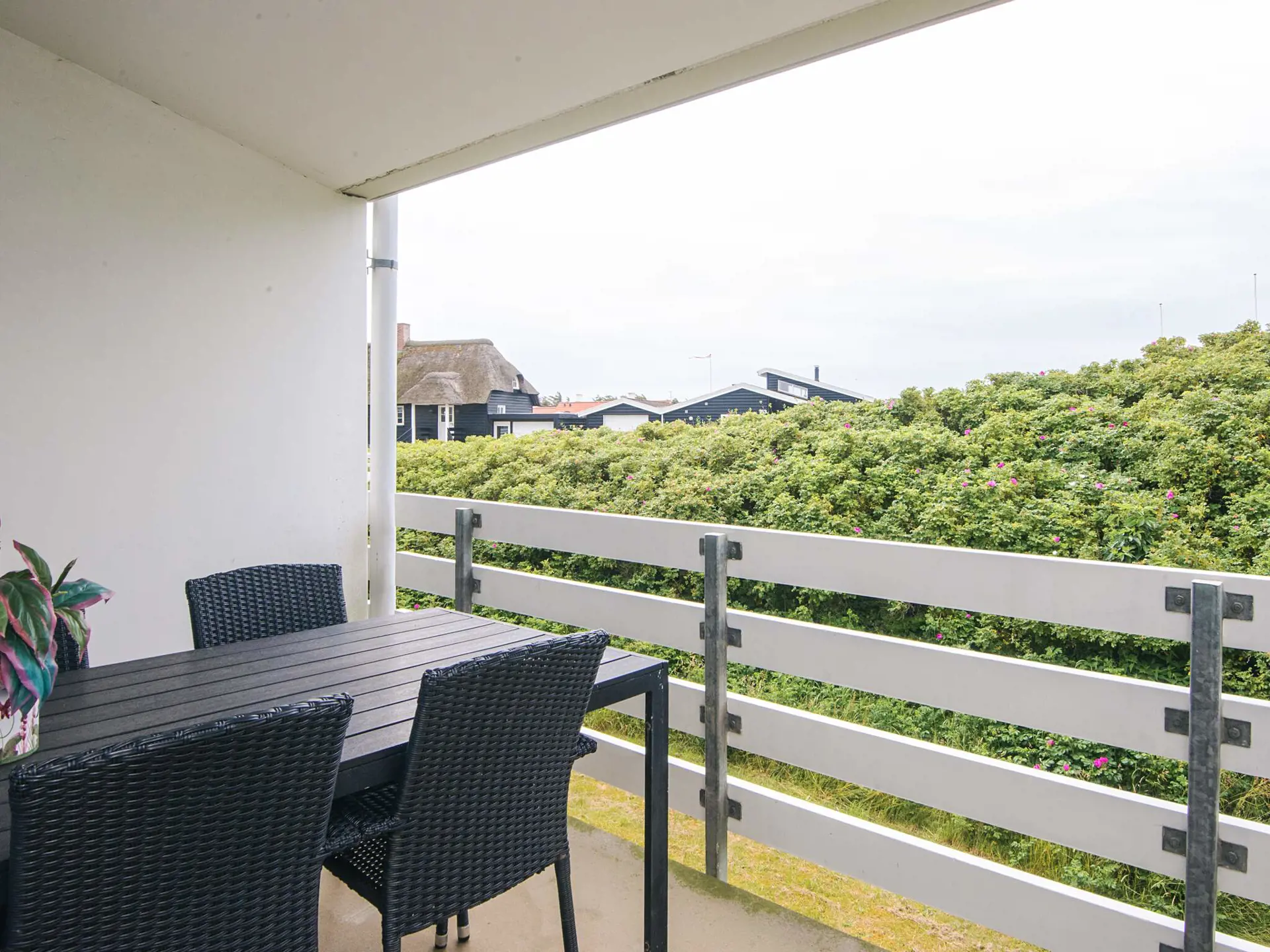Die Wohnung befindet sich in der 1. Etage und hat ein Schlafzimmer mit zwei Einzelbetten, die zu einem Doppelbett zusammengeschoben werden können. Zudem gibt es einen Hems oben unter der Dachschräge mit einem Doppel- sowie einem Etagenbett mit zwei Kojen. Zwei der Betten sind Zustellbetten im Wohnzimmer. Die Küche ist offen mit dem Wohnzimmer verbunden, in dem sich ein Schlafsofa befindet. Vom Wohnzimmer aus hat man Zugang zu einer überdachten Terrasse, auf der man die frische Brise von der Nordsee genießen kann.