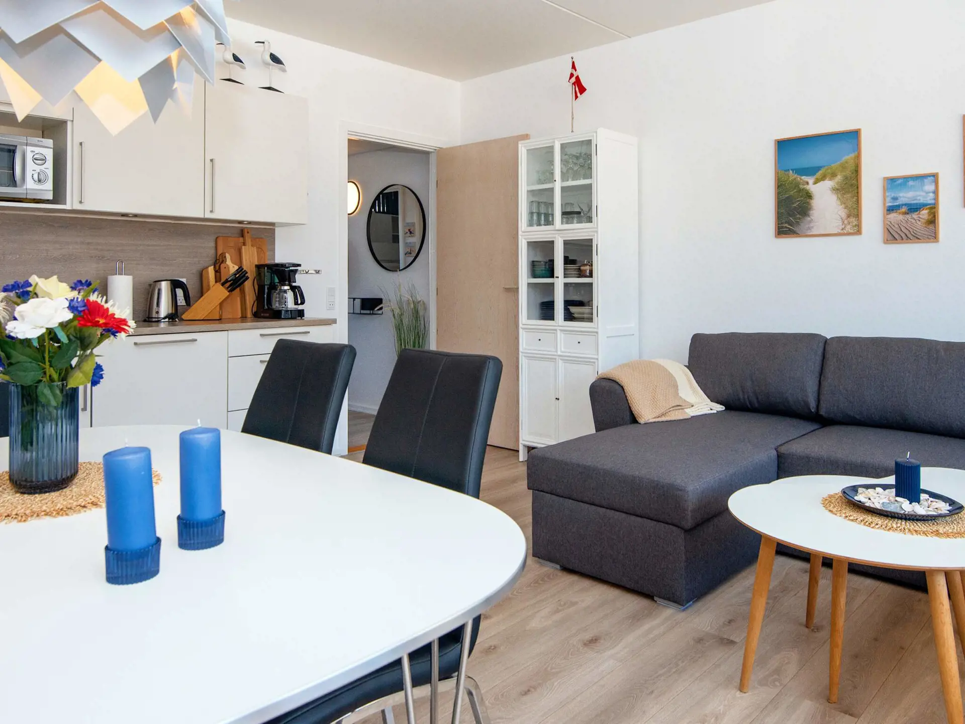 Die im Untergeschoss gelegene Ferienwohnung bietet Küche und Wohnzimmer in einem, mit großer Fensterpartie und Gartentür zu einer kleinen, überdachten Terrasse, von der aus die Nordsee zu hören ist. Im Wohnzimmer befindet sich ein ausziehbares Schlafsofa für zwei Personen. Im Schlafzimmer gibt es ein Doppelbett und ein Etagenbett mit zwei 160 cm langen Kojen für 2 Kinder.