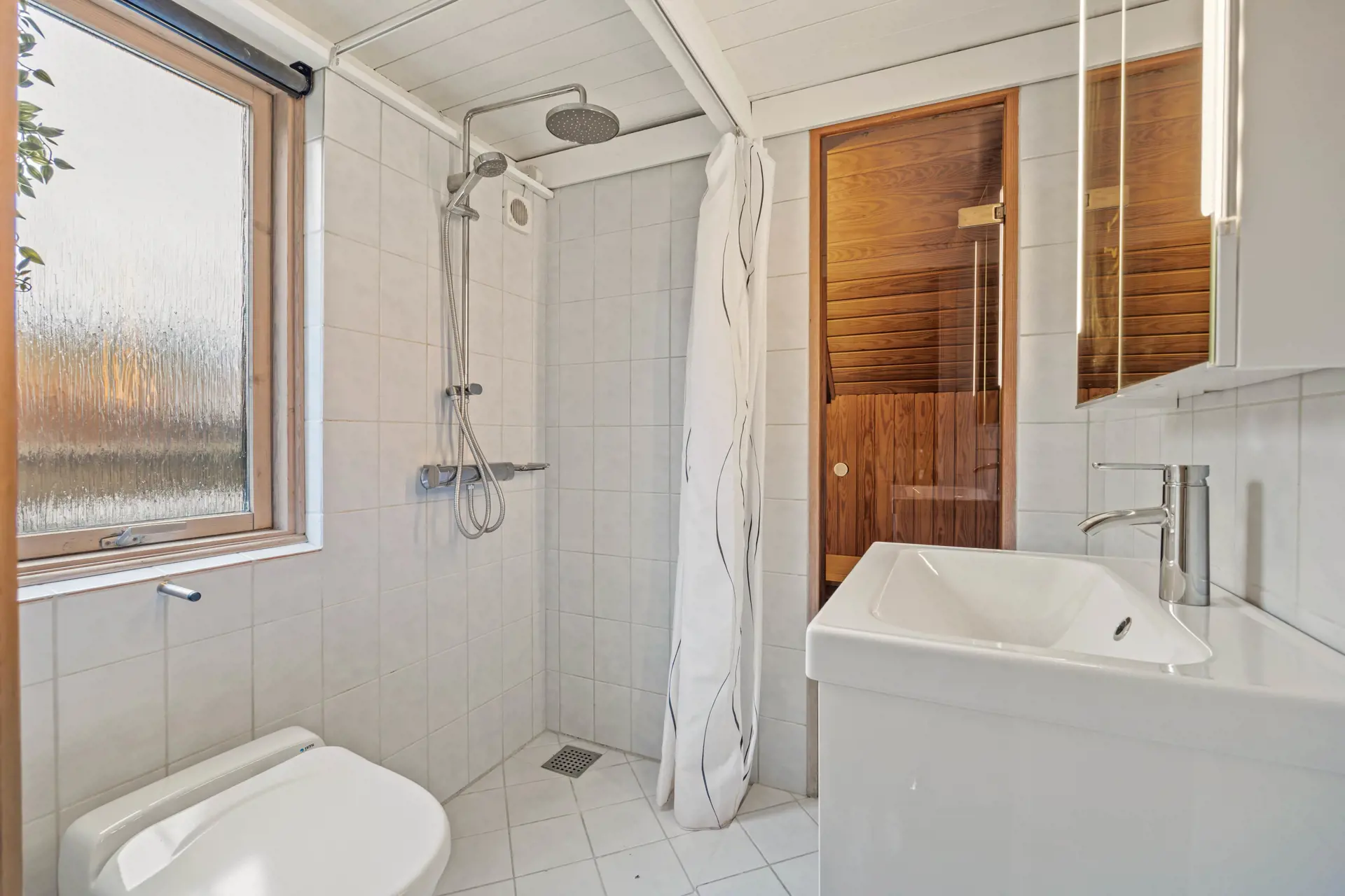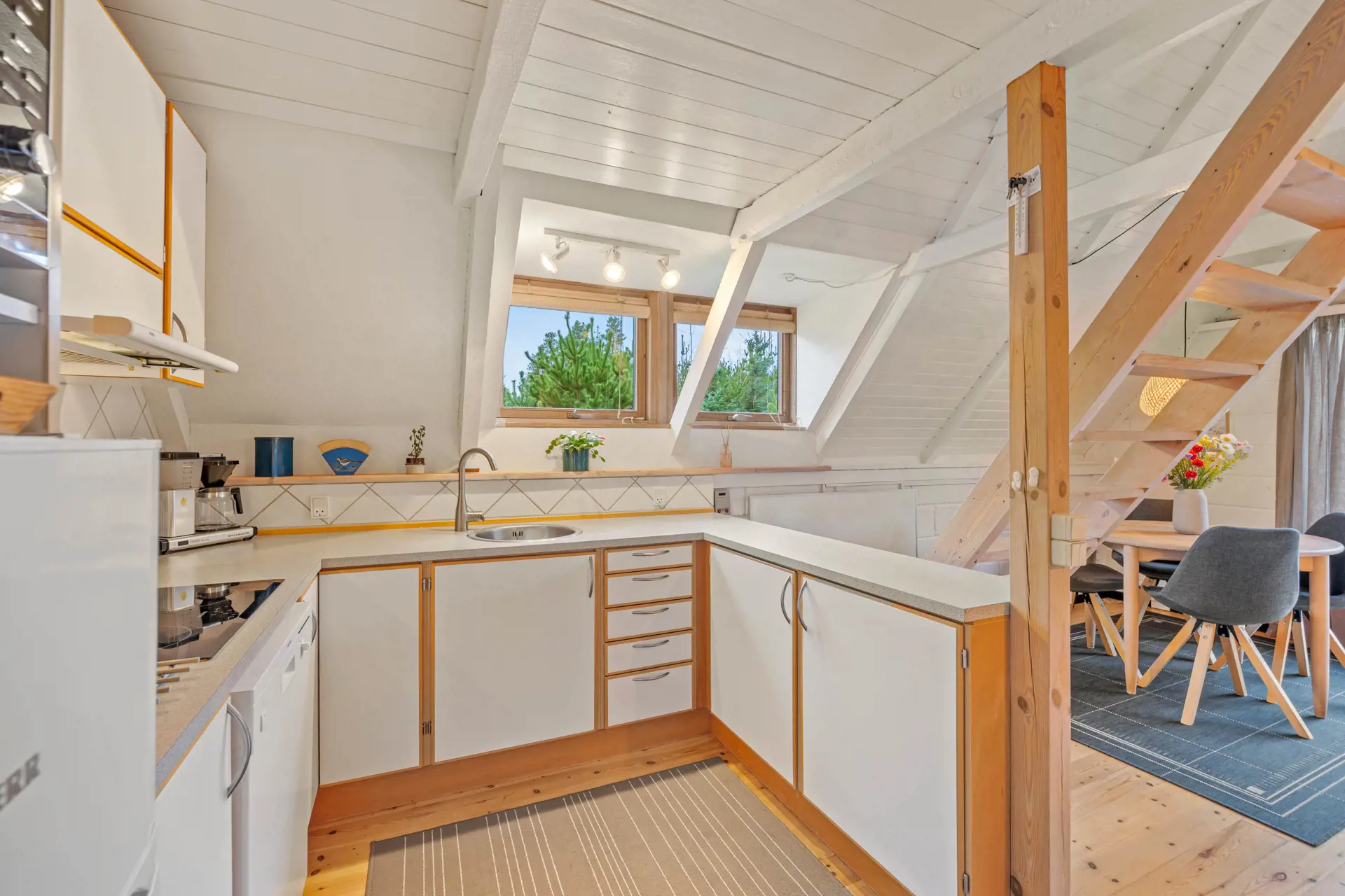 Die offene Küche ist mit einer Spülmaschine ausgestattet und erlaubt euch, leckere Mahlzeiten zuzubereiten. Ein kleines Duschbad mit Fußbodenheizung bietet Zugang zur Sauna. Hier könnt ihr den Alltagsstress hinter euch lassen. Im oberen Stockwerk befindet sich ein offenes Schlafzimmer mit einem Doppelbett, während das Erdgeschoss ein weiteres Schlafzimmer mit 2 Einzelbetten bietet. So könnt ihr euch gut aufteilen.