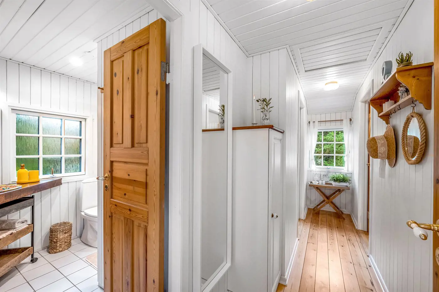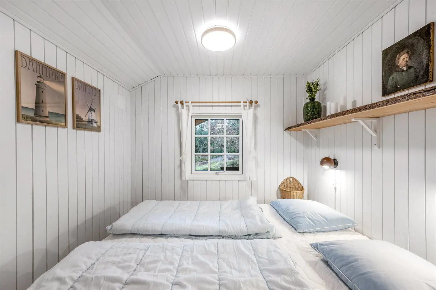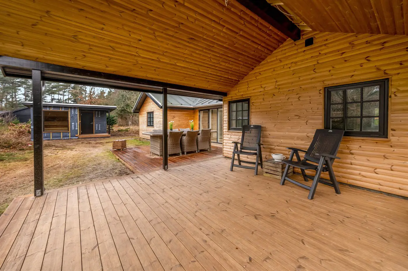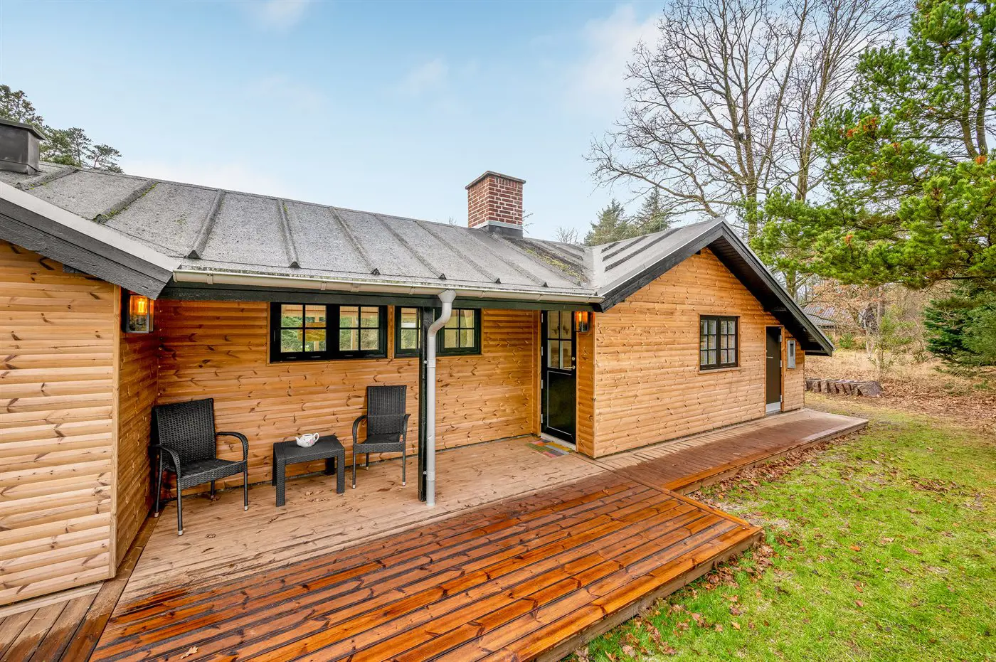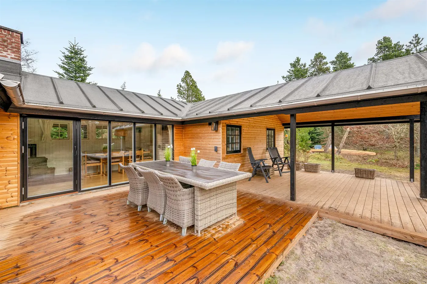 Im Inneren erwartet euch eine geschmackvolle und stilvolle Einrichtung mit einer entspannten, typisch dänischen Ferienhausatmosphäre. Die Küche ist gut ausgestattet und bietet genügend Platz, damit mehrere gemeinsam kochen und sich dabei unterhalten können. Der Küchenbereich ist offen mit dem gemütlichen Wohnzimmer verbunden. Hier findet ihr eine große Couch, auf der ihr bei einem guten Buch oder einem Film entspannen könnt. Im Essbereich könnt ihr den Kaminofen anzünden und durch die bodentiefen Fenster den herrlichen Blick in die Natur genießen – fast, als säßet ihr mitten im Grünen.