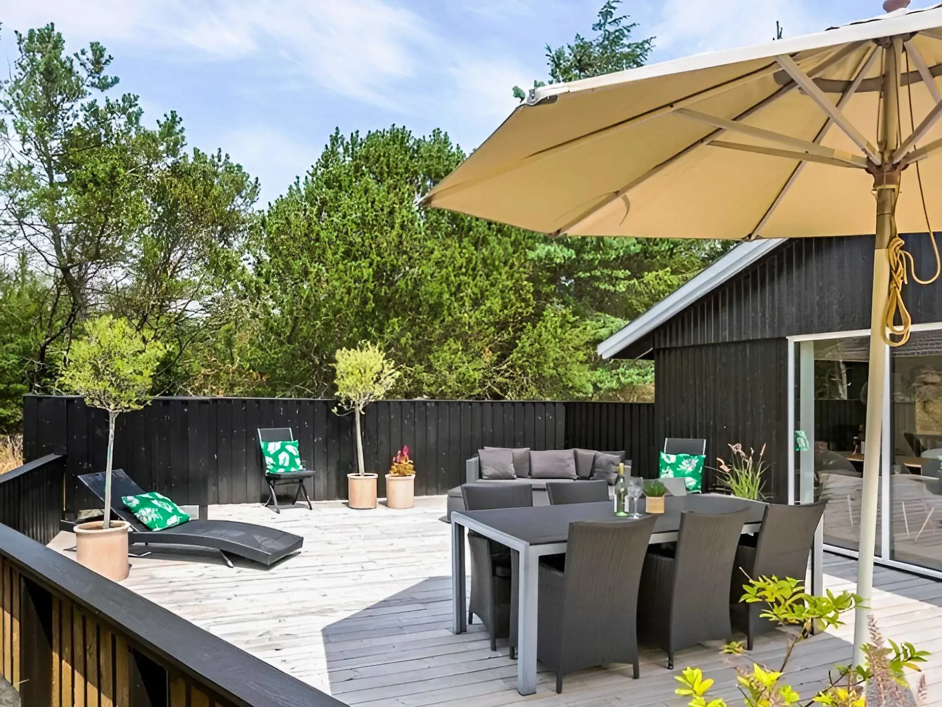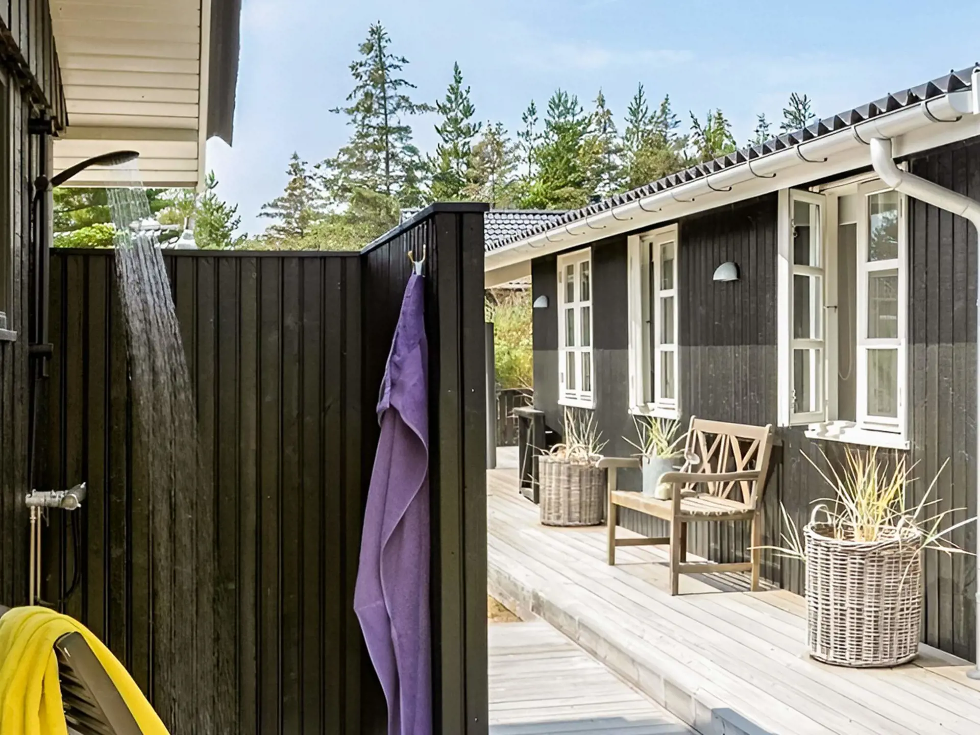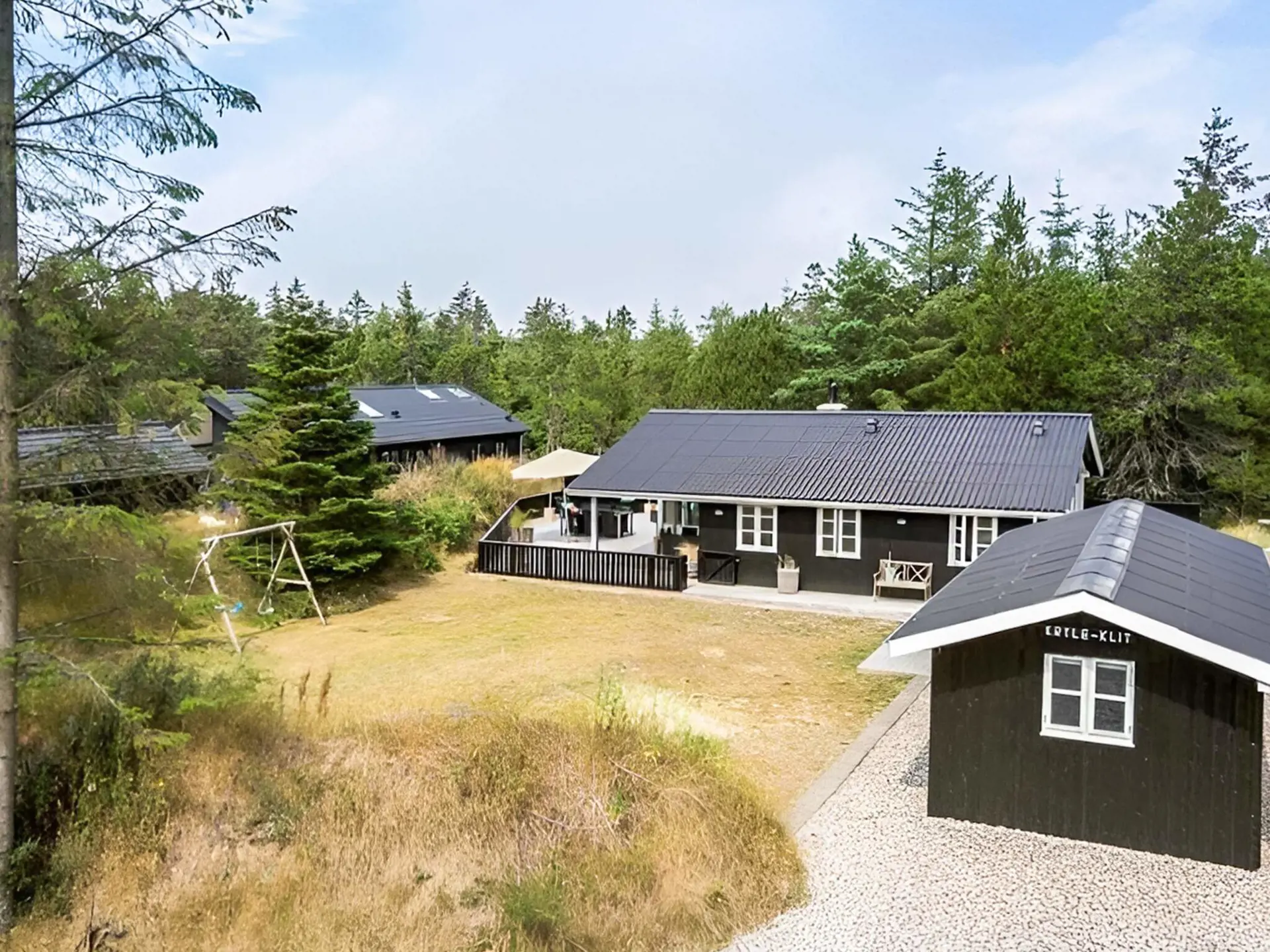 Der Außenbereich ist einzigartig. Mehrere schöne Terrassen laden dazu ein, die Sonne von morgens bis abends zu genießen, und die Außendusche ist nach einem Tag am Strand ideal. Das große, grüne Naturgrundstück lädt zum Spielen, Entspannen und Verweilen ein, und der überdachte Bereich ermöglicht gemütliche Übernachtungen unter freiem Himmel – besonders beliebt bei Kindern. Die Abende lassen sich bei einem Grillabend, in Ruhe und lauen Sommernächten ausklingen.