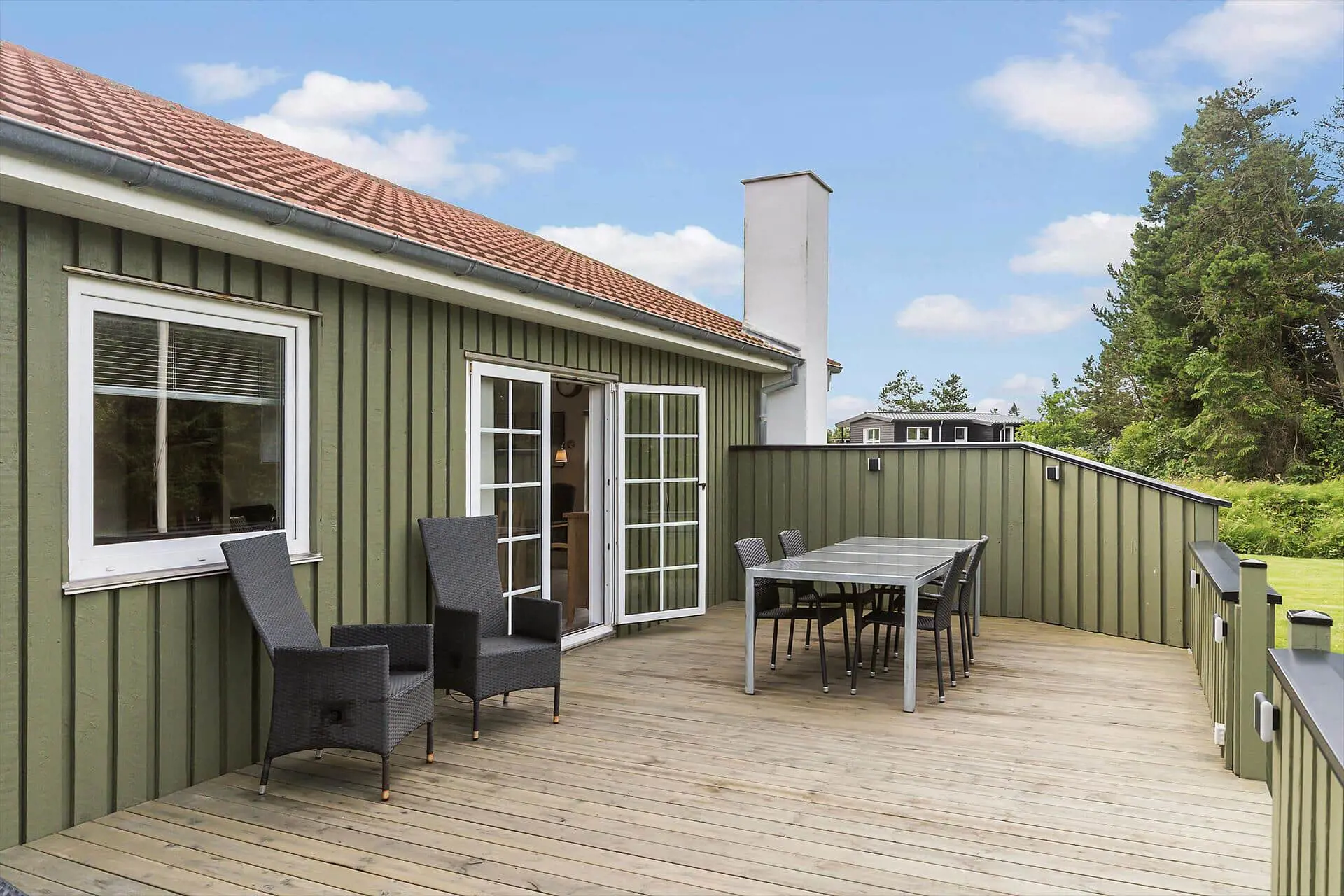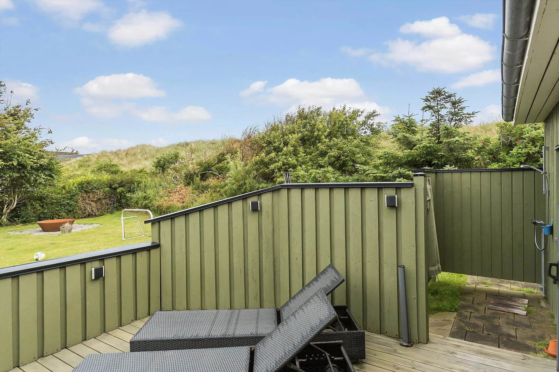 Die großen Terrassen des Ferienhauses, sowohl überdacht als auch offen, laden zu Entspannung in jeder Jahreszeit ein. Beginne den Tag mit deinem Morgenkaffee auf der überdachten Terrasse, wo du die ersten Sonnenstrahlen des Tages genießen kannst, geschützt vor dem Wind. Am Abend kannst du das Außenspa anheizen und die Wärme genießen, während die Sterne am Nachthimmel erscheinen. Die Terrassen sind so angelegt, dass ungestörte Bereiche geschaffen werden, sodass du in Ruhe entspannen kannst, obwohl das Haus in der Nähe der Stadt liegt. Das eingezäunte Grundstück ist außerdem ideal für Familien mit Hund, sodass auch dein vierbeiniger Freund die Freiheit sorgenfrei genießen kann. Der geräumige Garten bietet Platz zum Spielen und Entspannen, während der Duft von Grill und das Zwitschern der Vögel die perfekte Urlaubsstimmung schaffen.