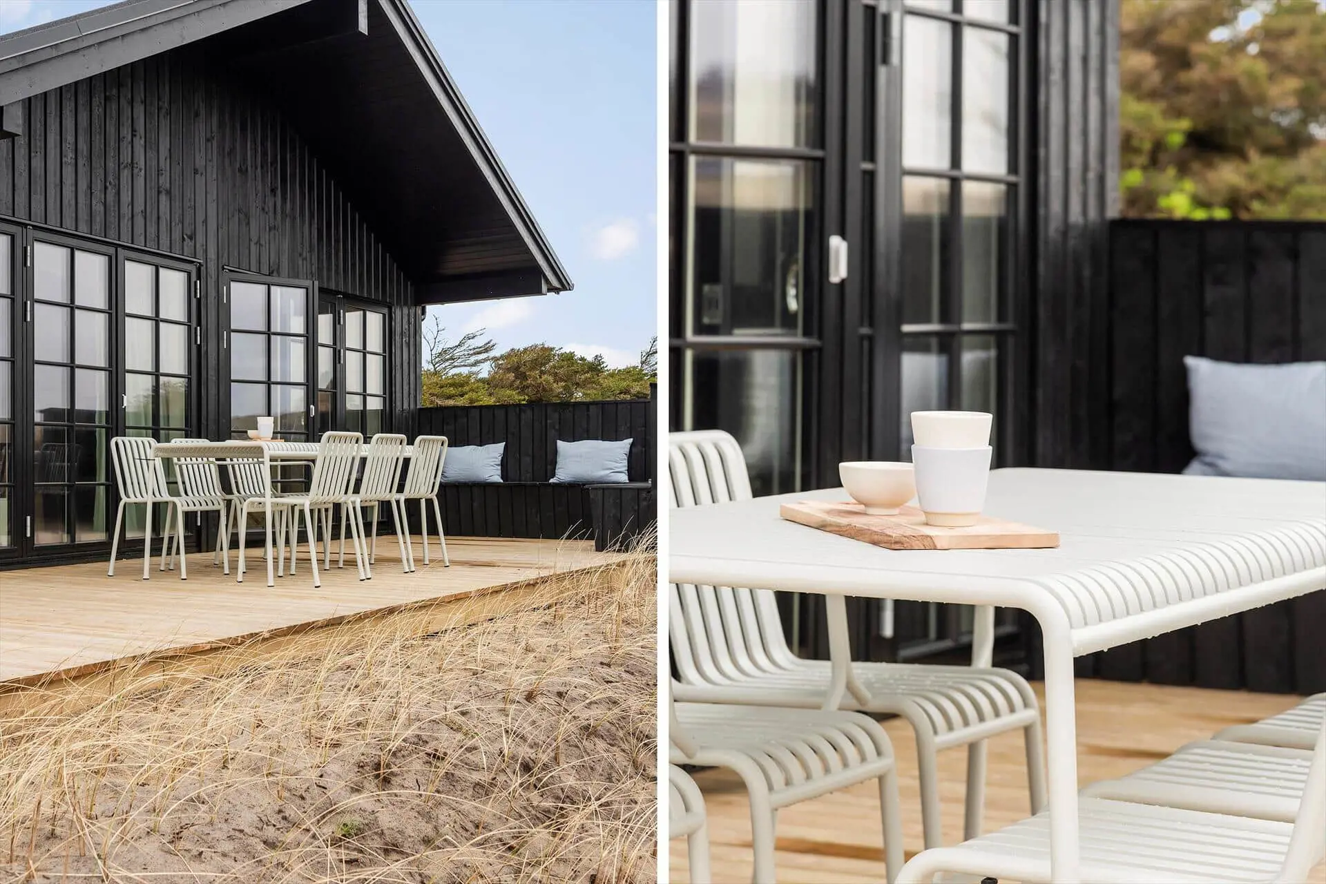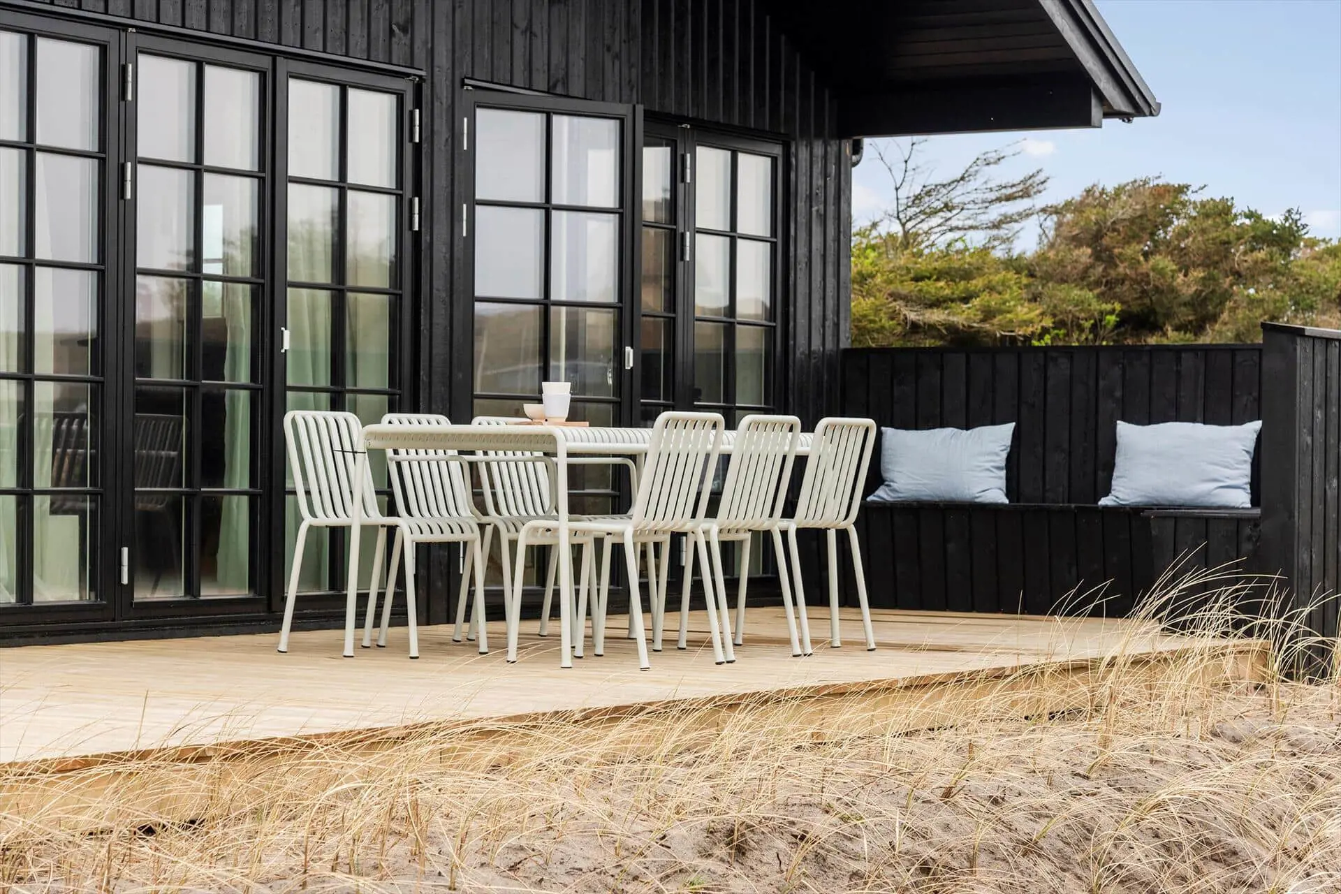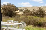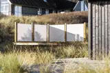 Unter freiem Himmel erfreuen Sie sich ebenfalls an bester Ferienhausstimmung. Das Haus liegt auf einem hügeligen Naturgrundstück mit einem tollen Terrassenareal. Vom Wohnraum und von einem der Schlafräume aus treten Sie durch französische Flügeltüren hinaus in die Sonne und an die frische Seeluft. Gartenmöbel, Liegestühle, ein Grill und ein Sonnenschirm stehen für Sie bereit. Gleiches gilt für eine Außendusche, die Ihnen nach einem Abstecher an den Strand den Sand und das Salz des Meeres von der Haut spült. Eine Lademöglichkeit für E-Autos ist verfügbar.