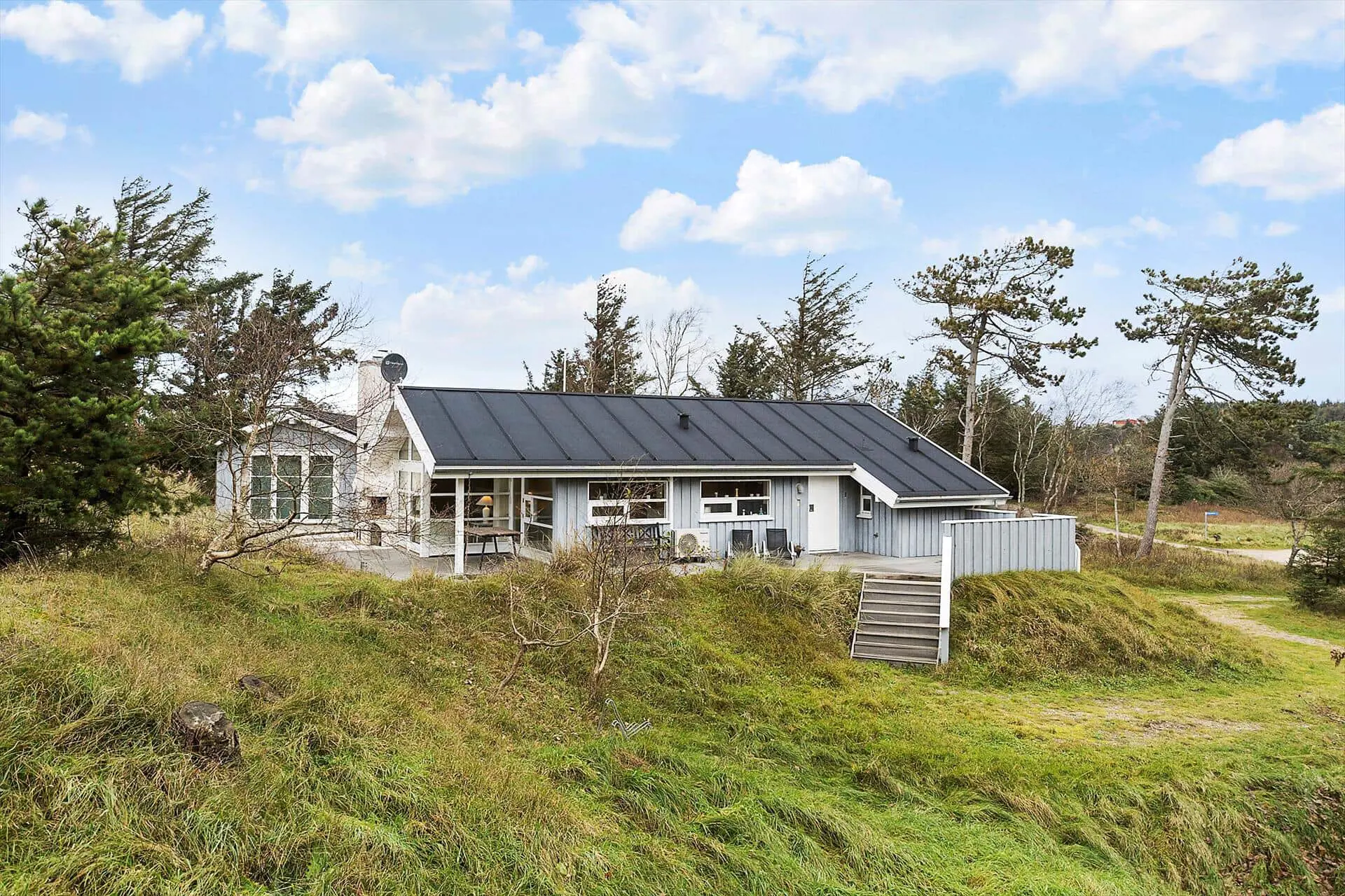 Rund um das hoch auch dem hügeligen Naturgrundstück gelegene Ferienhaus erstreckt sich ein schönes Terrassenareal. Eine Treppe führt von der Grundstückseinfahrt hinauf zum Haus. Die erhöhte Platzierung bedingt, dass Sie auf einem Terrassenbereich mit einem schönen Ausblick auf die Inlandserhebung Lien und die naturbelassene Landschaft verwöhnt werden. Falls Sie guten Windschutz der schönen Aussicht vorziehen, machen Sie es sich auf der Westterrasse gemütlich, die durch die mit Strandhafer bewachsenen Dünen gut abgeschirmt wird. Die gen Westen weisende Terrasse bietet darüber hinaus einen überdachten Bereich und einen Außenkamin. Gemütlichen Sommerabenden, selbst nach Einbruch der Dunkelheit, steht somit nichts im Wege.