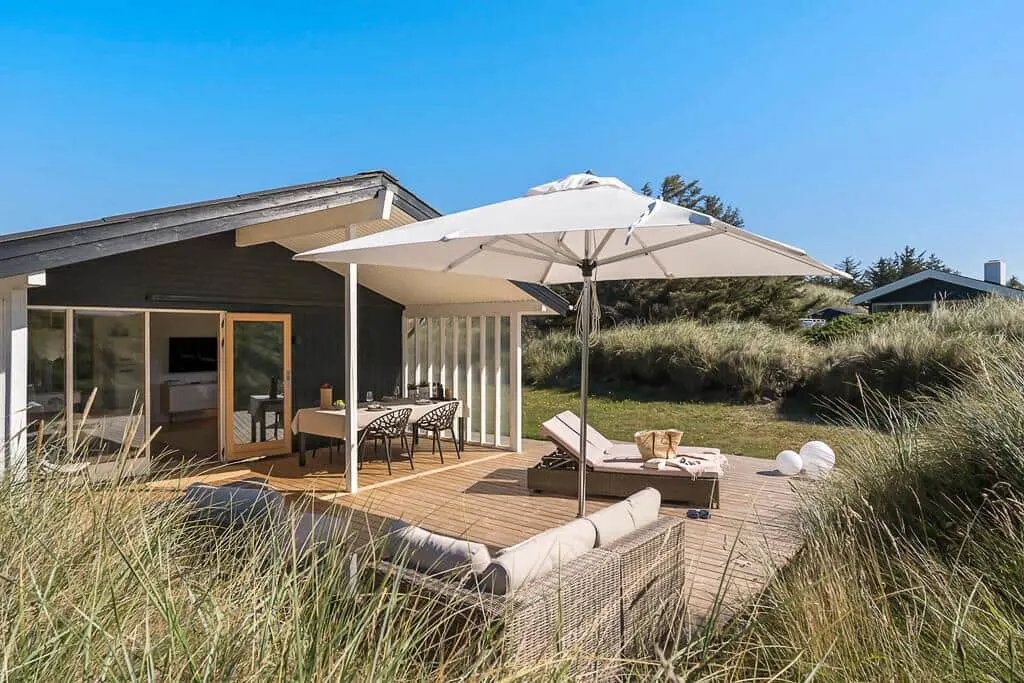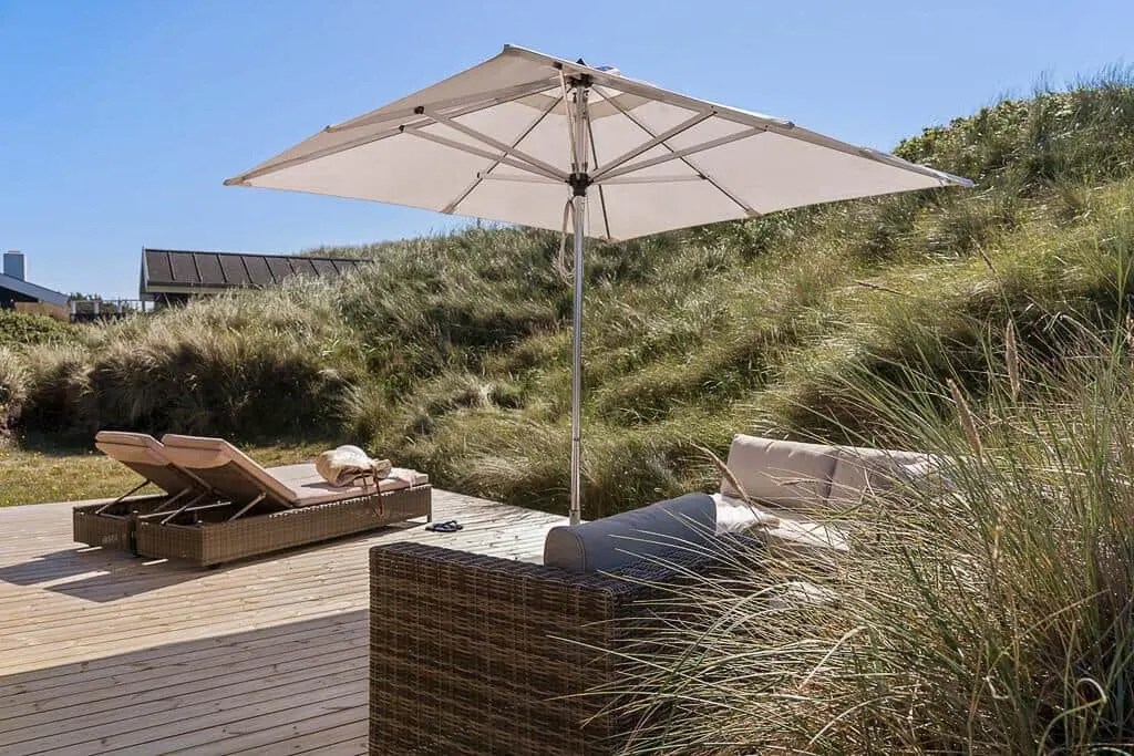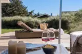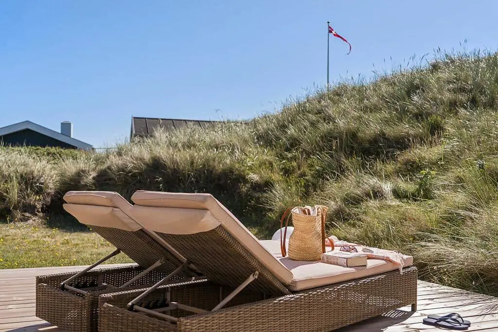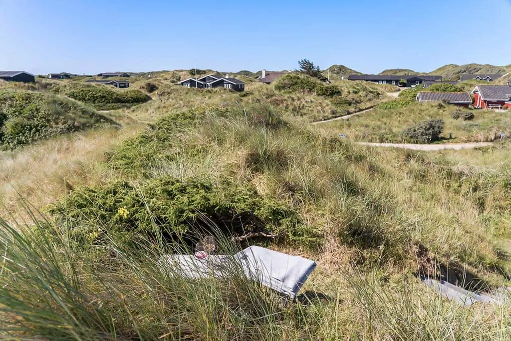 Rund um das Haus erstrecken sich Terrassen und eine Grasfläche. Der Rest des 3.000 m² großen Grundstücks ist der Natur überlassen und verzückt mit Dünen, wogendem Strandhafer und Krüppelkiefern. Die Dünen schirmen Ihr Grundstück gut ab, sodass Sie stets einen schönen Aufenthaltsort finden werden, an dem Sie sich völlig ungestört sonnen oder gemeinsam grillen können. Ein Teil der Terrassenanlage ist überdacht.