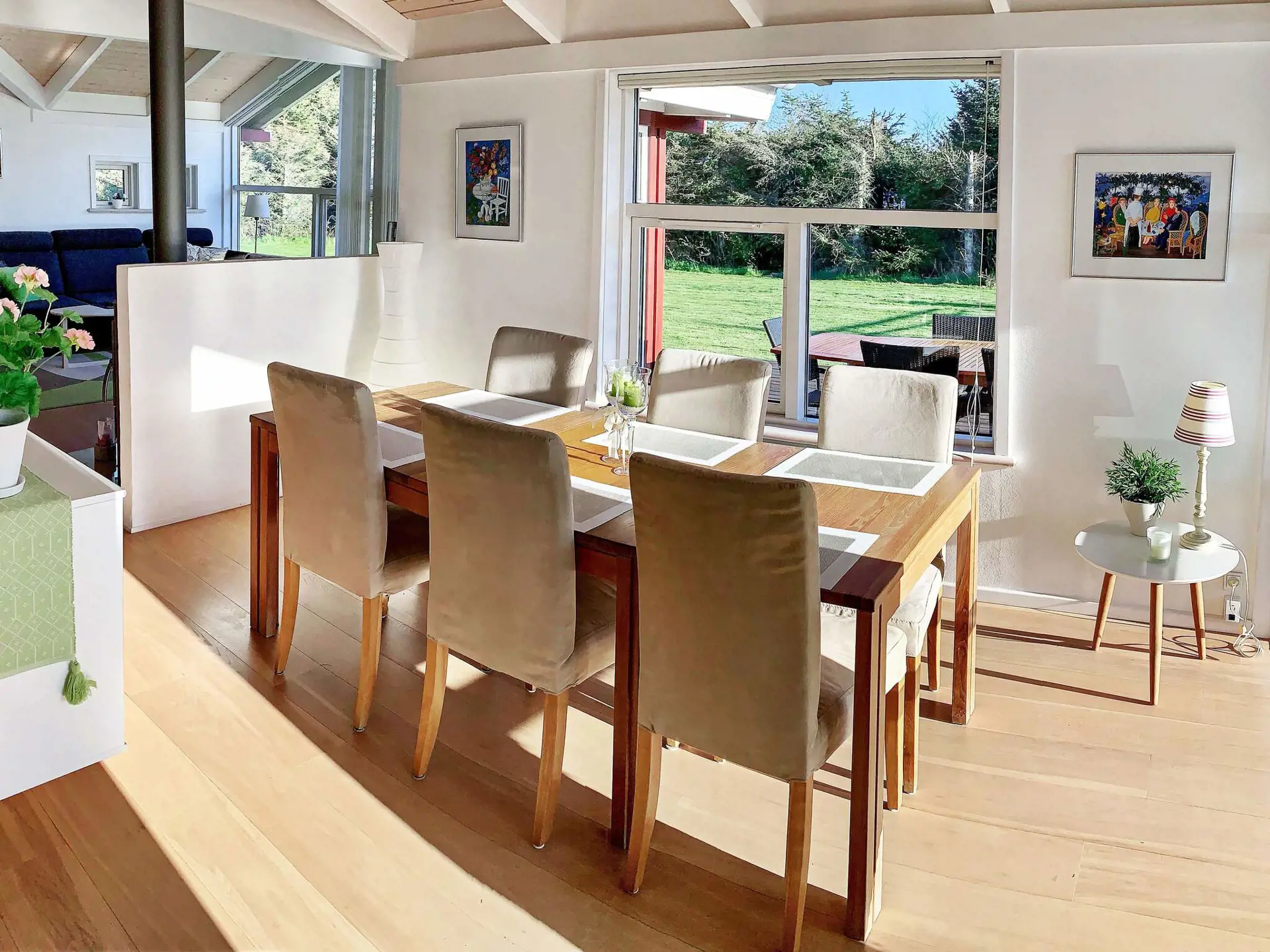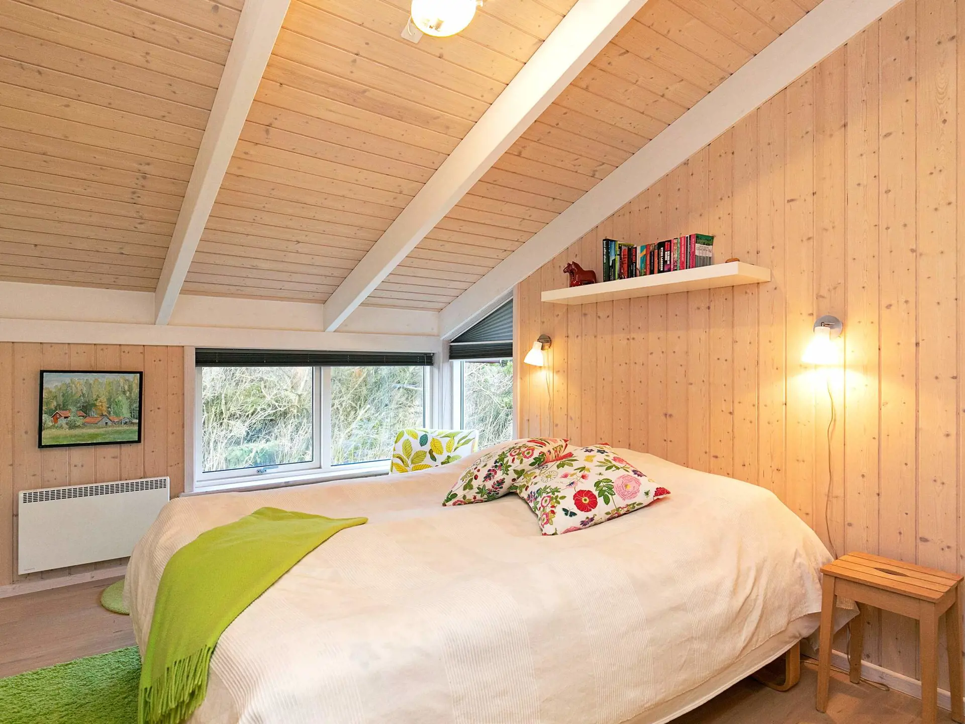 Das Ferienhaus ist modern und wohnlich eingerichtet und hat sowohl eine Sauna als auch eine schöne Sonnenterrasse im Außenbereich. Im Wohnzimmer große Fensterfront mit viel Tageslicht und zugleich schönem Ausblick in die Umgebung. Die offene Zimmerdecke bis zum First sorgt zudem für ein besonders luftiges Ambiente im Raum. Die offen integrierte Küche ist gut ausgestattet, zudem gibt es einen Essebereich mit direktem Zugang zur überdachten Terrasse davor. Außerdem vier große Schlafzimmer im Haus mit viel Staufläche sowie zwei Badezimmer, eines davon mit Sauna.