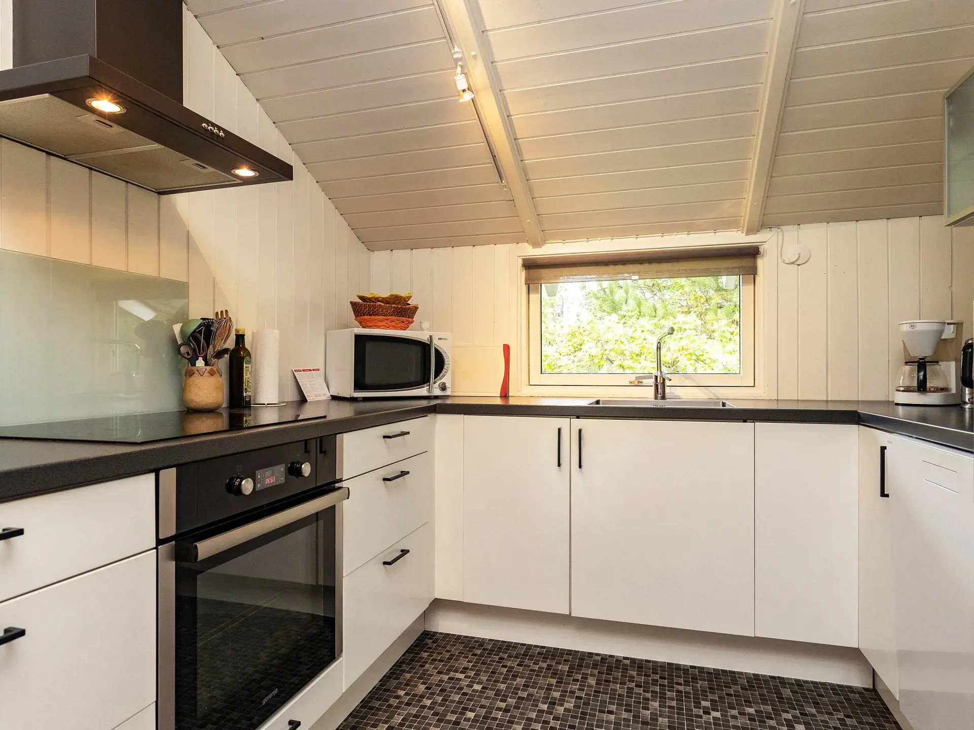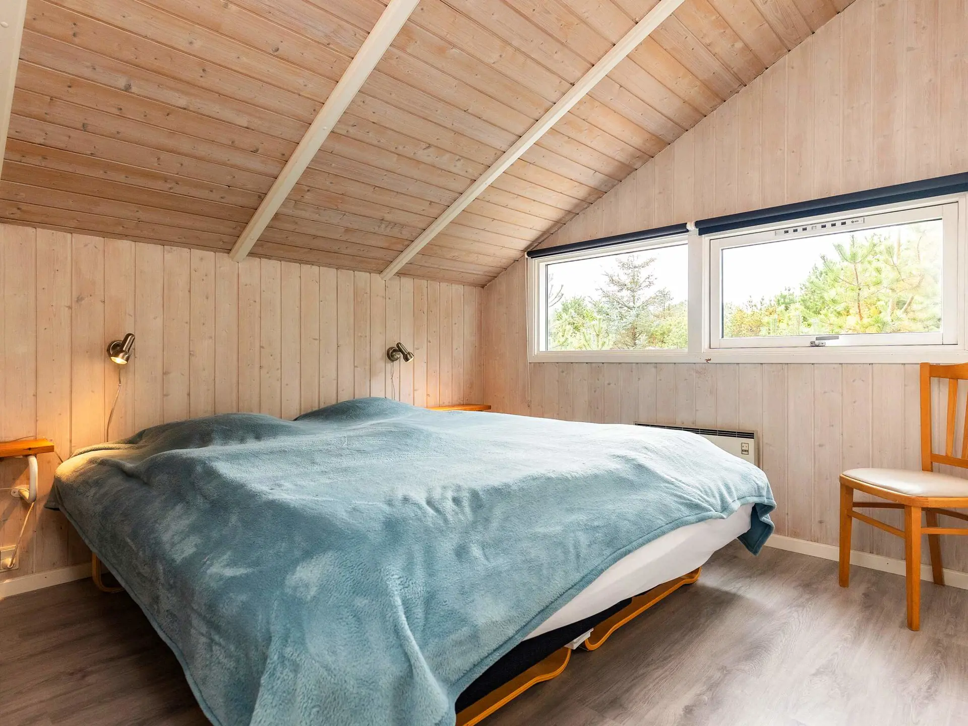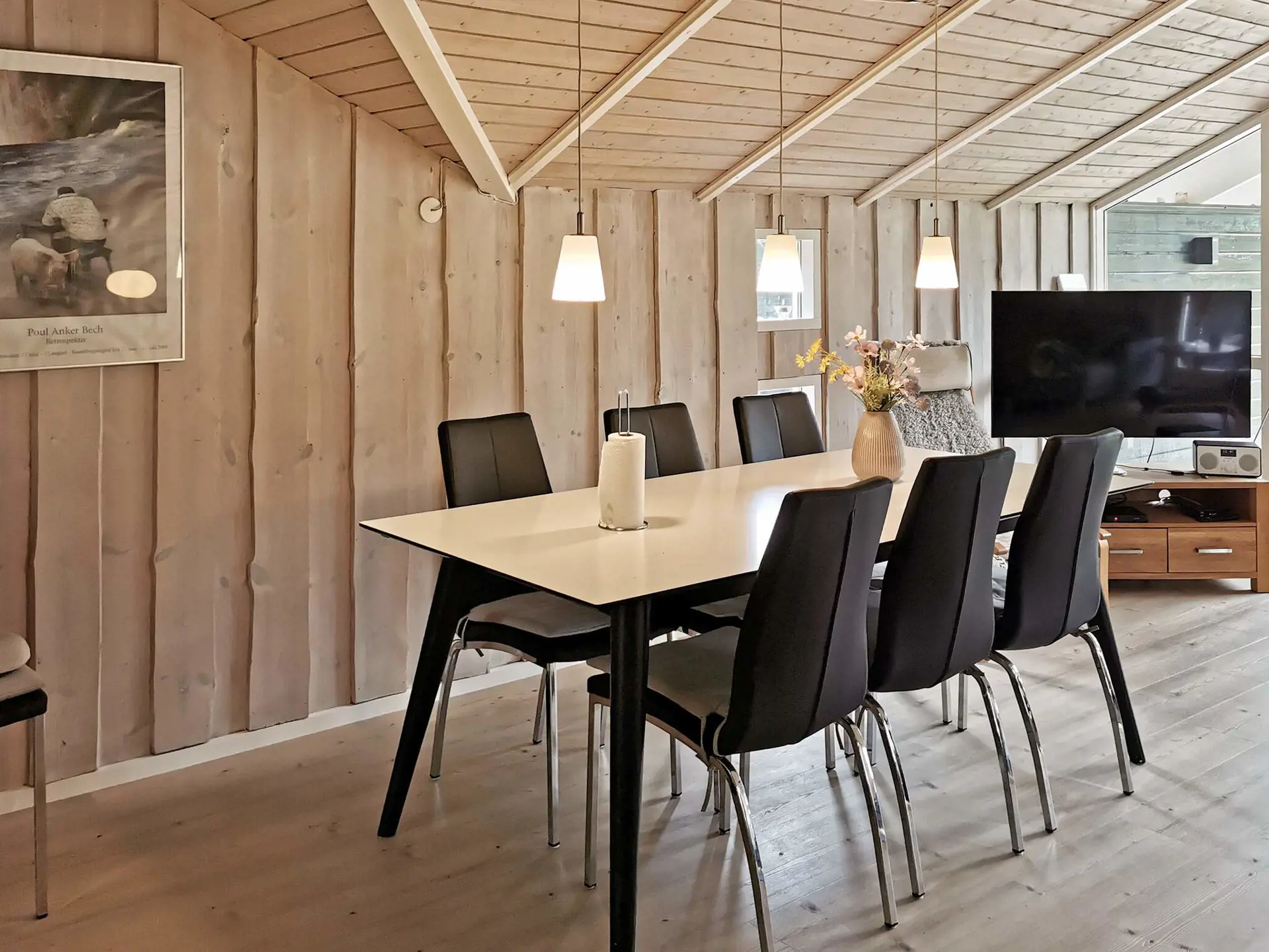 mit zwei Familien reist. Die Einrichtung ist geschmackvoll und modern im dänischen Ferienhausstil gehalten. Vor allem im hellen und geräumigen Wohnzimmer wurde besonderer Wert auf Gemütlichkeit gelegt. Ein Holzofen sorgt dabei für wohlige Wärme. Ein Teil der großen Terrasse ist überdacht. Hier finden Sie immer einen schönen Platz zum Entspannen im Freien. Das Naturgrundstück ist eben, mit flacher Bepflanzung und Schaukel sowie Sandkasten für Kinder.