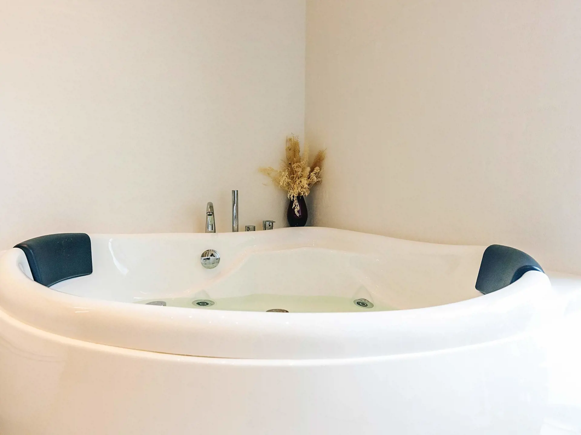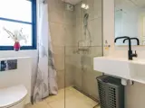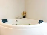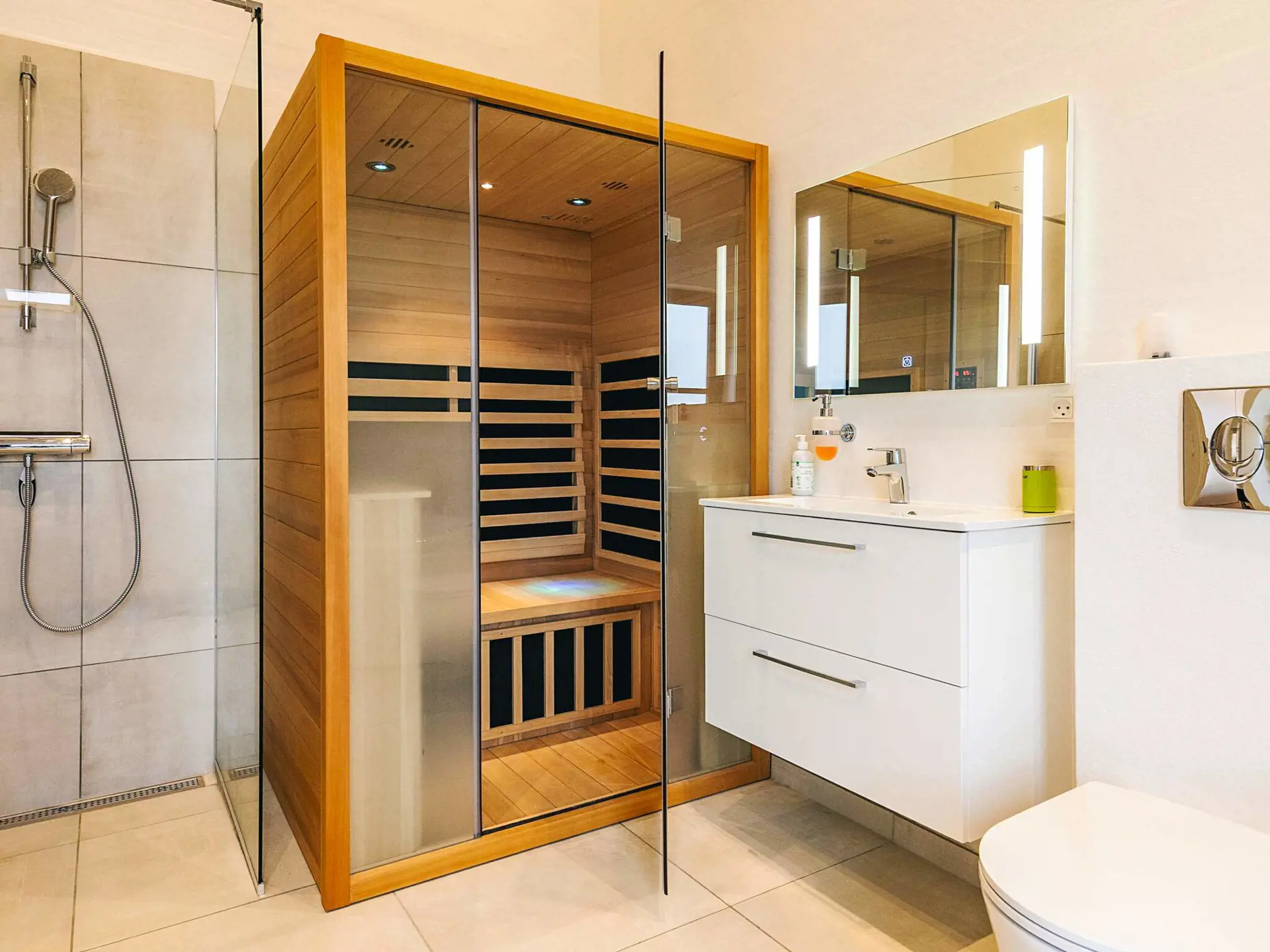 Es gibt zwei Badezimmer mit Duschen und Toilette sowie Fußbodenheizung. Entspannung ist in der Sauna möglich. Außerdem steht sowohl im Innen- als auch im Außenbereich ein Whirlpool zur Verfügung.