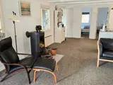 Das Ferienhaus bietet einen gemütlichen und offenen Wohnbereich, in dem Küche und Wohnzimmer miteinander verbunden sind. Der ehemalige Wintergarten dient nun als Esszimmer mit einem Essbereich für acht Personen – ideal für lange Abendessen und gemütliche Spieleabende. Ein Kaminofen sorgt für behagliche Wärme. Neben dem Holzofen sorgt eine Luft-Luft-Wärmepumpe für geringen Stromverbrauch.