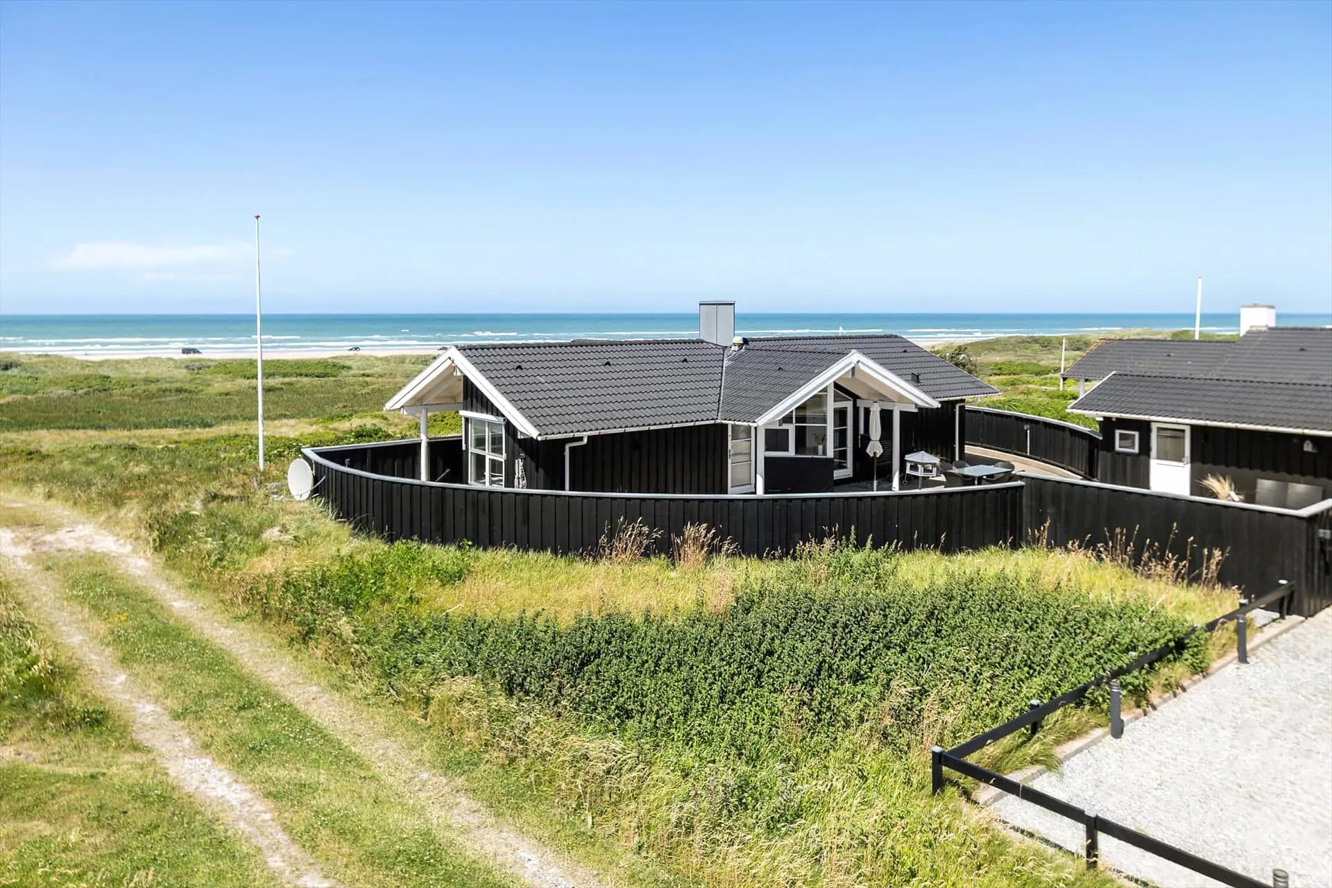 Das Ferienhaus liegt völlig ungestört, aber dennoch in der Nähe des Zugangs zum Grønhøj Strand, einem der schönsten Strände in der gesamten Jammerbugt. Im Westen gibt es eine große Außenterrasse, auf der Sie den wunderschönen Meerblick den ganzen Tag genießen können, und außerdem gibt es eine große, geräumige Terrasse nach Osten, die zu 100 % abgeteilt ist und somit Privatsphäre garantiert.