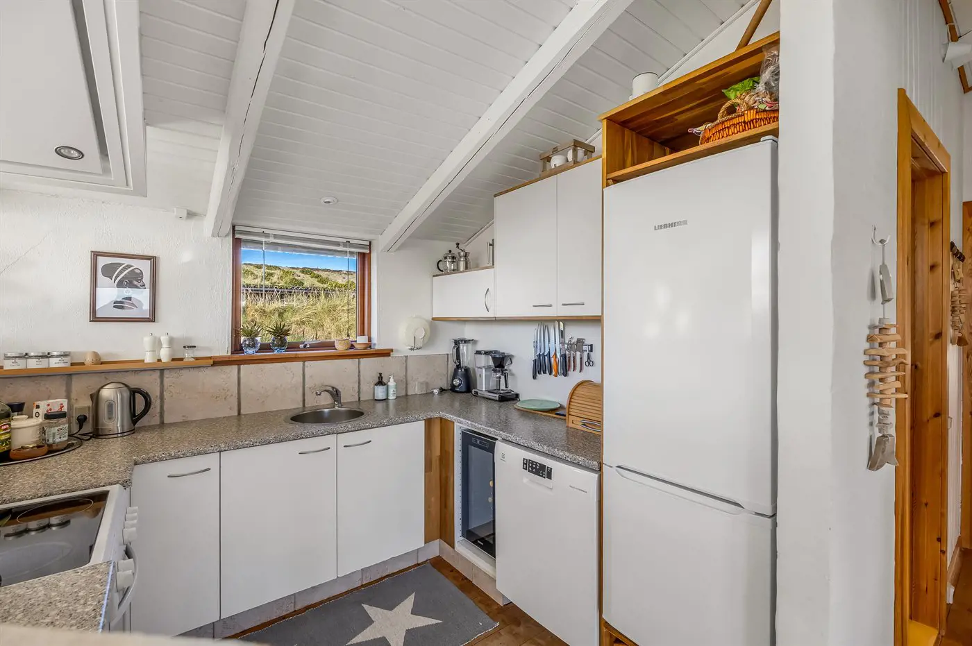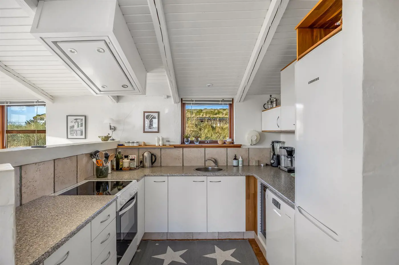Die Küche ist mit Kühlschrank ausgestattet. Außerdem gibt es 4 Keramik-Kochfelder, Umluftofen sowie Geschirrspüler.