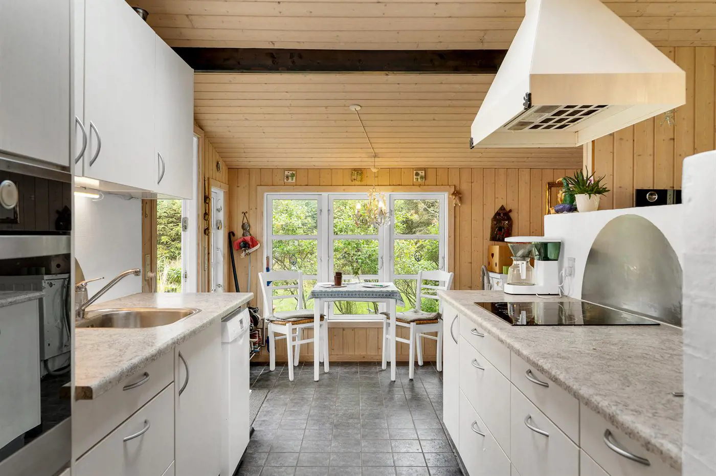 Die Küche ist mit Kühlschrank ausgestattet. Außerdem gibt es 4 Induktions-Kochzonen, Umluftofen, Mikrowelle sowie Geschirrspüler.