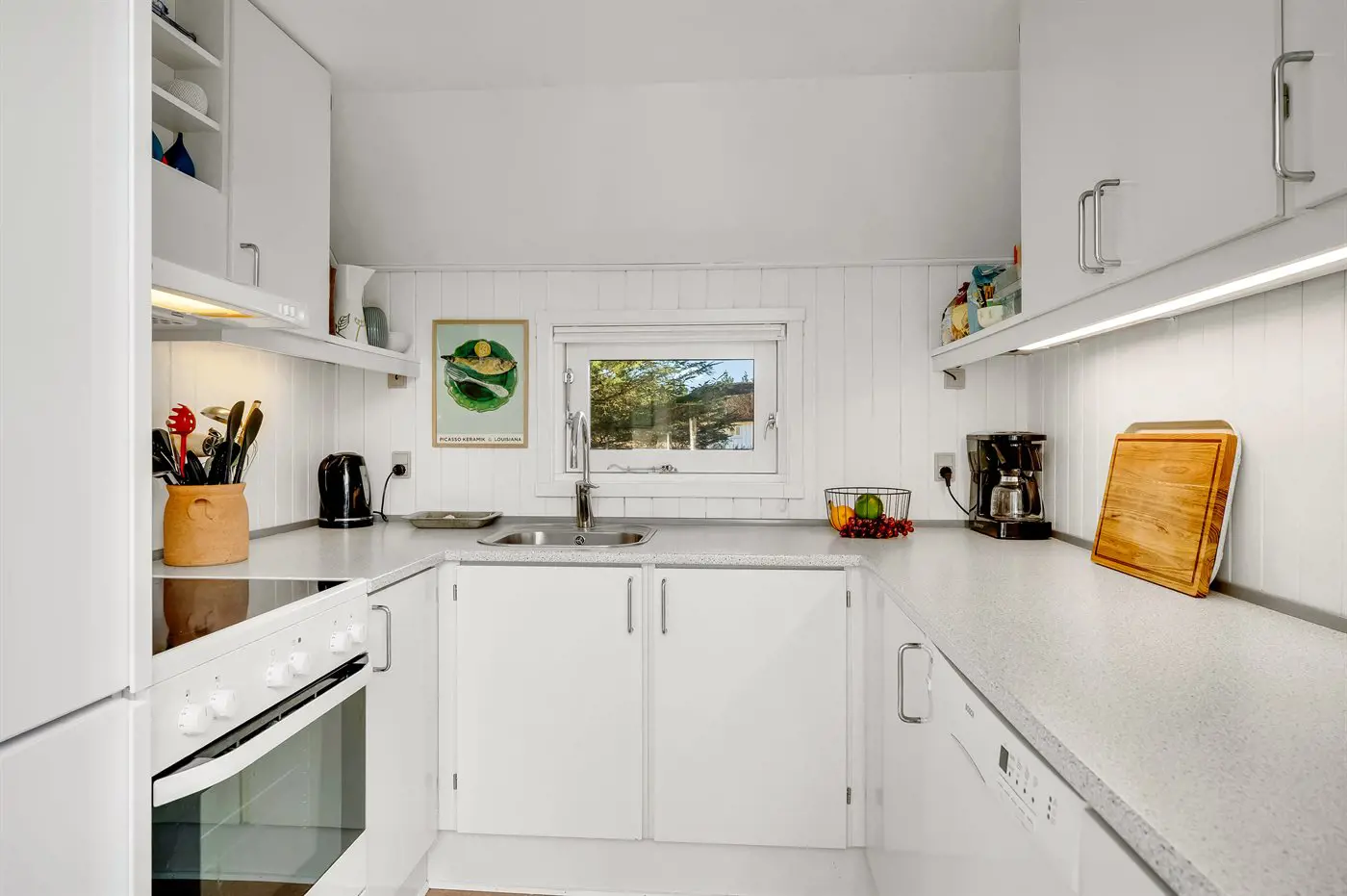Die Küche ist mit Kühlschrank ausgestattet. Außerdem gibt es 4 Keramik-Kochfelder, Umluftofen, Mikrowelle sowie Geschirrspüler.